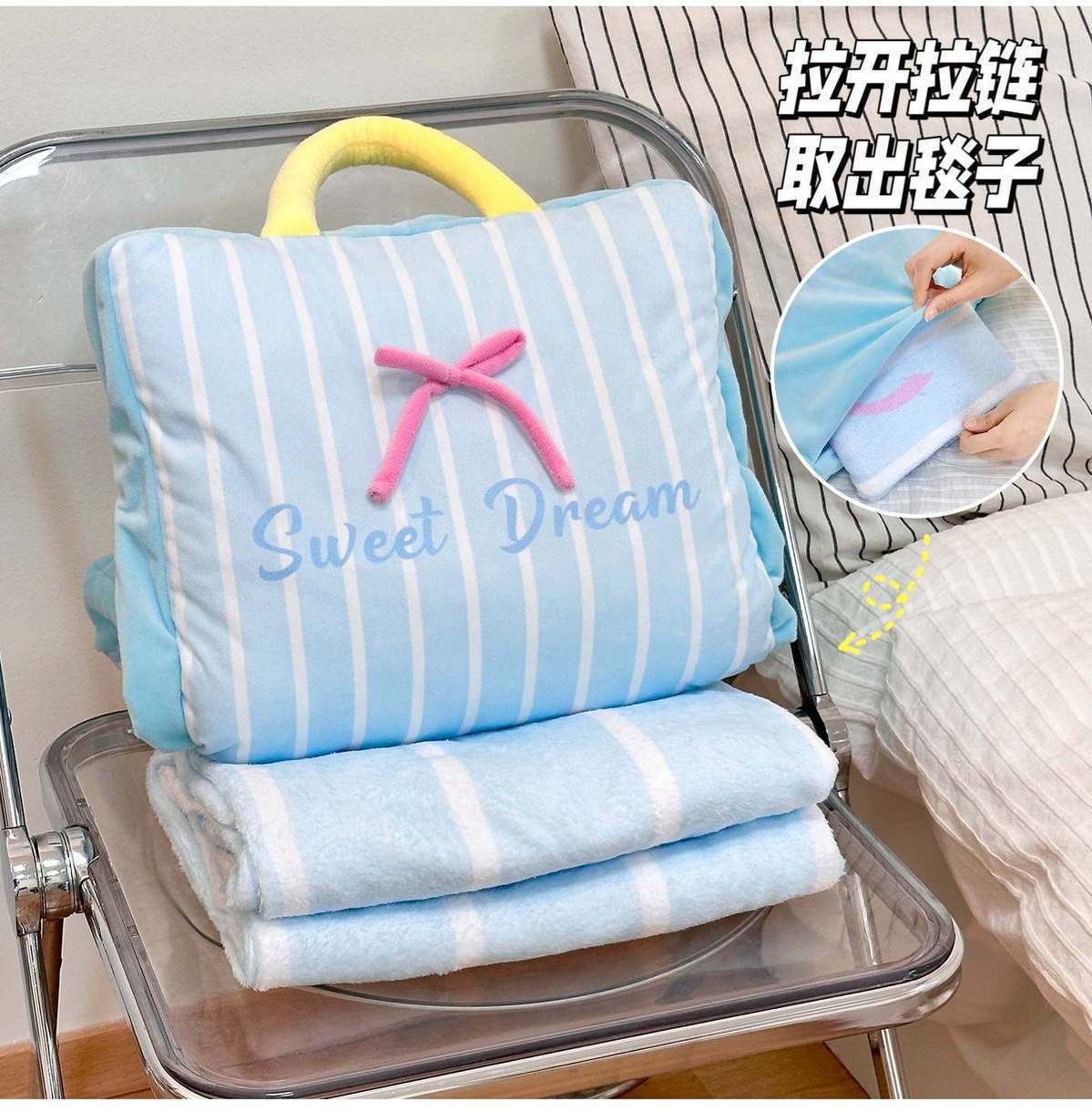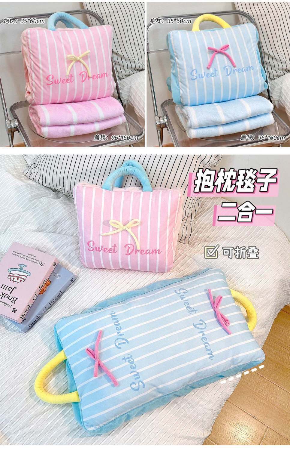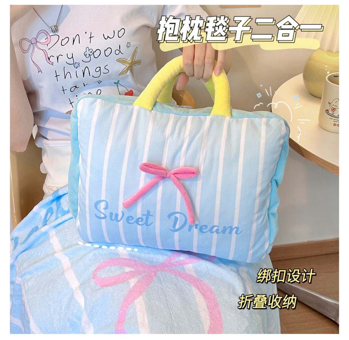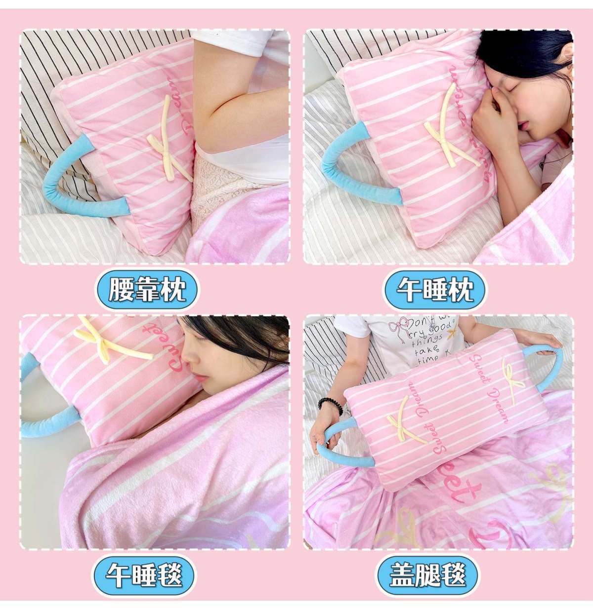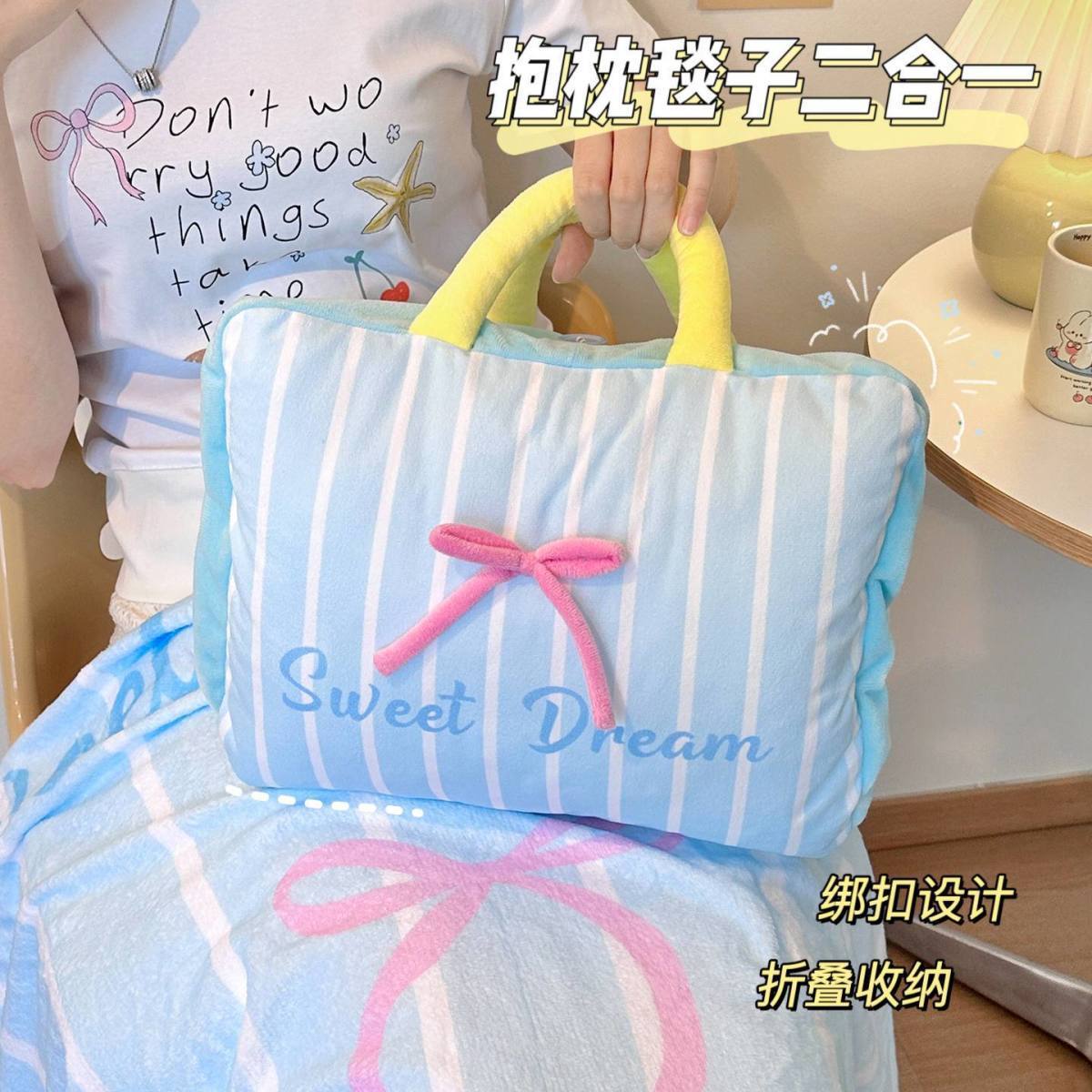 【Pink】Bow Stripe Throw Pillow Blanket, 【Blue】Bow Stripe Throw Pillow Blanket
