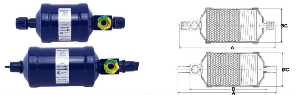 Desecante de filtro tipo tubo con mirilla serie SEG: Desecante de filtro tipo tubo con mirilla serie SEG, una mirilla está soldada directamente a la salida del filtro. Este filtro utiliza tamiz molecular 3A, que puede absorber eficazmente humedad, refrigerantes CFC.HCFC y HFC. El medio filtrante puede separar impurezas tan pequeñas como 10 micras del refrigerante para evitar la obstrucción de la tubería de la boquilla. Este dispositivo combinado reduce el área de soldadura, ahorra tiempo y reduce las posibles fugas. Permite a los técnicos observar el estado del refrigerante en el sistema, ayuda a identificar si hay un flujo de aire deficiente a través de las líneas del condensador en el sistema de suministro de energía y puede evitar fenómenos de burbujas de refrigerante causados por caídas de presión anormales. La mirilla tiene un indicador incorporado, que proporciona indicadores verde y amarillo fácilmente distinguibles para monitorear el contenido de humedad en el refrigerante e indicar si se necesita servicio.