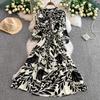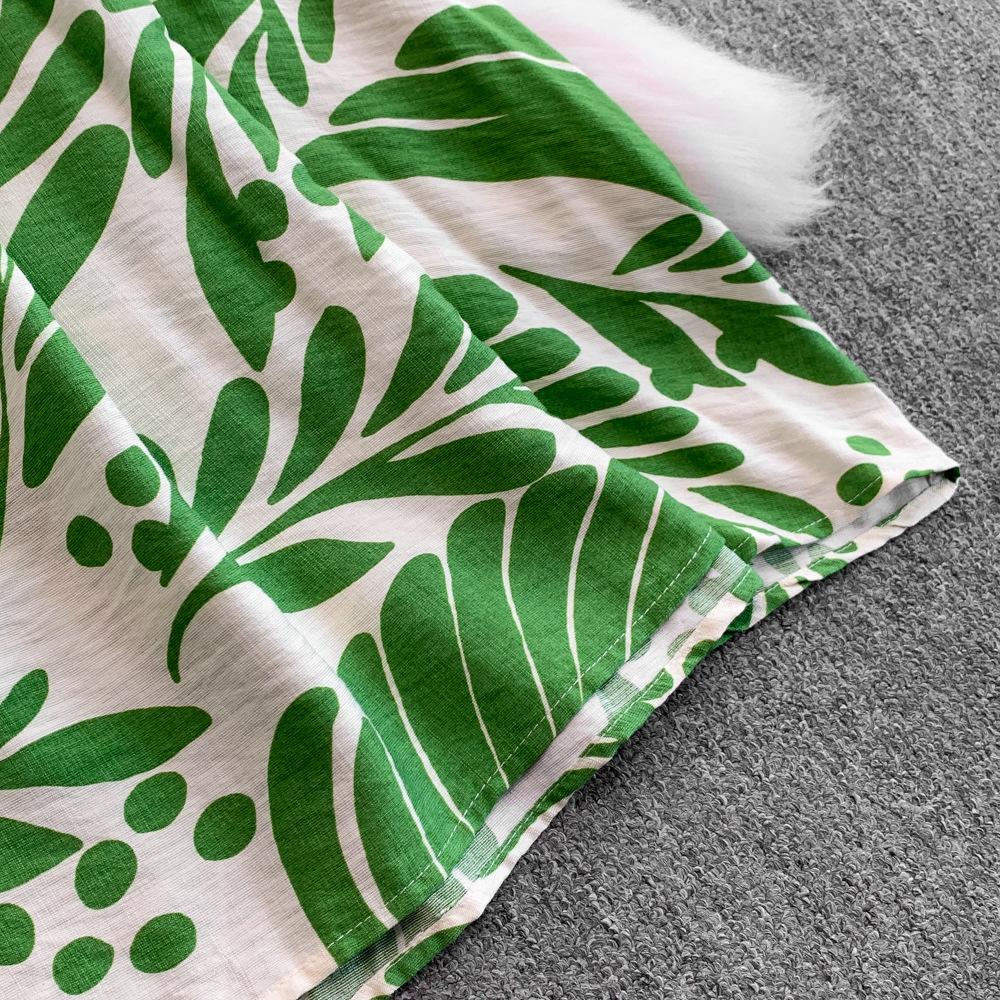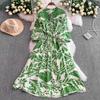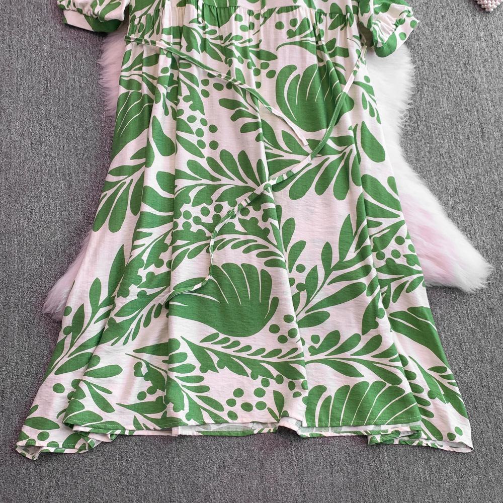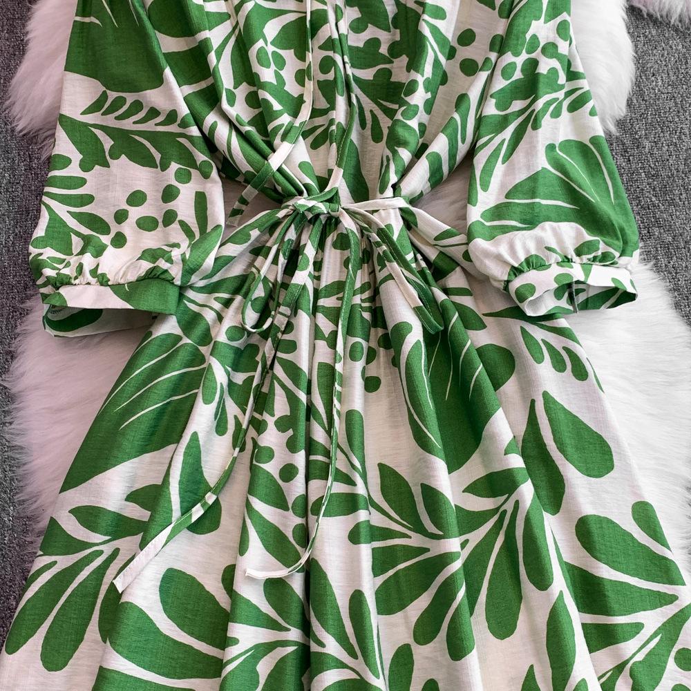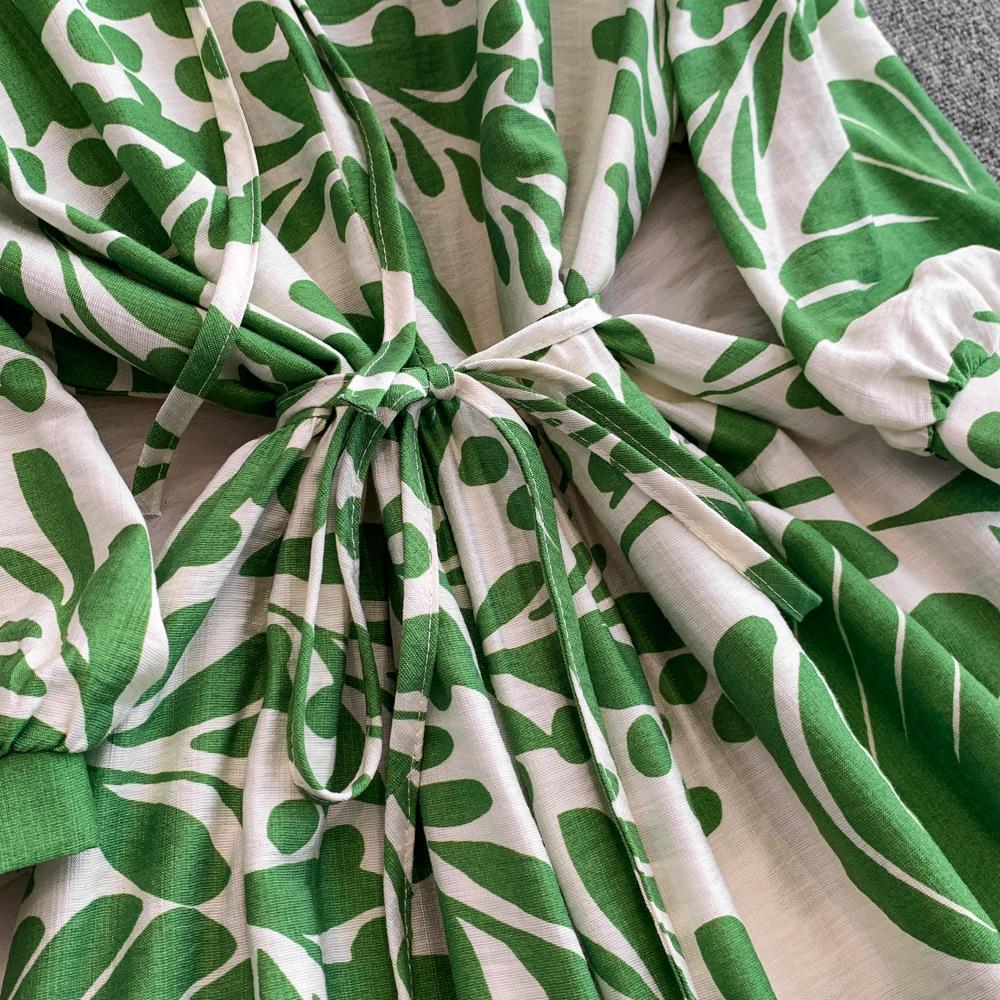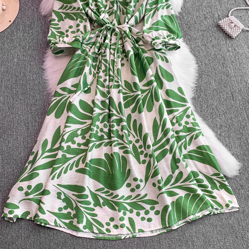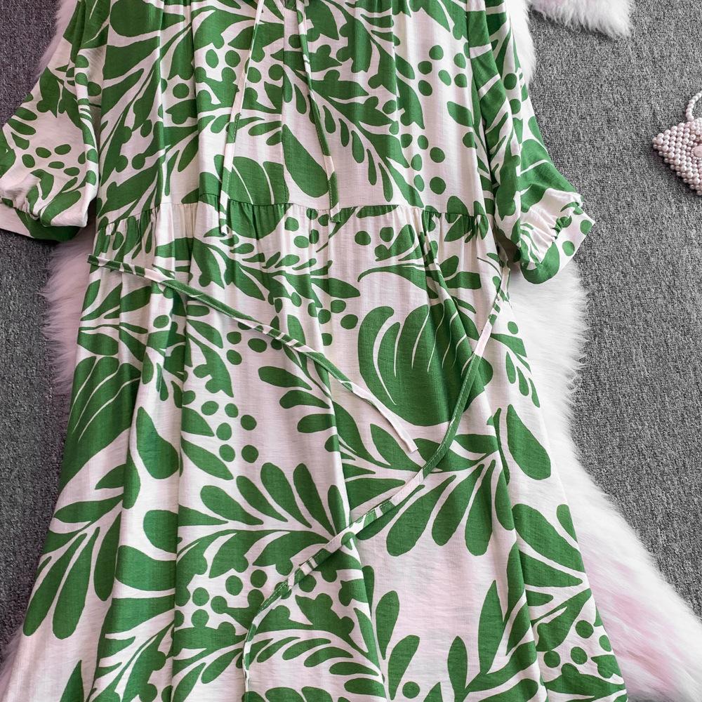 Vestido Francés para Mujer 2025 Verano Nuevo Cuello Redondo Manga Linterna Cintura con Cordones Adelgazante Plisado Línea A Falda Larga