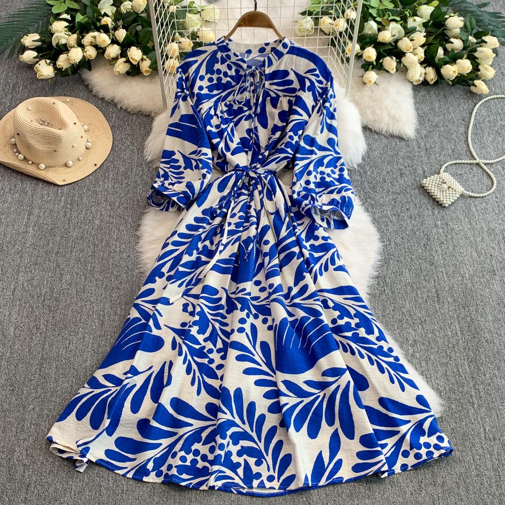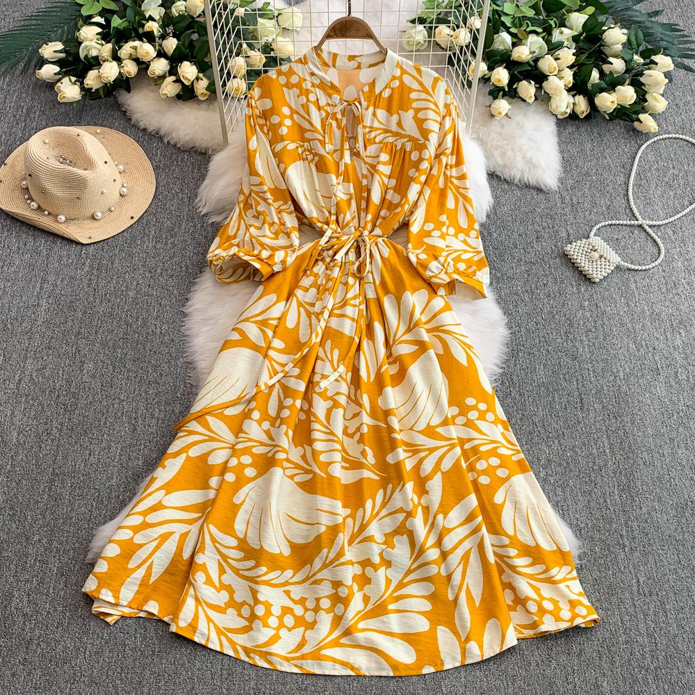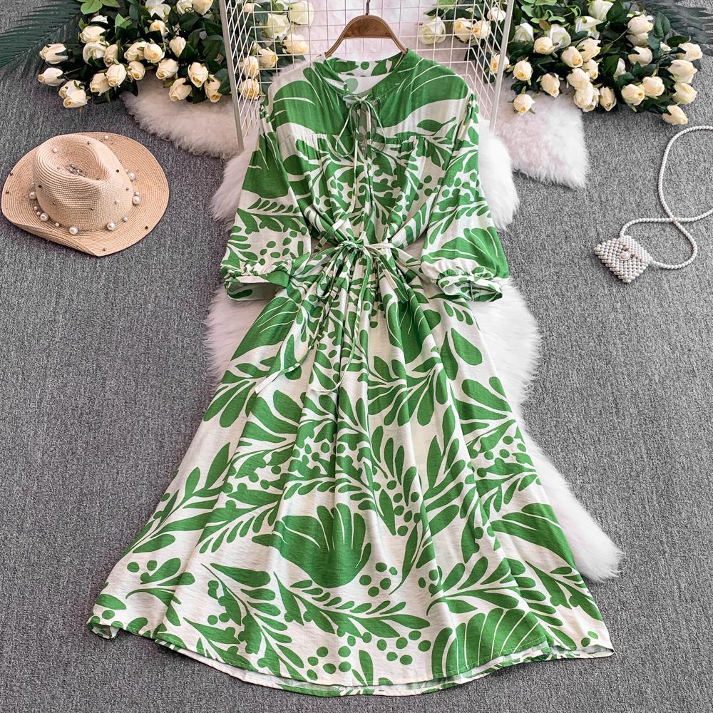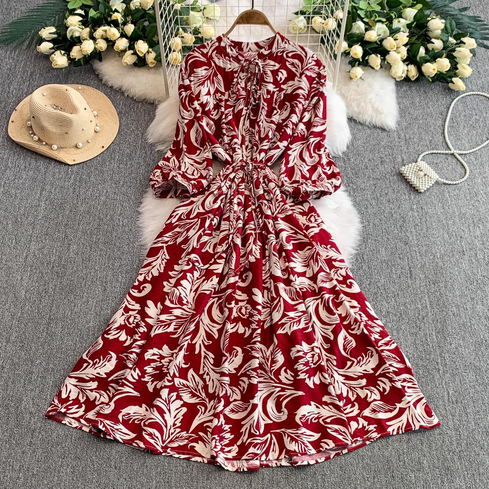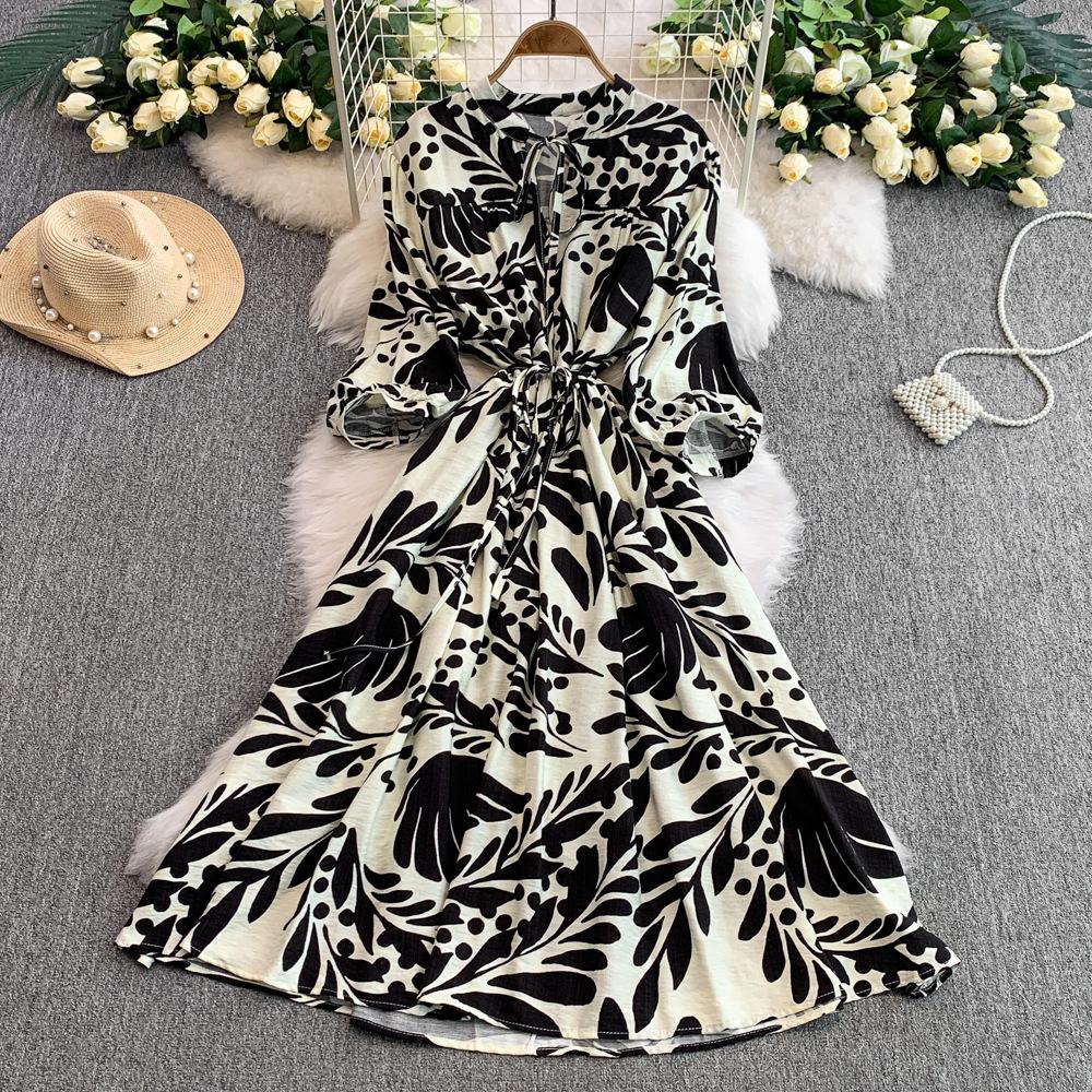 Compra Vestido Francés para Mujer 2025 Verano Nuevo Cuello Redondo Manga Linterna Cintura con Cordones Adelgazante Plisado Línea A Falda Larga al por mayor en Joom.pro