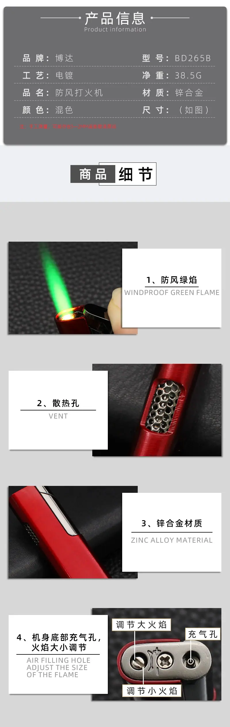 (2) Durante el uso, la altura normal de la llama debe ajustarse a: 1.5-2.5 cm para encendedores a prueba de viento y de inyección directa; 2.5-4.0 cm para encendedores de altavoz, de gasolina y de llama abierta;