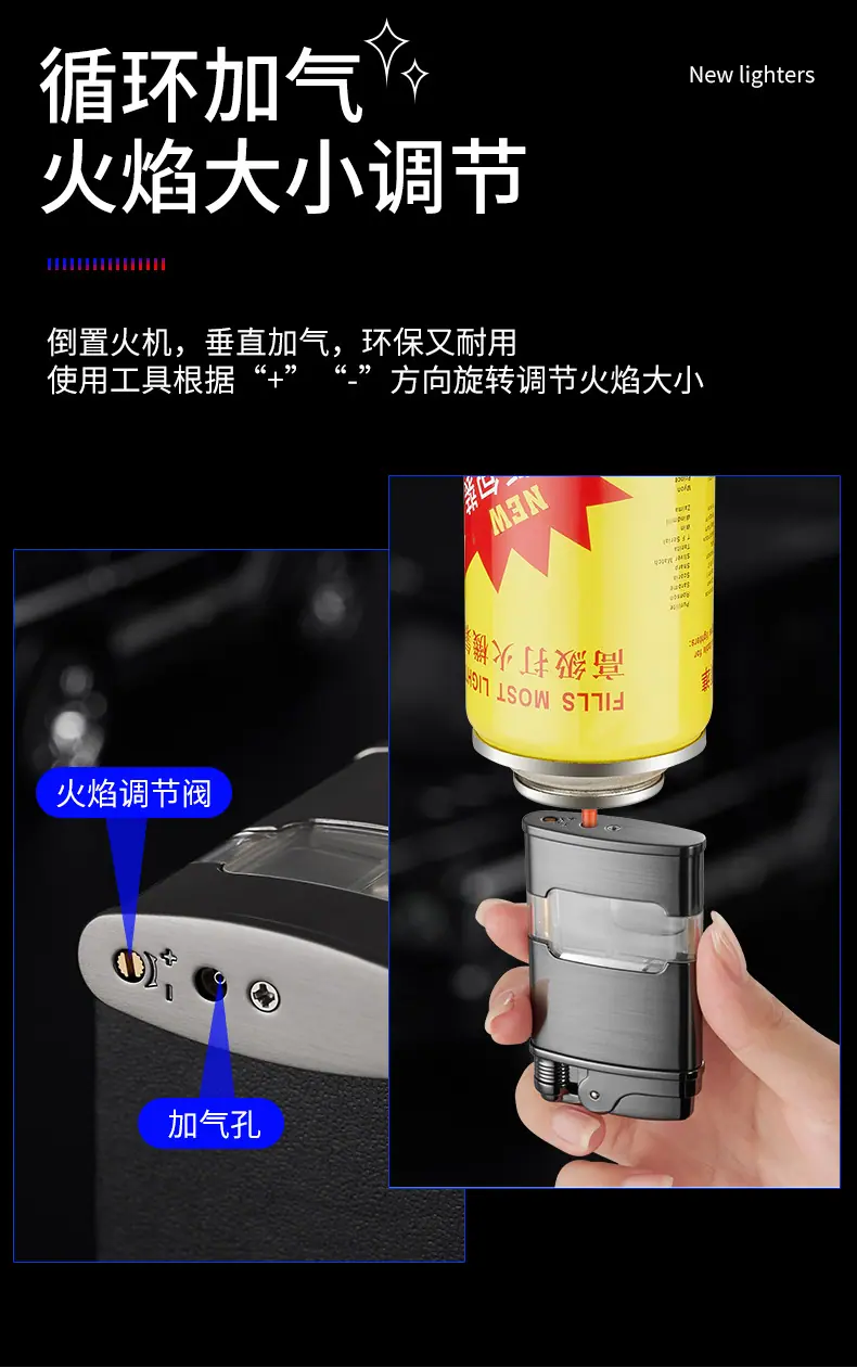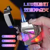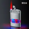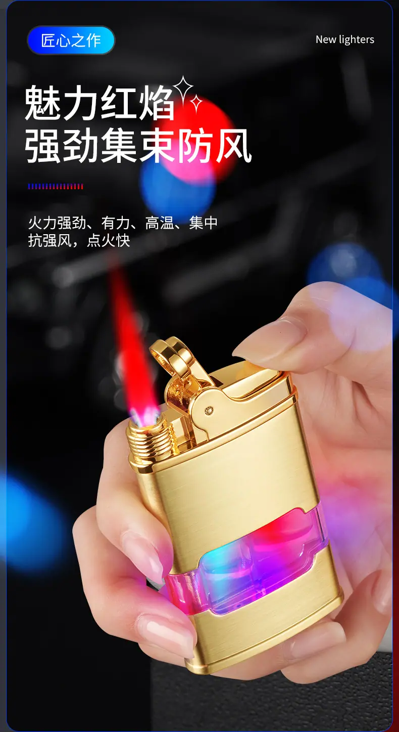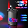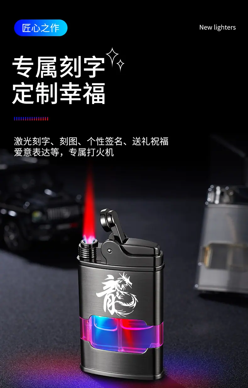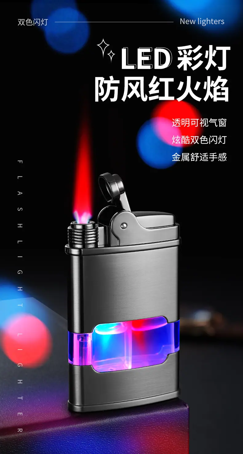 Luz roja y azul intermitente transparente almacén de gas inflable a prueba de viento encendedor de llama roja metal de alta gama personalidad transfronterizo caliente al por mayor