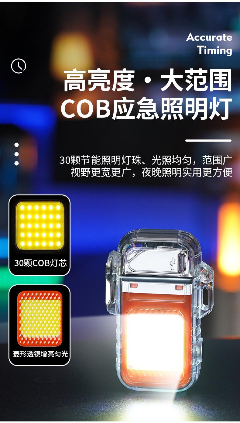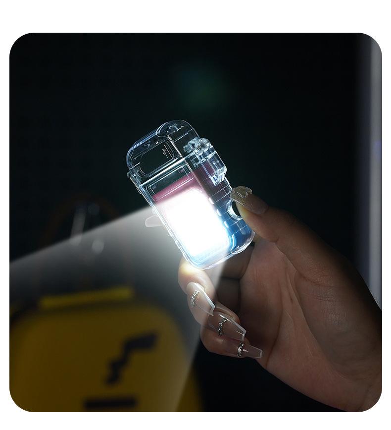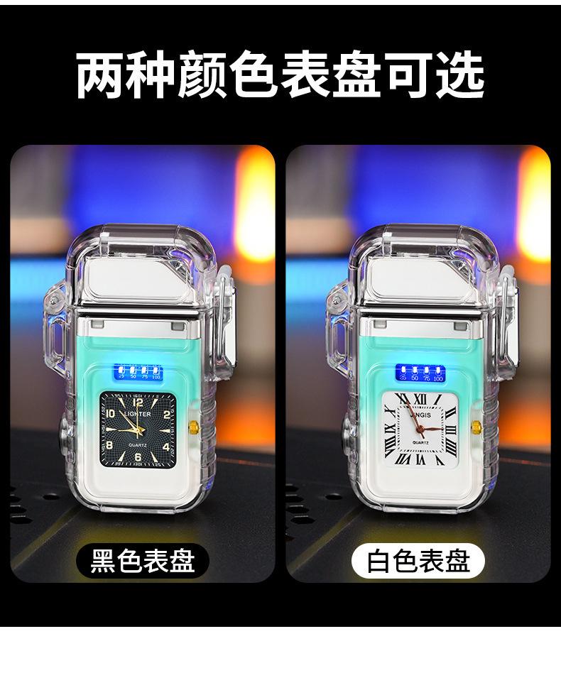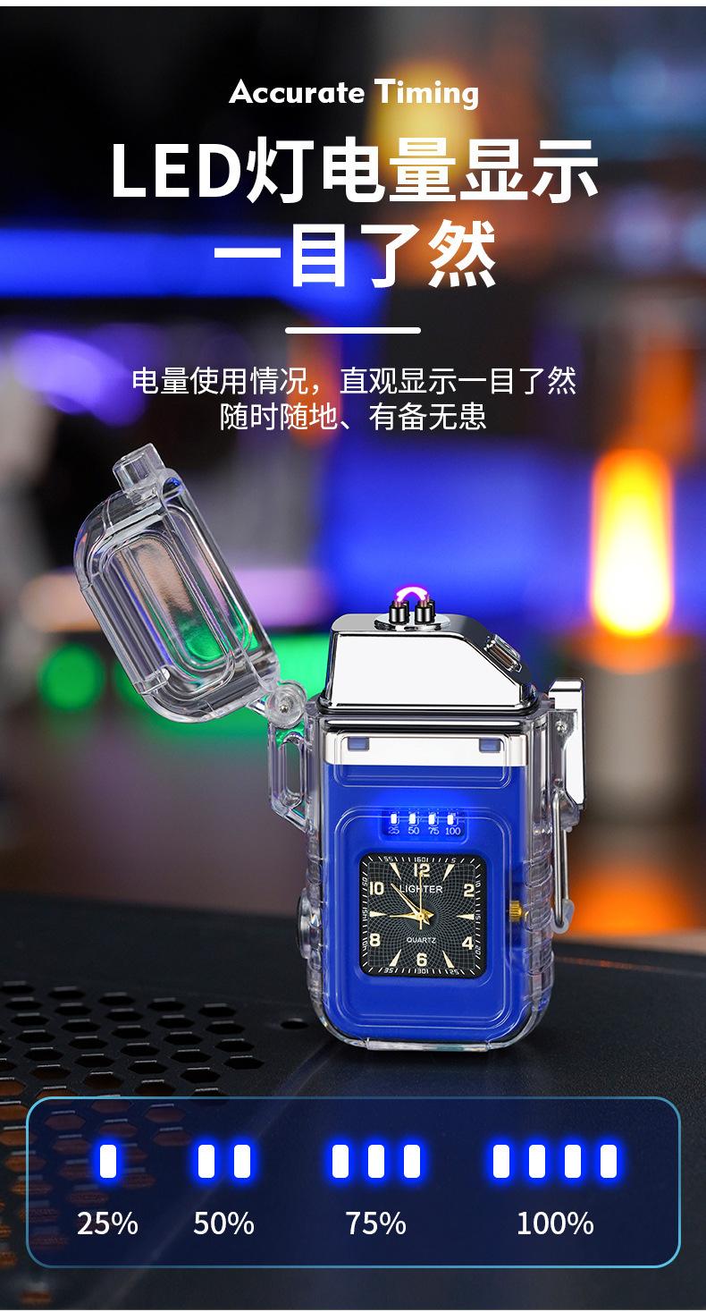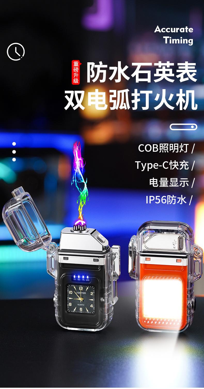 Nuevo modelo encendedor impermeable con dial carcasa transparente encendedor de carga de doble arco con iluminación COB de luz fuerte transfronterizo