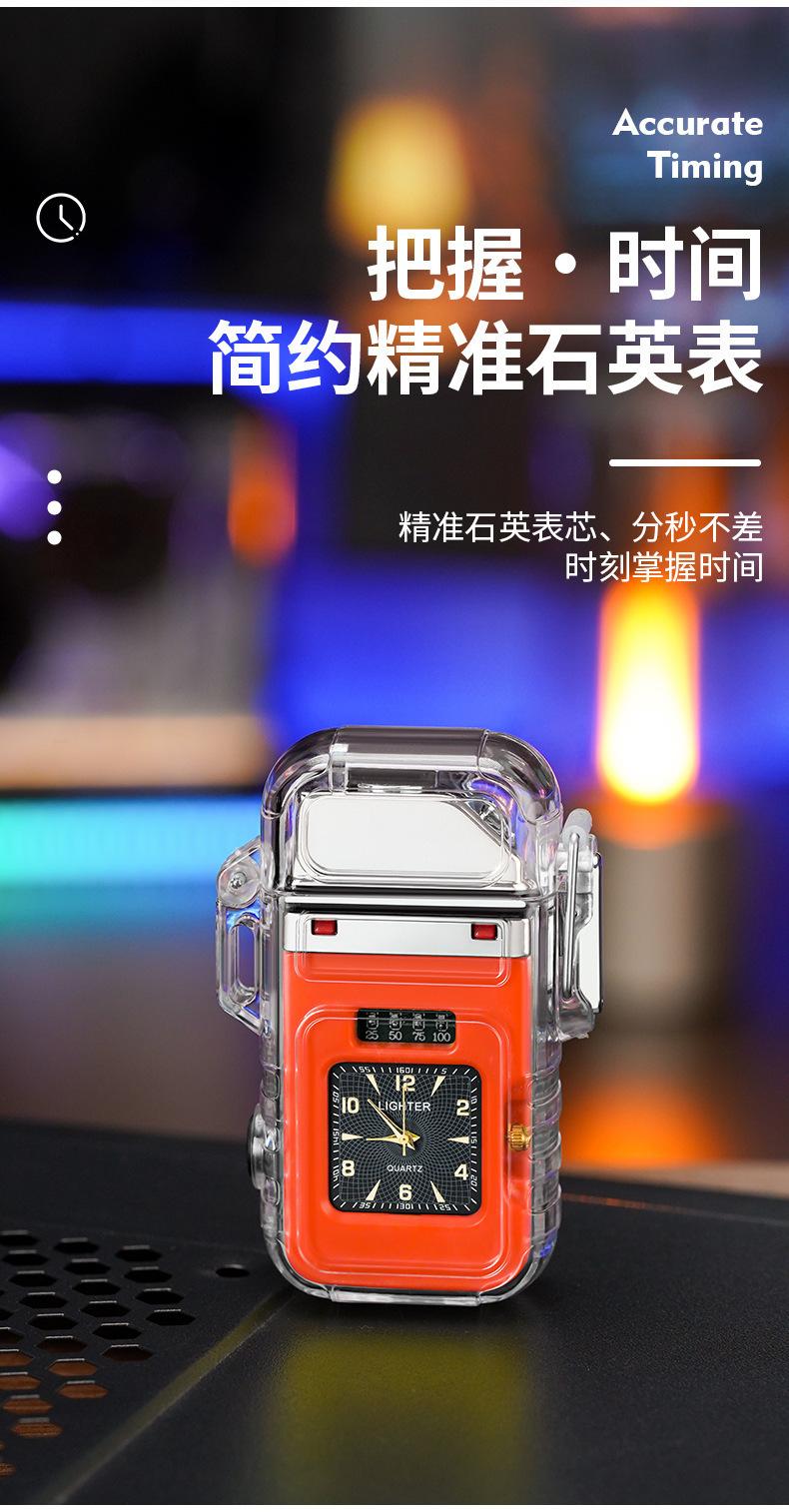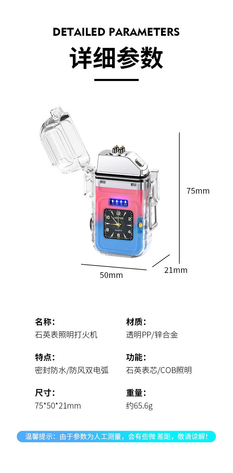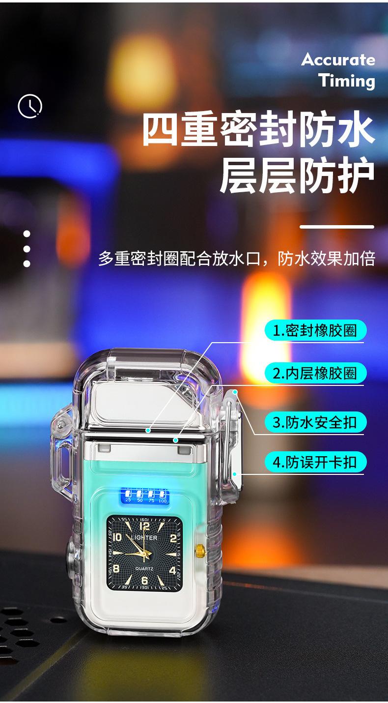 Nuevo modelo encendedor impermeable con dial carcasa transparente encendedor de carga de doble arco con iluminación COB de luz fuerte transfronterizo