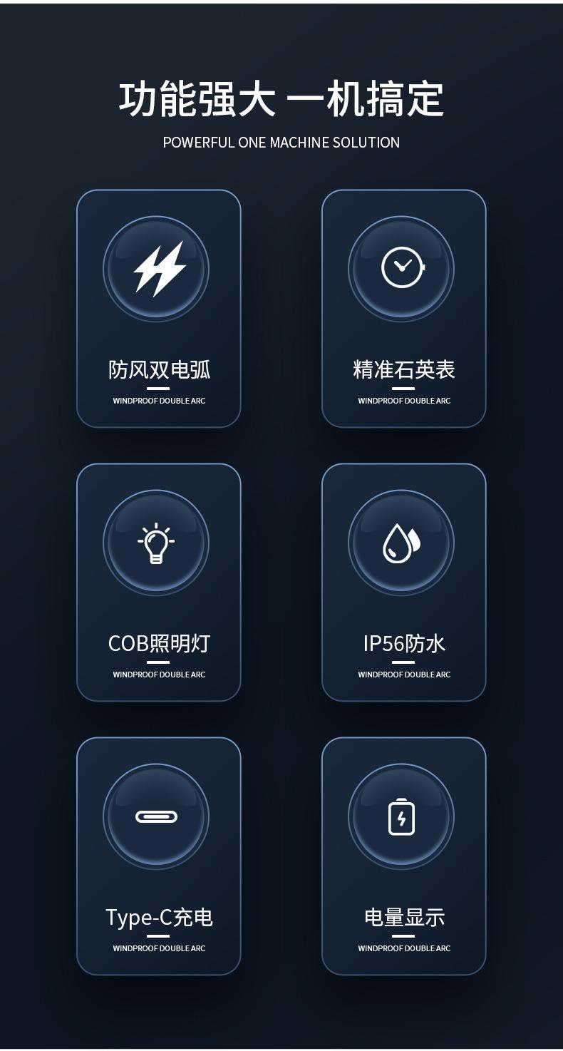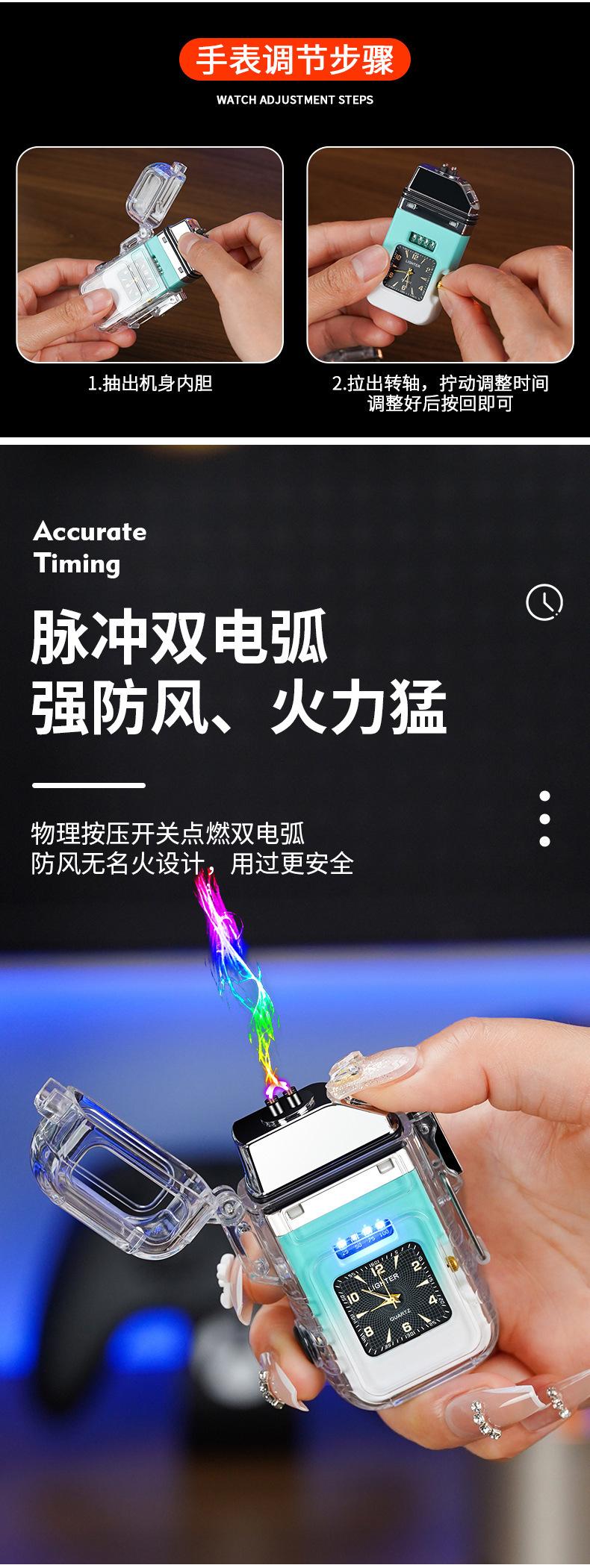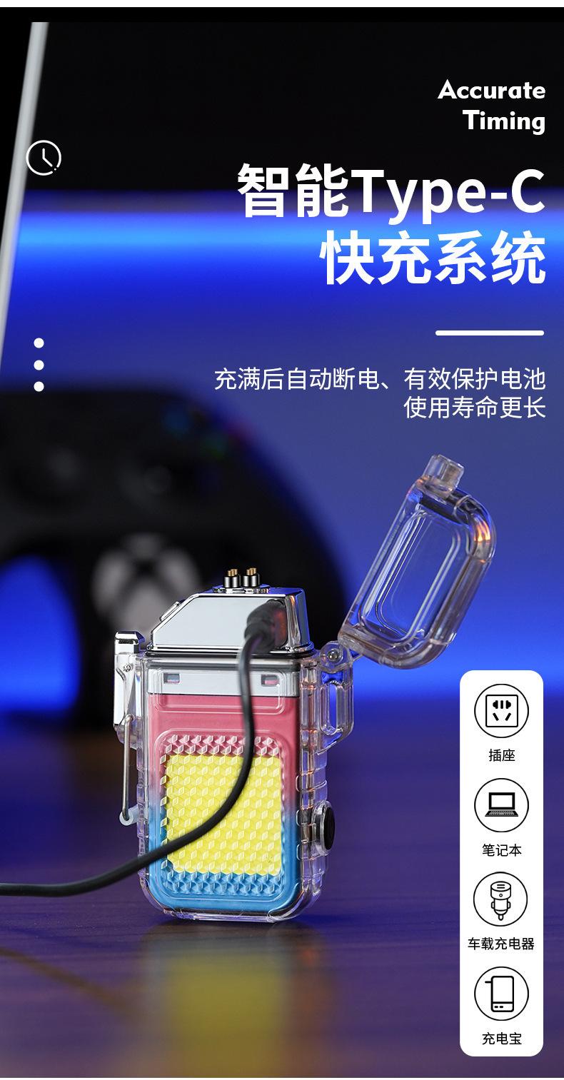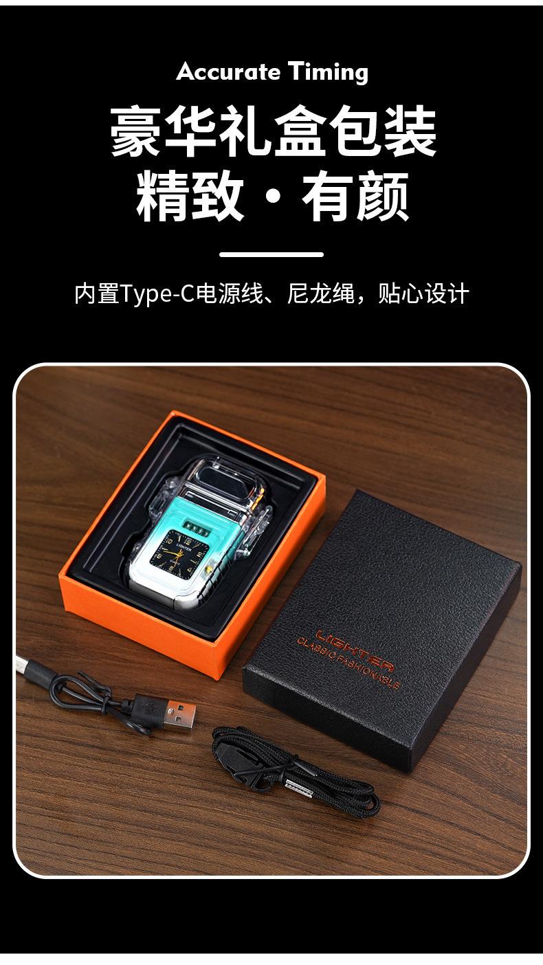 Nuevo modelo encendedor impermeable con dial carcasa transparente encendedor de carga de doble arco con iluminación COB de luz fuerte transfronterizo