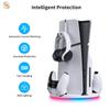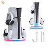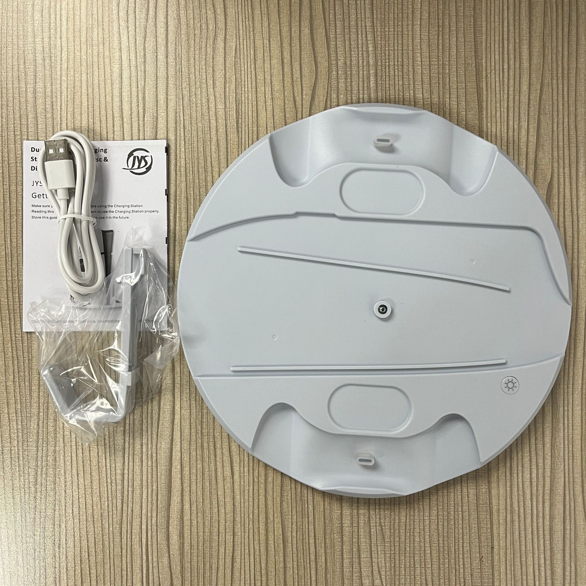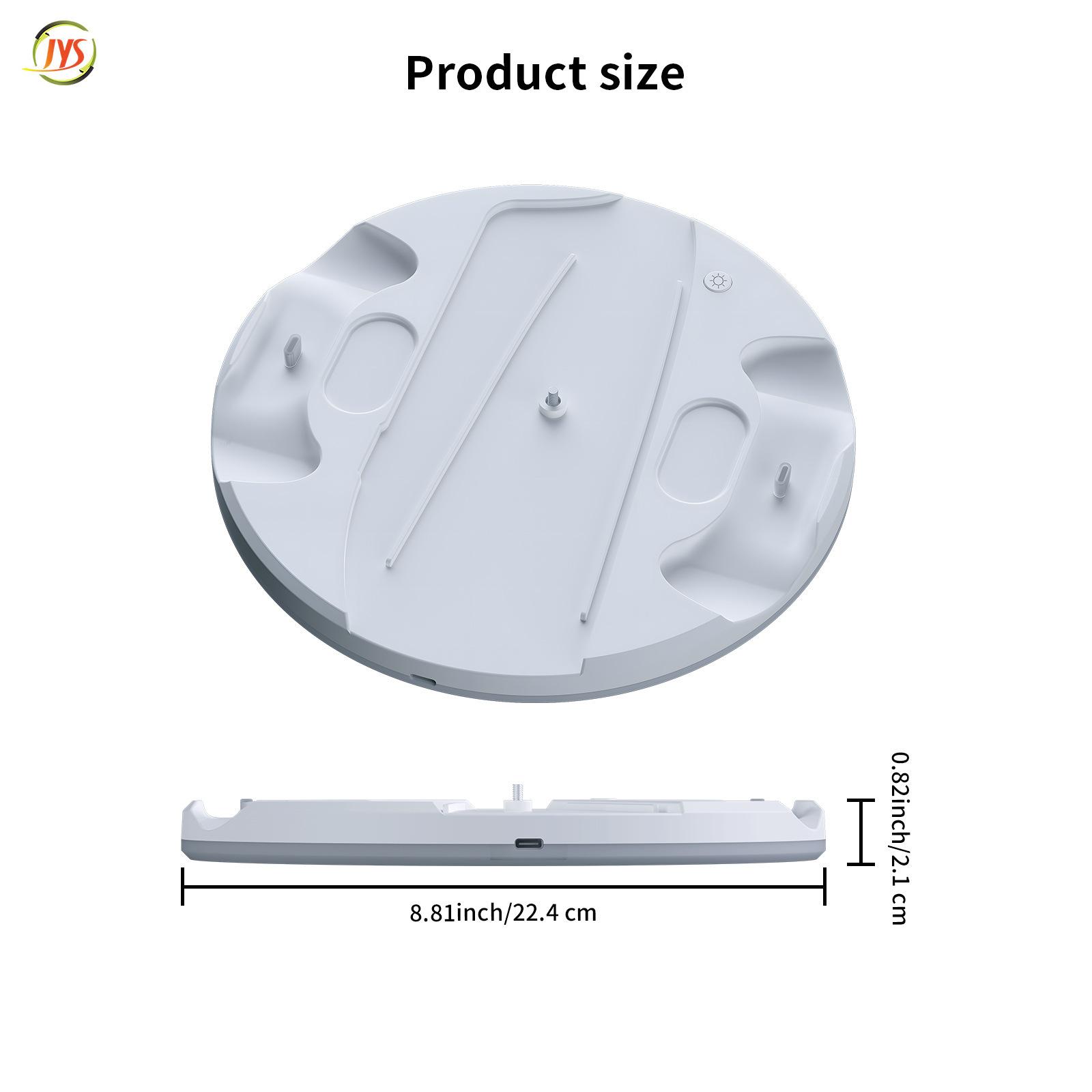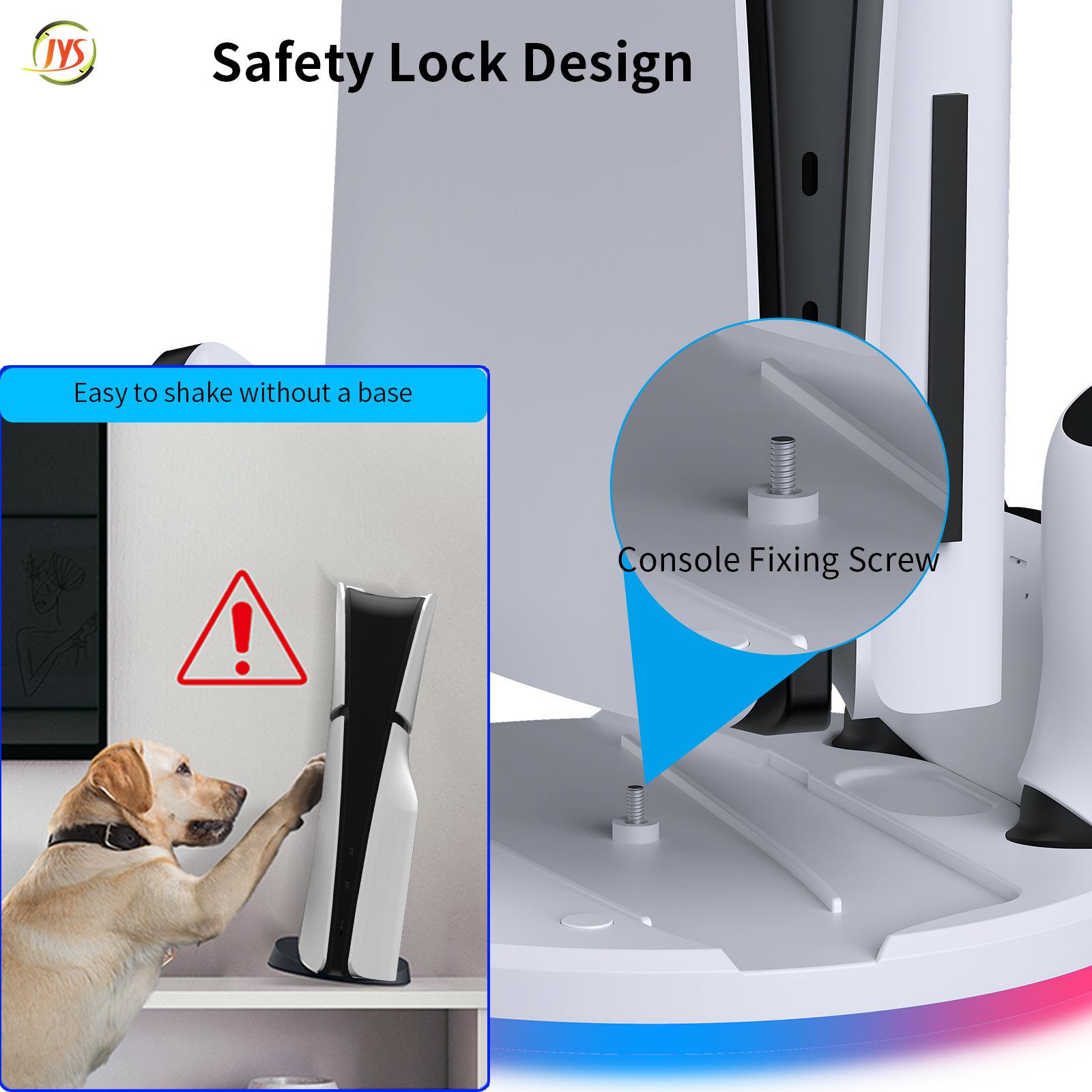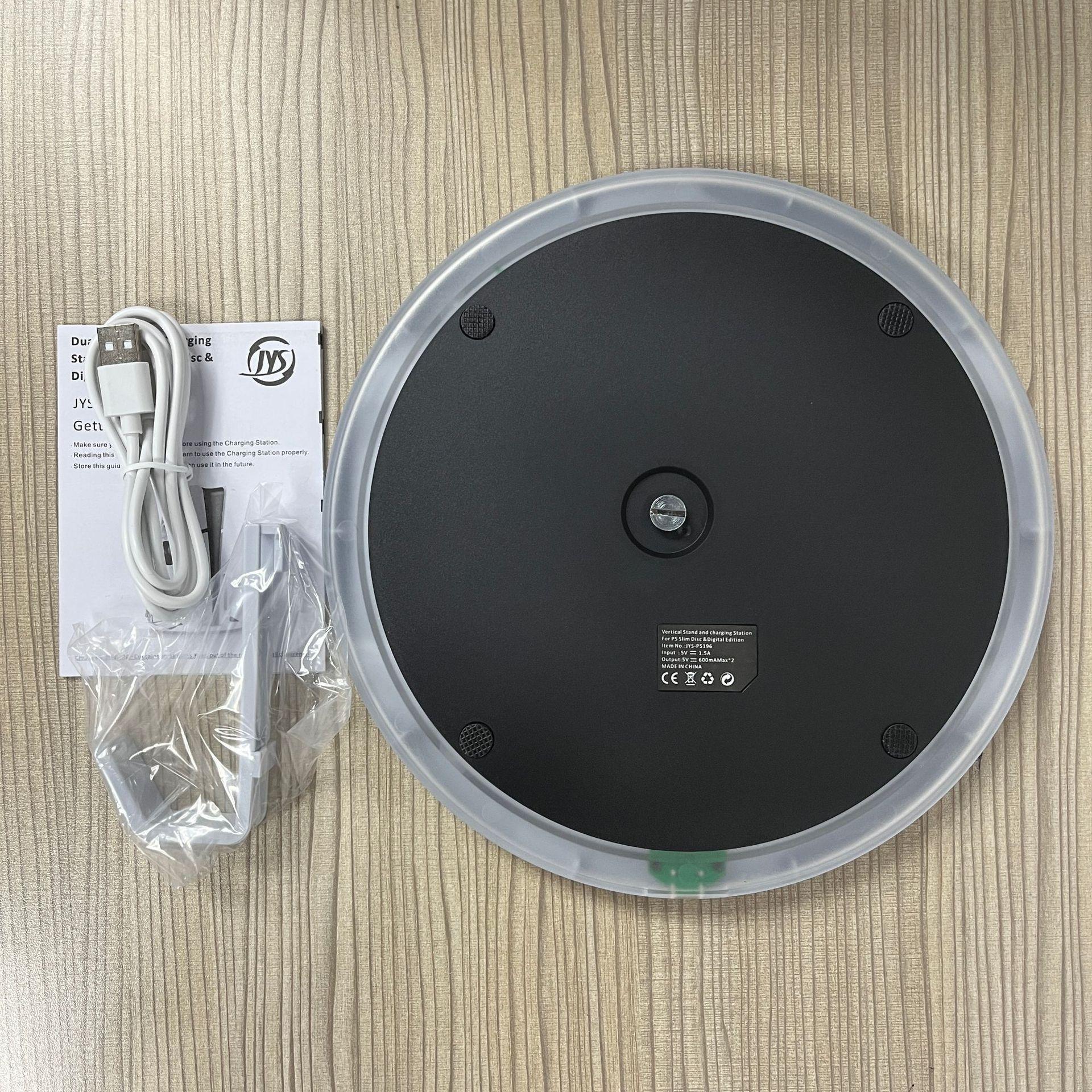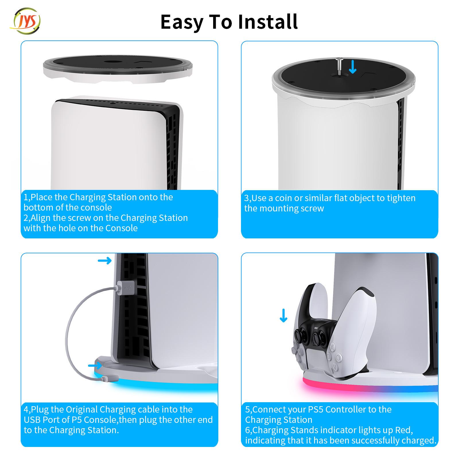 *Coloque la base en la parte inferior de la consola, alinee los tornillos de la base con los orificios en la parte inferior de la consola, apriete los tornillos con una moneda o un destornillador de punta plana, conecte el cable de carga incluido en el paquete a la base de carga e inserte el otro extremo en el terminal USB de la consola, inserte el mando de PS5 en la posición de carga correspondiente de la consola, y cuando comience la carga, la base se ilumina en rojo, y cuando esté completamente cargada, la luz azul se enciende.