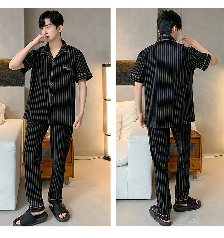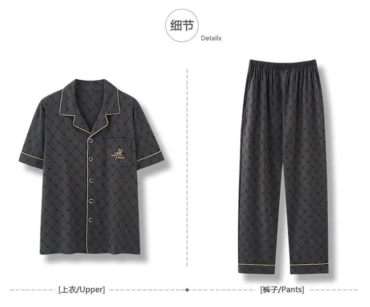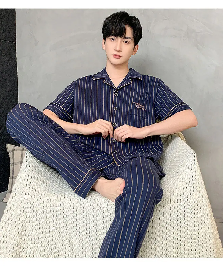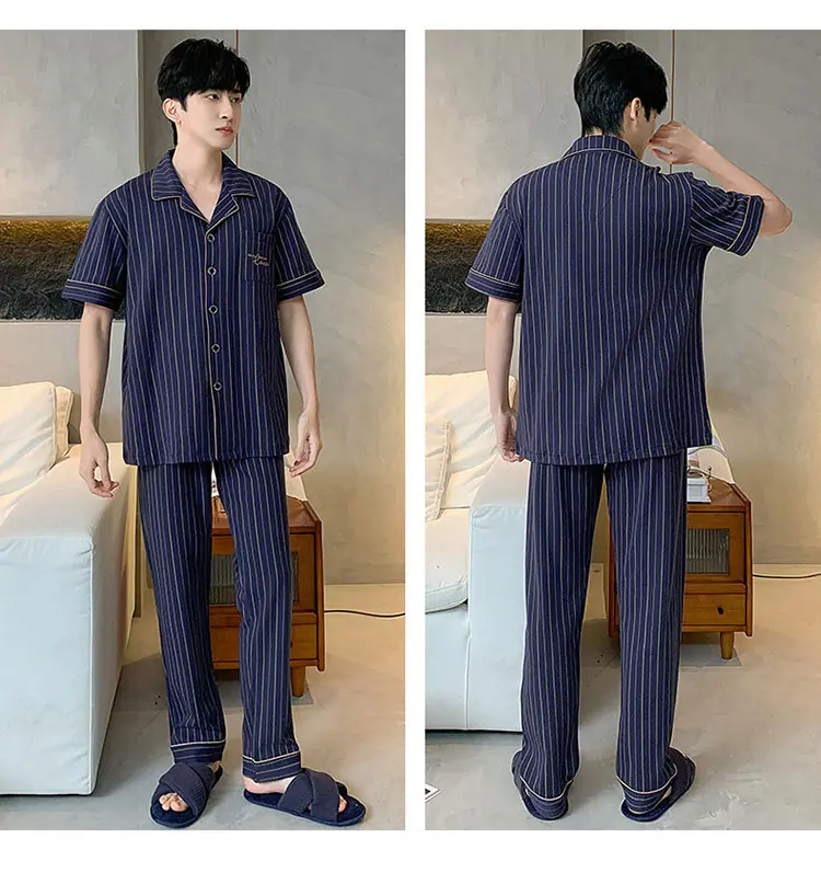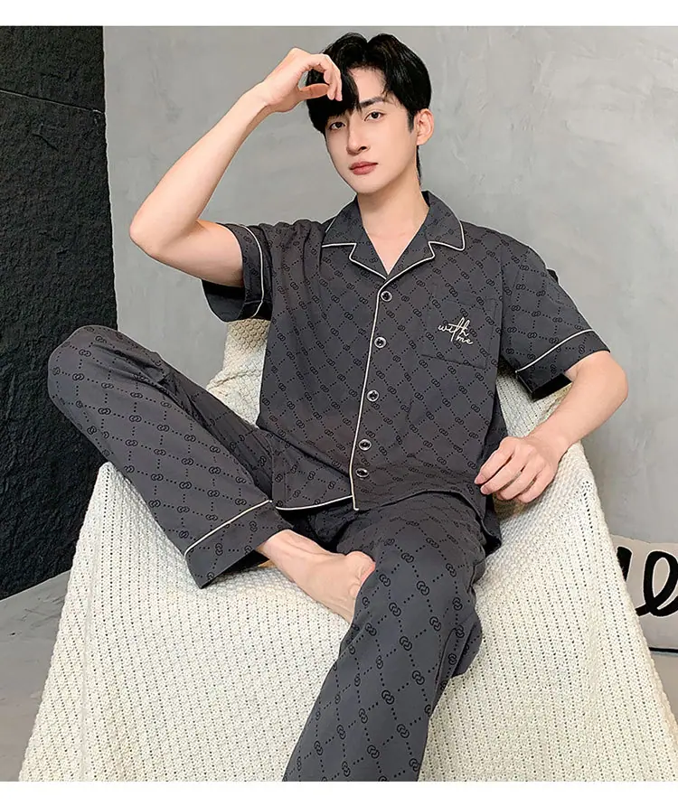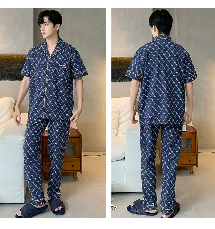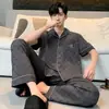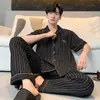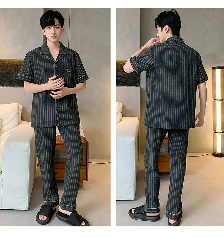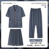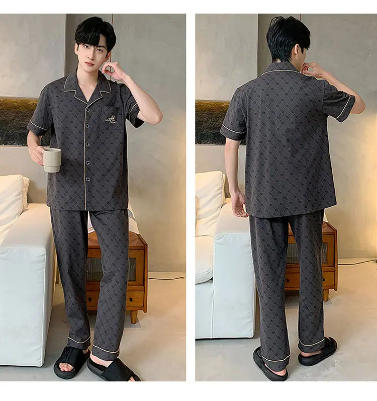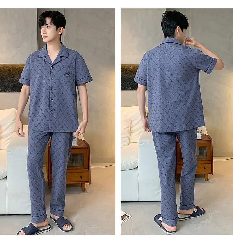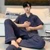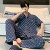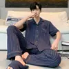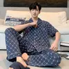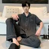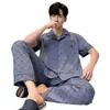 Pijama de Hombre Verano Algodón Manga Corta Pantalón Cuadros Cárdigan Casual Algodón Talla Grande Verano Ropa para el Hogar Conjunto de Dos Piezas