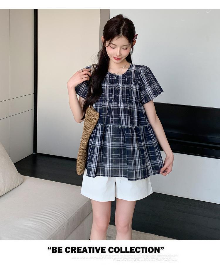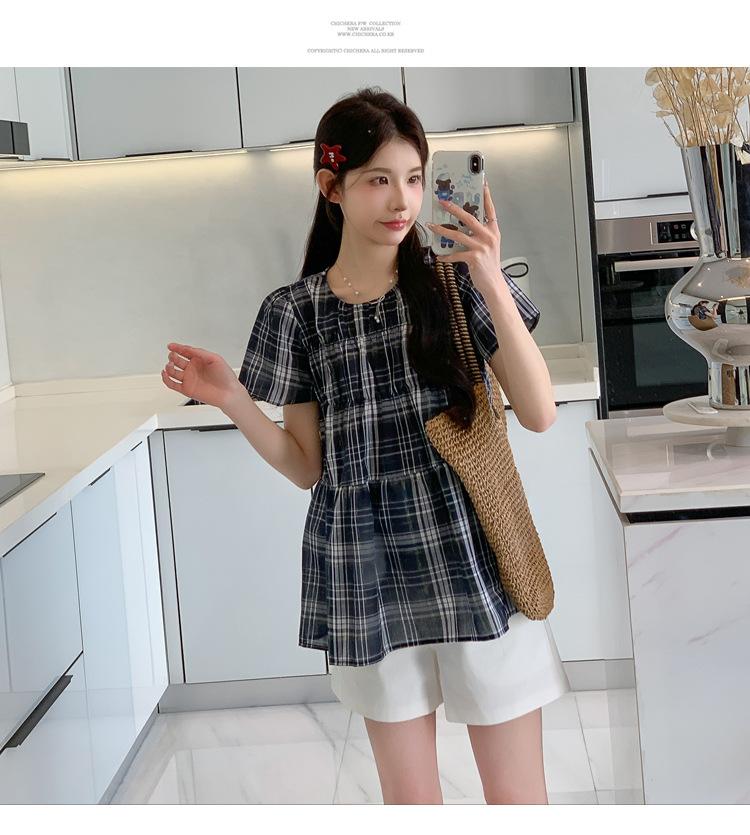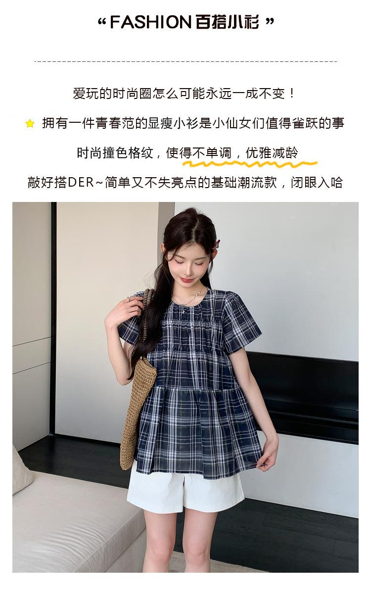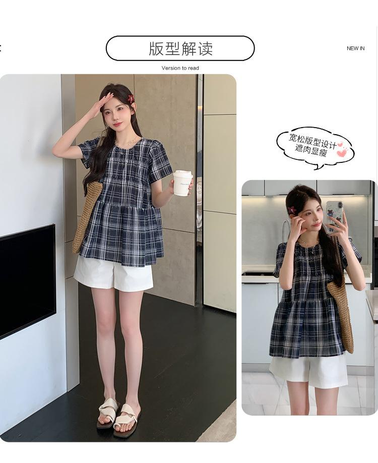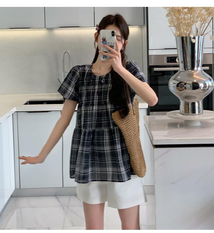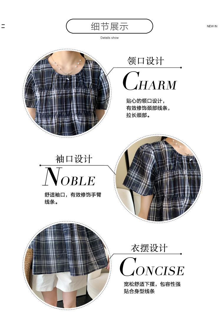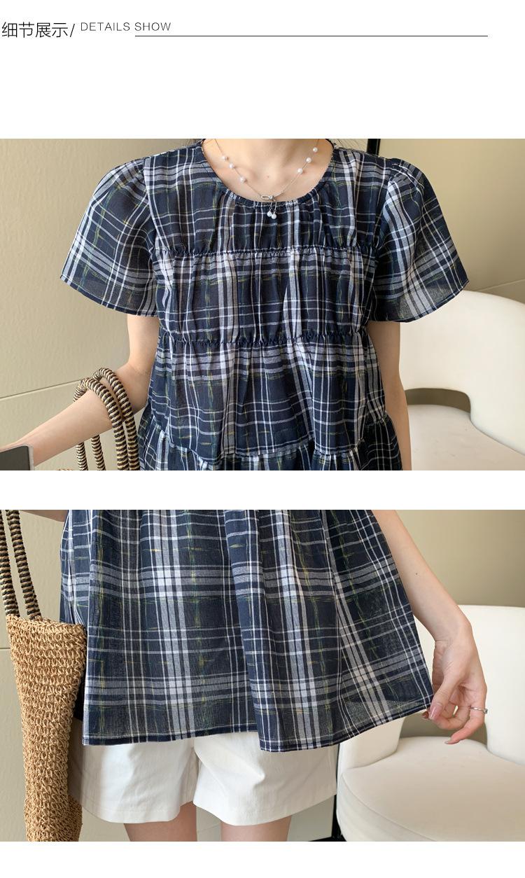 Ropa de Maternidad 2025 Nuevo Verano Camisa Azul a Cuadros de Manga Corta Cuello Redondo Look Adelgazante Top de Maternidad Holgado Cubre Vientre