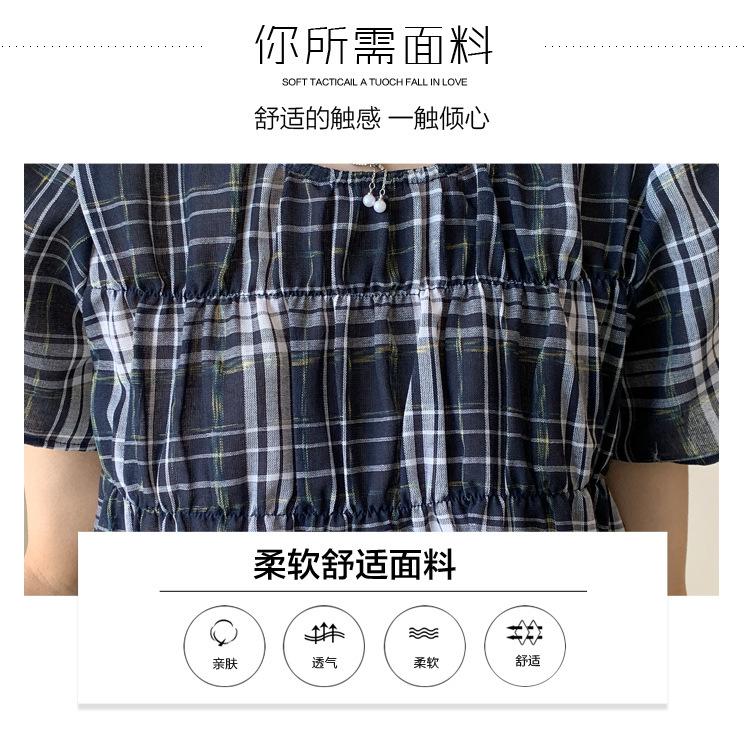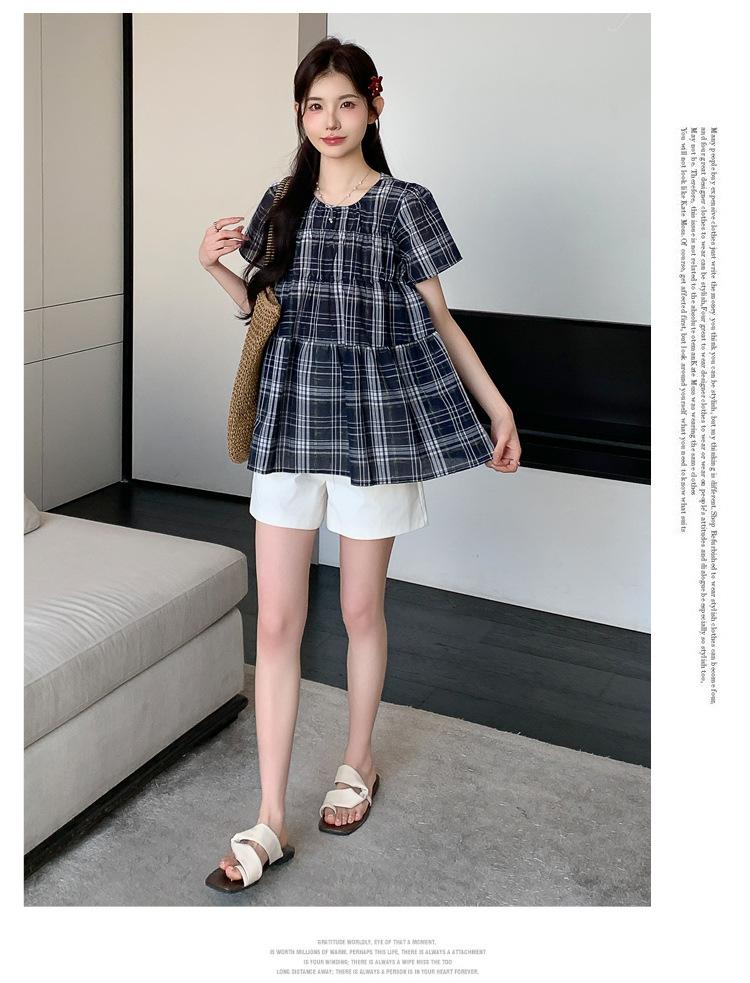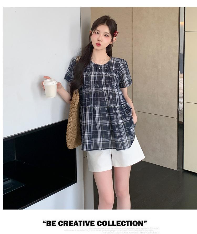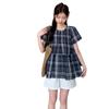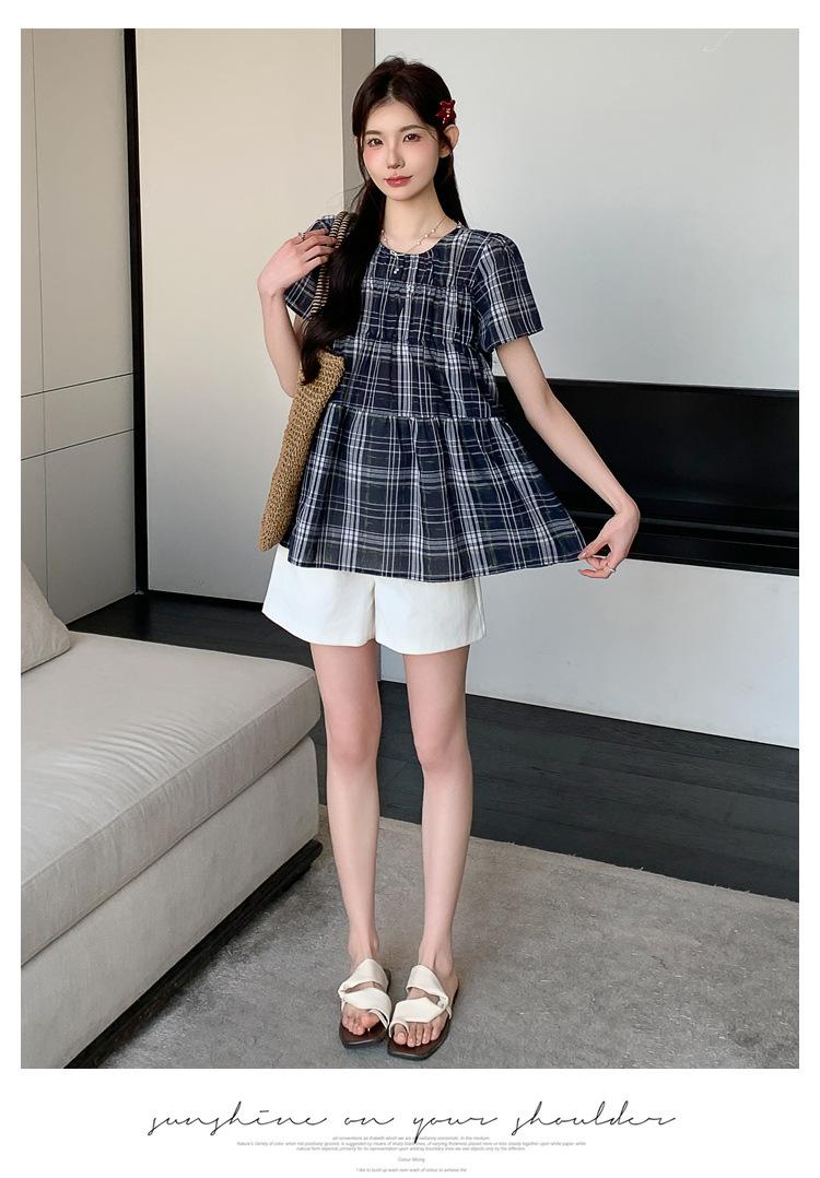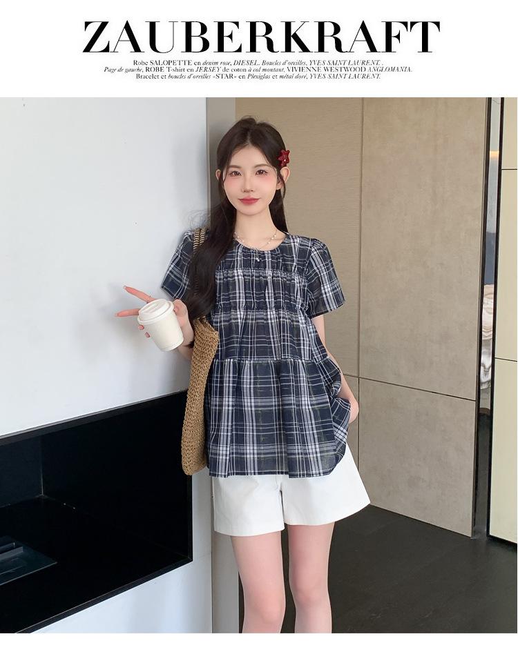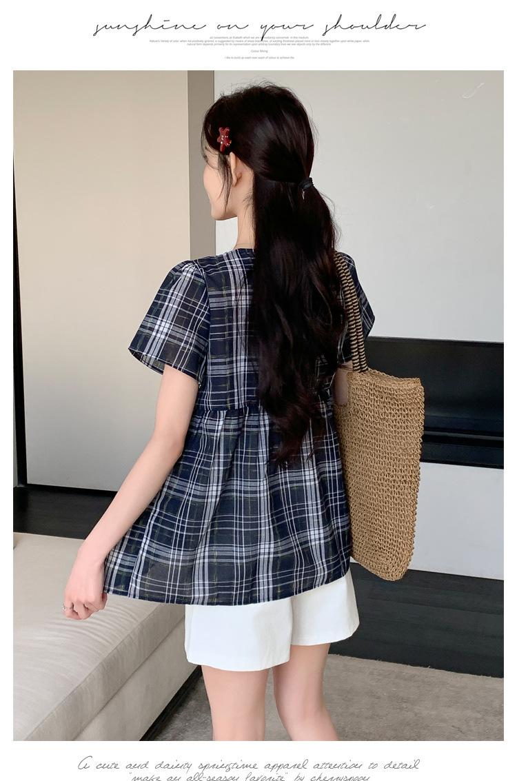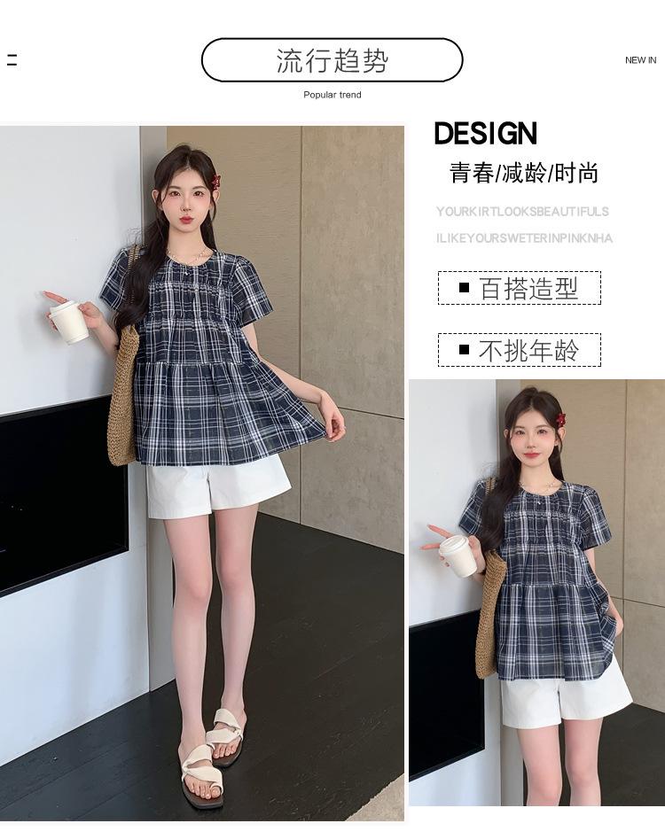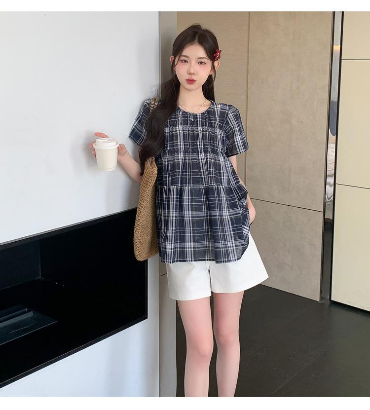 Ropa de Maternidad 2025 Nuevo Verano Camisa Azul a Cuadros de Manga Corta Cuello Redondo Look Adelgazante Top de Maternidad Holgado Cubre Vientre