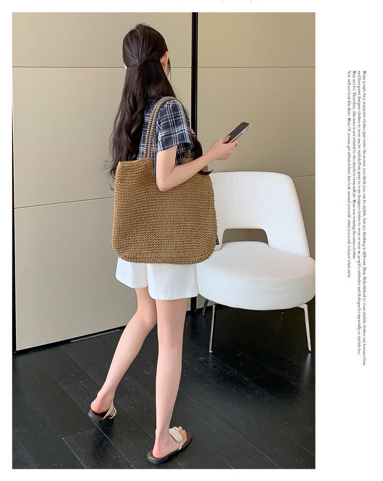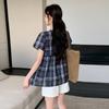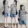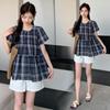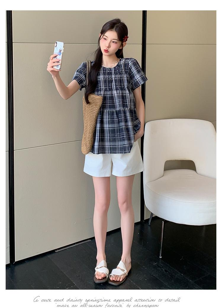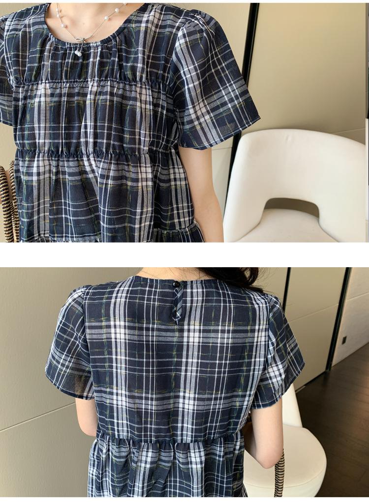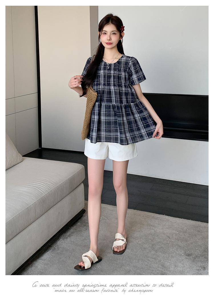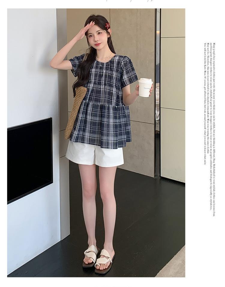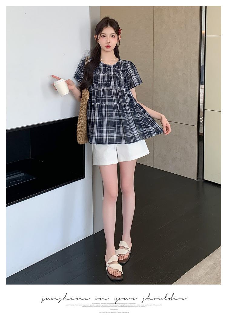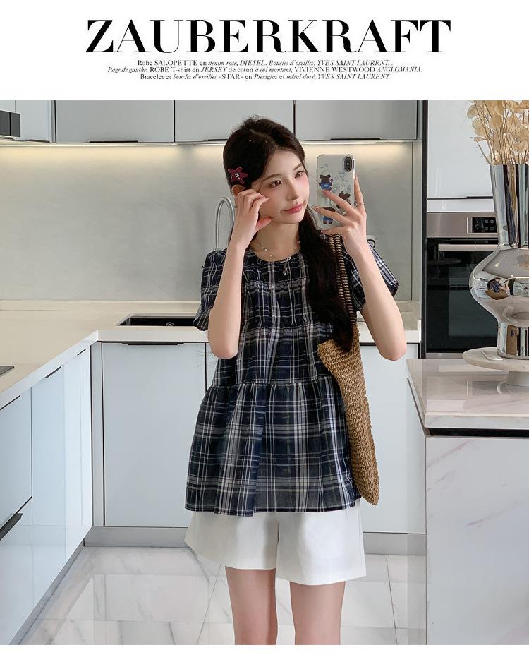 Ropa de Maternidad 2025 Nuevo Verano Camisa Azul a Cuadros de Manga Corta Cuello Redondo Look Adelgazante Top de Maternidad Holgado Cubre Vientre