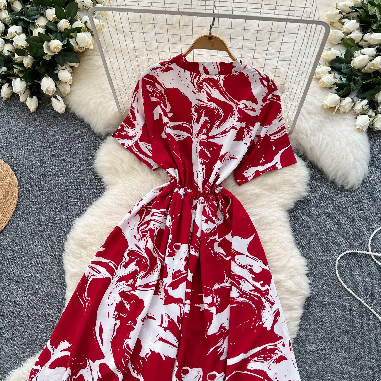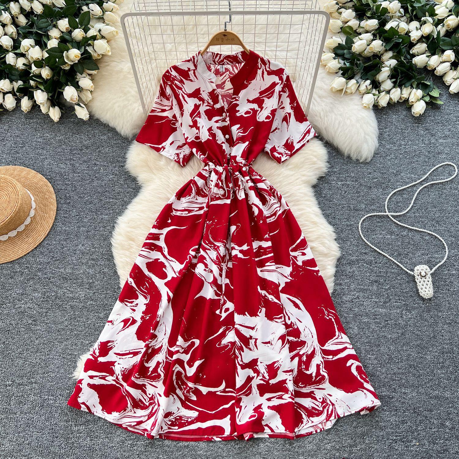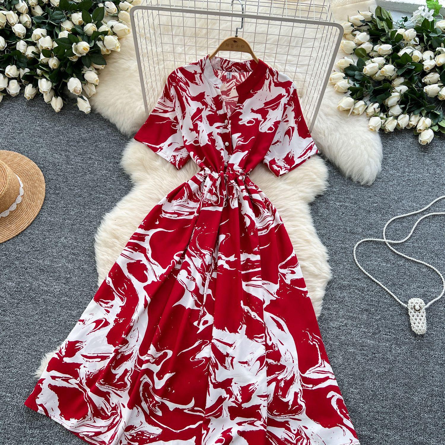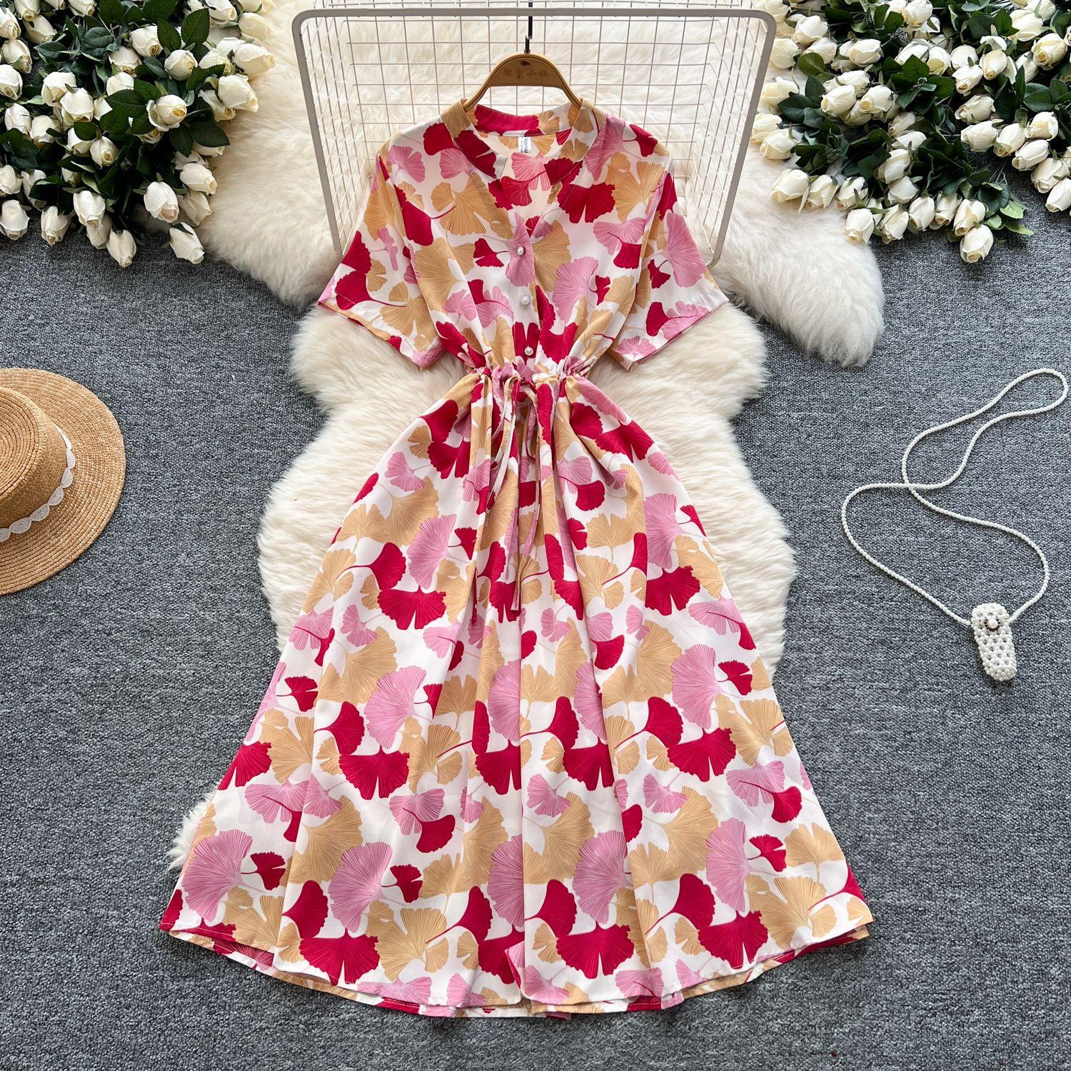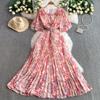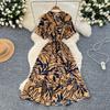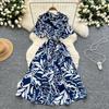 Vestido Estampado de Manga Corta con Diseño Retro Francés y Cintura con Tirantes para Mujer en Verano Adelgazante y Elegante Falda Larga