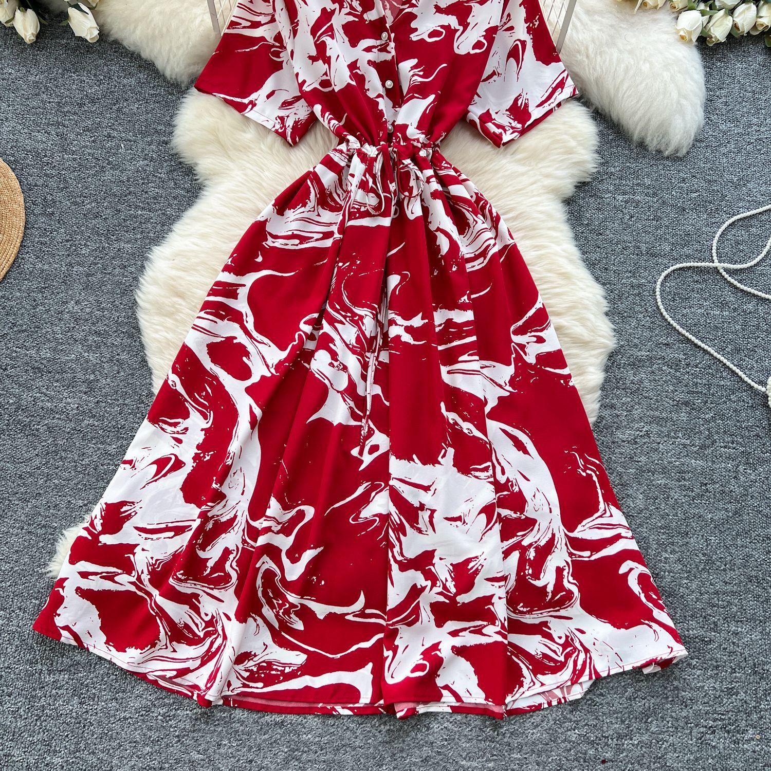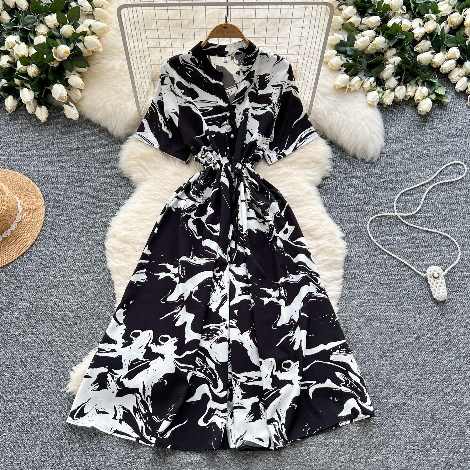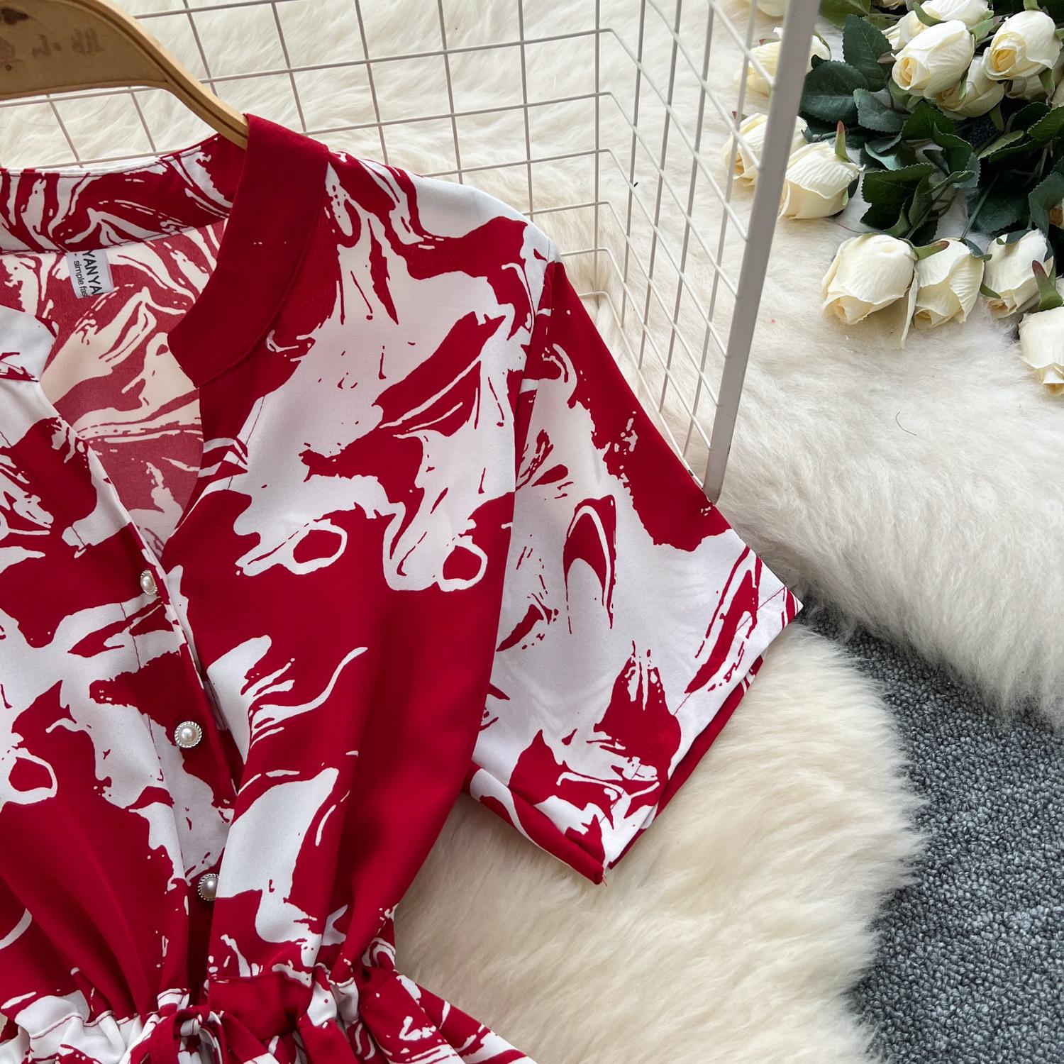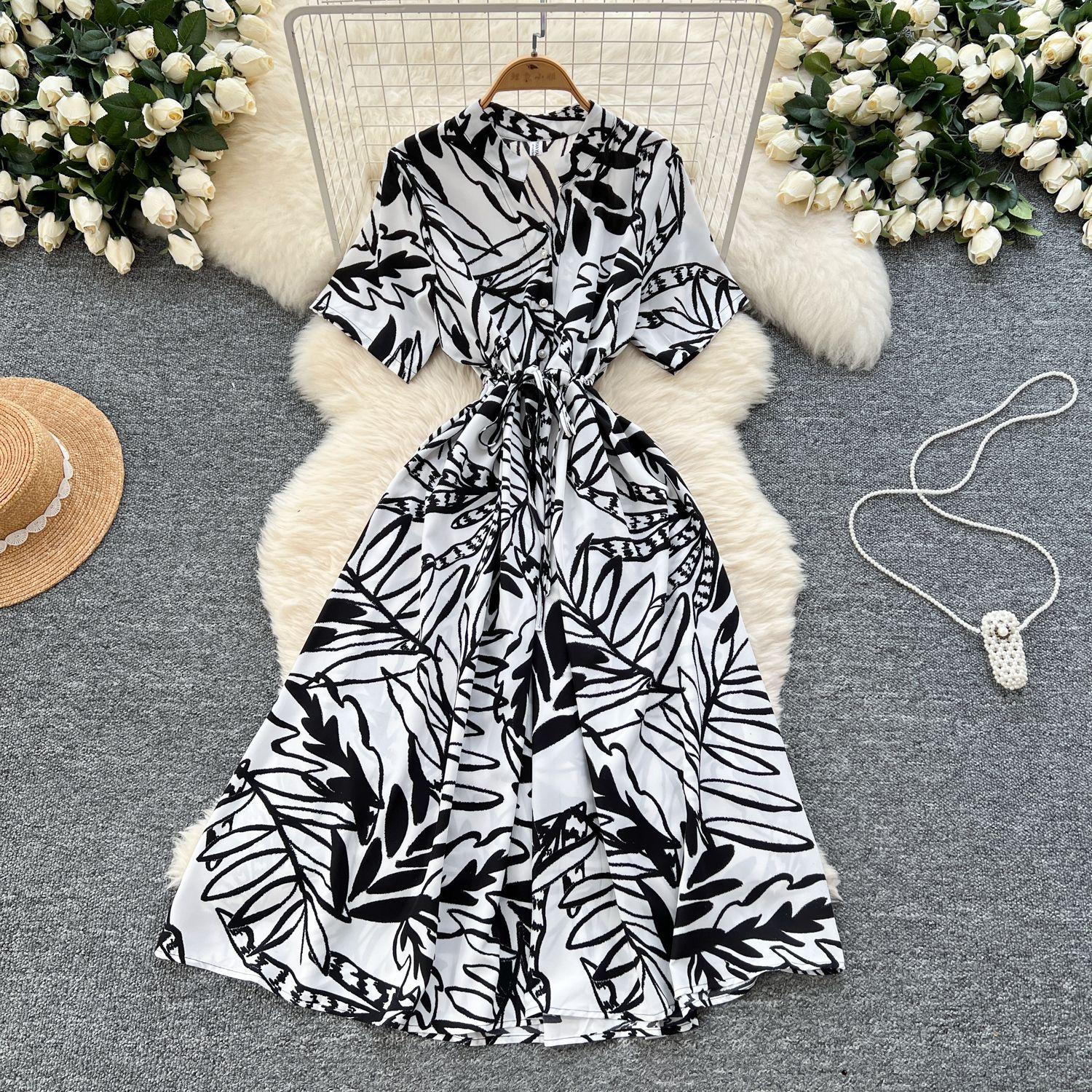 Vestido Estampado de Manga Corta con Diseño Retro Francés y Cintura con Tirantes para Mujer en Verano Adelgazante y Elegante Falda Larga