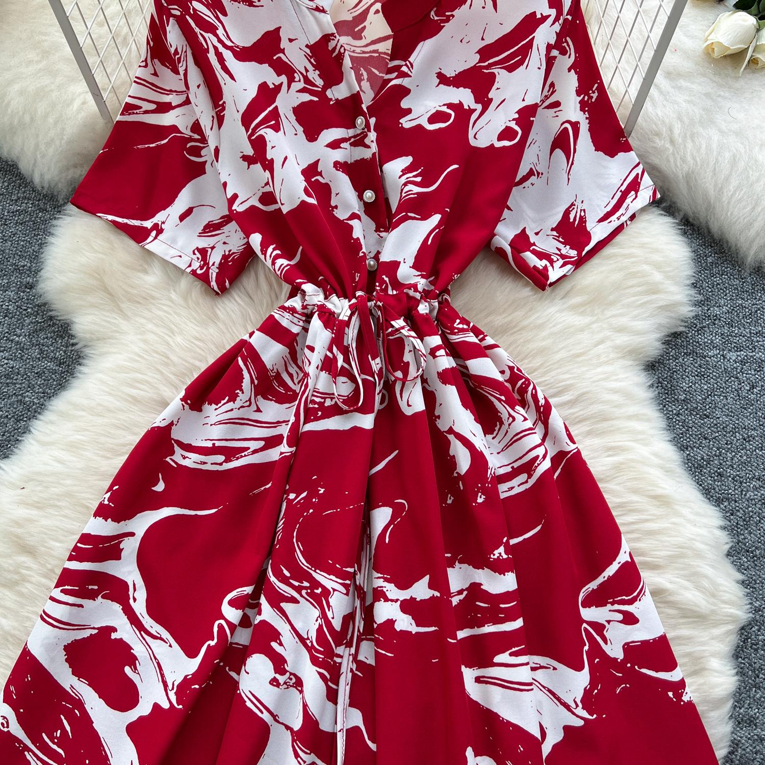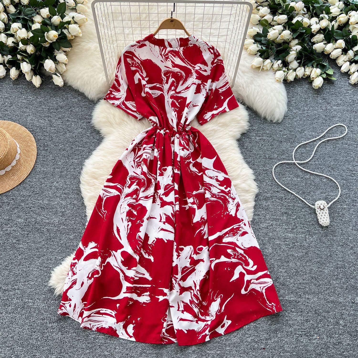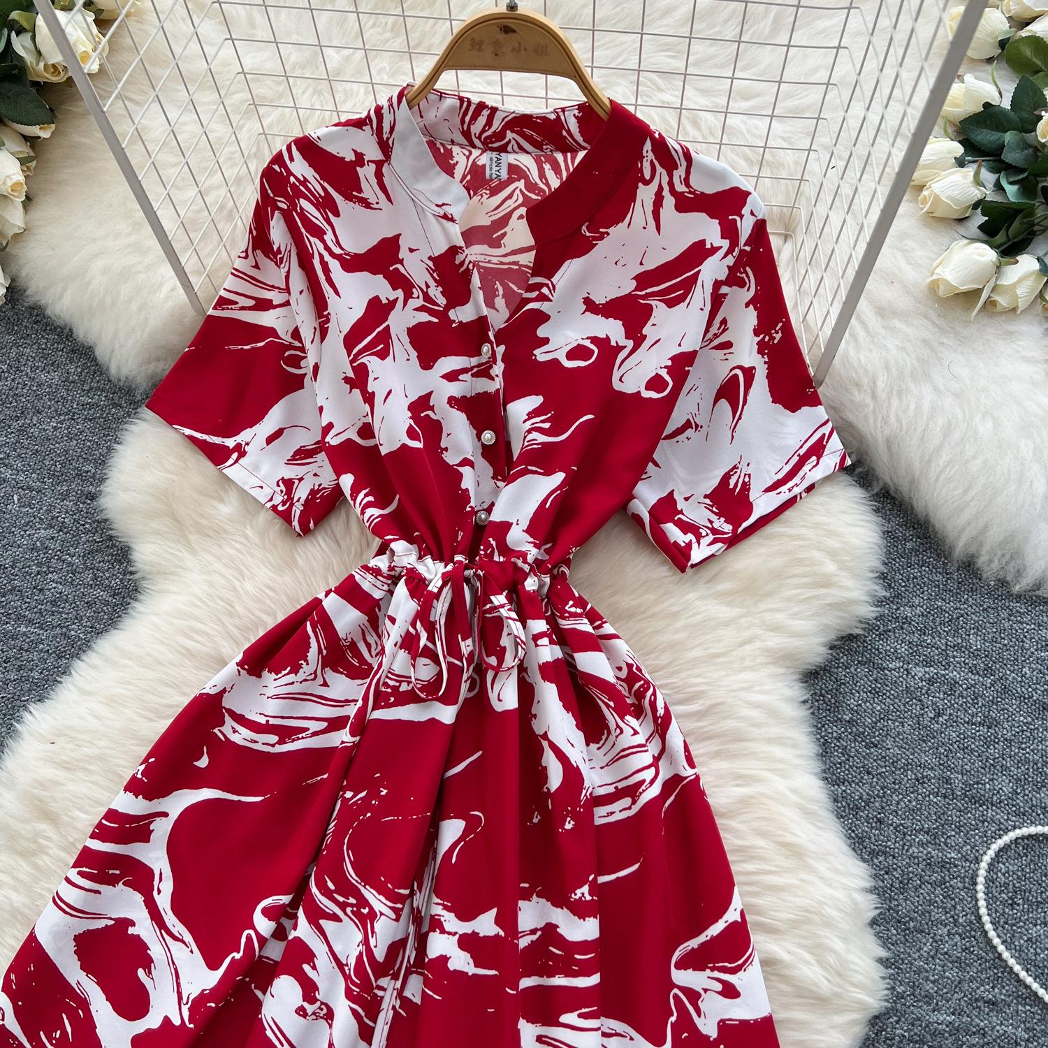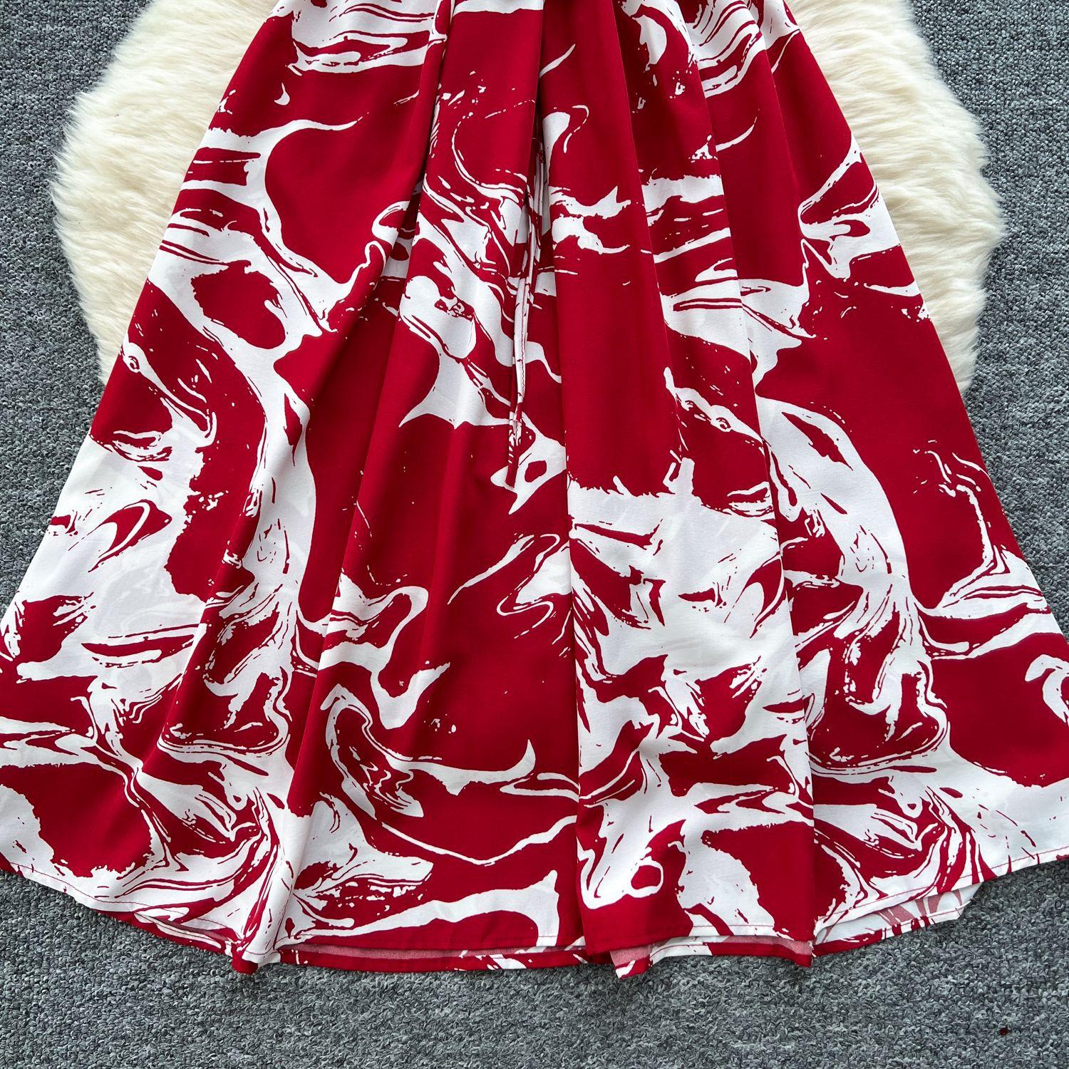 Vestido Estampado de Manga Corta con Diseño Retro Francés y Cintura con Tirantes para Mujer en Verano Adelgazante y Elegante Falda Larga