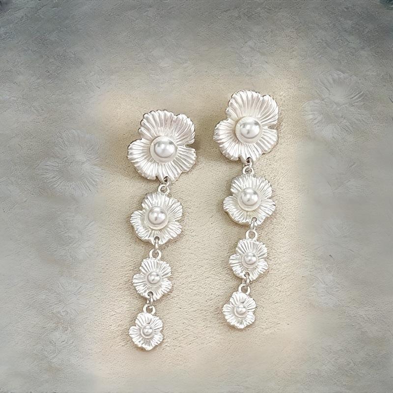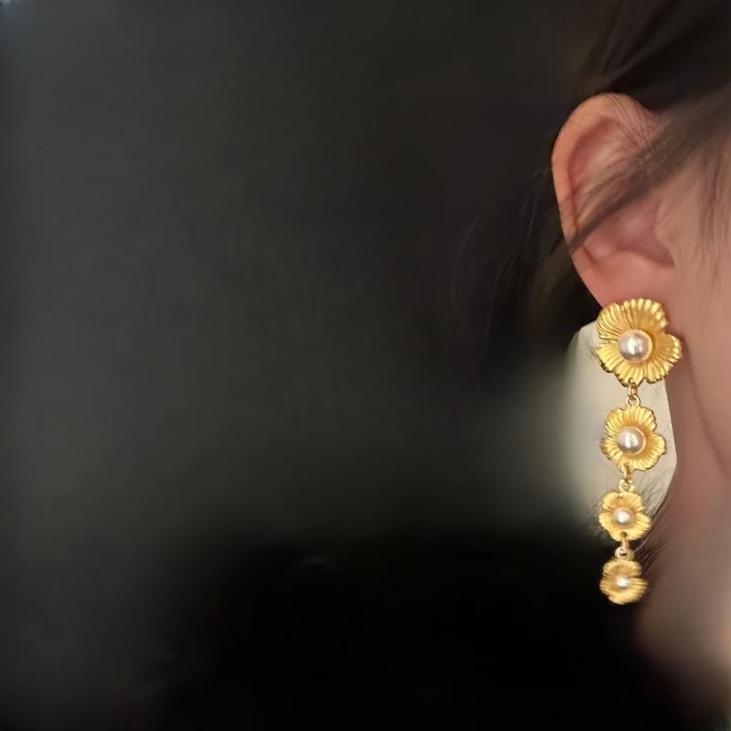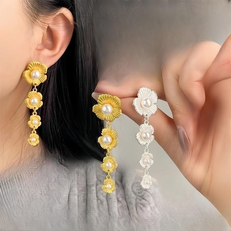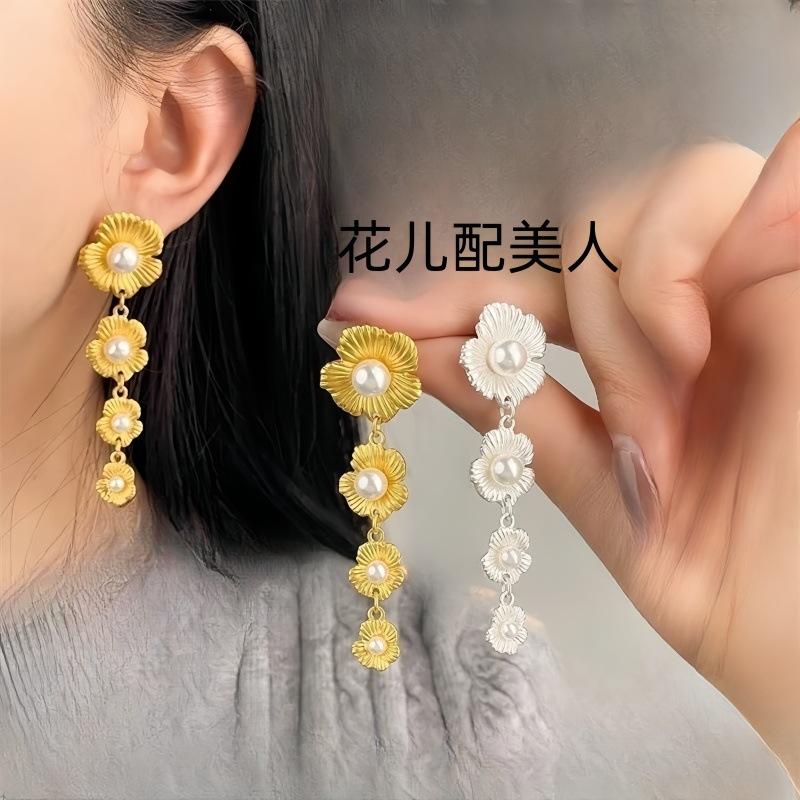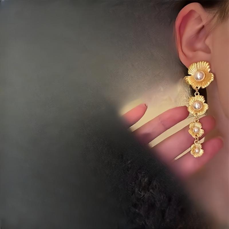 Aretes de Flor Retro Francesa con Perlas 2025, Femeninos, Aretes de Alta Gama, Nicho de Lujo Accesible, Aretes Adelgazantes para el Rostro, Nuevos