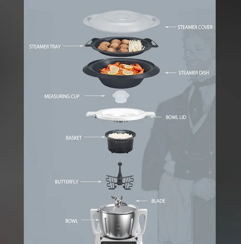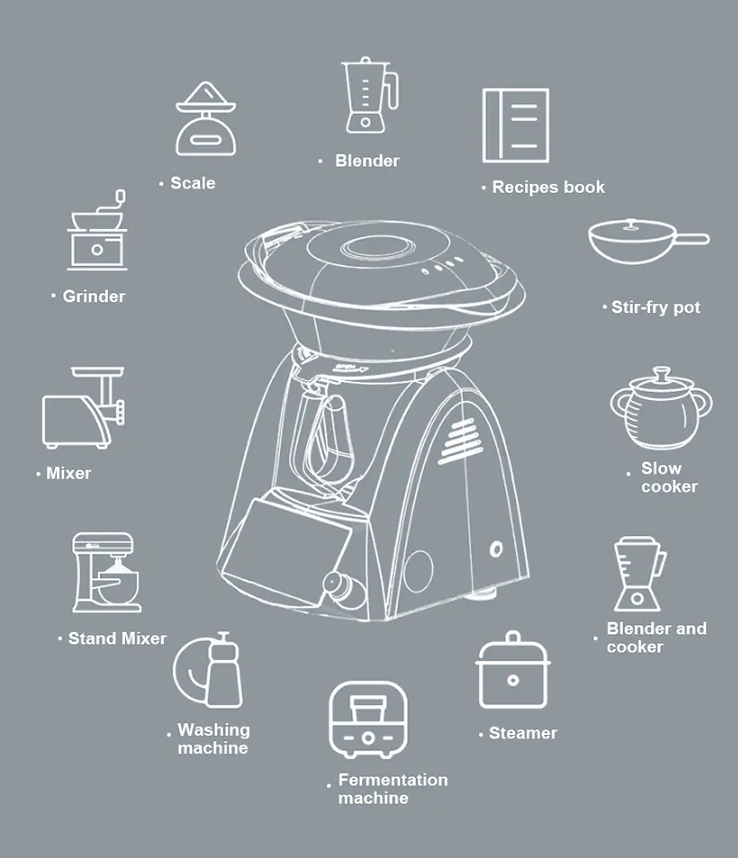 Características del Producto:Doce electrodomésticos funcionales principales, licuadora, libro de recetas, wok, olla para guisos, máquina para hacer leche de soya, vaporera, fermentador, lavador de verduras;s cuchillo, picadora de carne, molinillo, báscula de cocina, etc.. Picar, cocinar, moler, amasar masa, bajo ruido, mezclar, batir, ajustes de velocidad, control táctil, eléctrico.