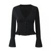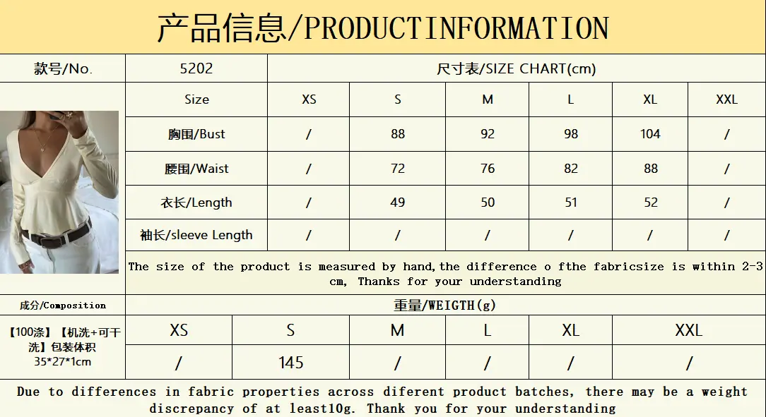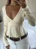 Este top irradia elegancia. Adopta un diseño de escote en V profundo, mostrando inteligentemente las líneas del cuello y la clavícula y añadiendo un toque de encanto sexy. El estilo de manga larga satisface las necesidades de vestimenta de múltiples estaciones. El corte que ciñe la cintura define con precisión la línea de la cintura, optimizando la proporción corporal. Combinado con el elemento de dobladillo con volantes, es ágil y fluido, inyectando una sensación de romance al look general. El diseño de color sólido es simple y elegante, fácil de combinar con varias prendas inferiores. Ya sea combinado con jeans para crear un estilo casual o con una falda midi para crear un ambiente elegante, se puede manejar fácilmente. Es un artículo práctico para realzar el gusto al vestir.