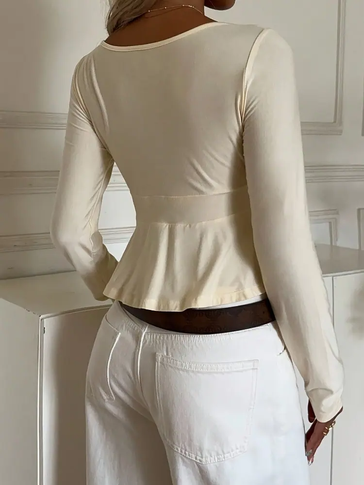 Elegante playera de manga larga para mujer con cuello en V, cintura ceñida con volantes y corte ajustado, de color sólido para verano