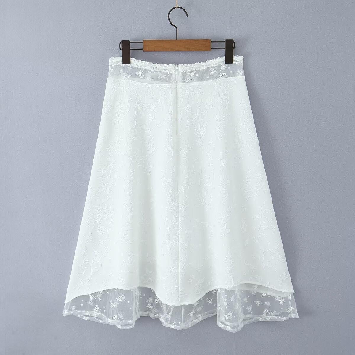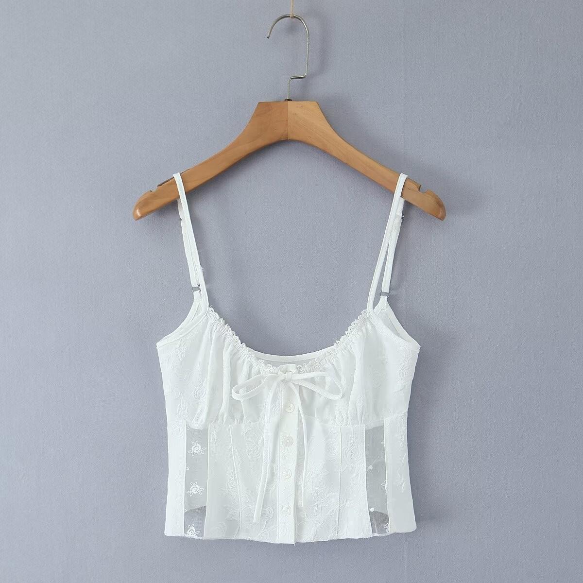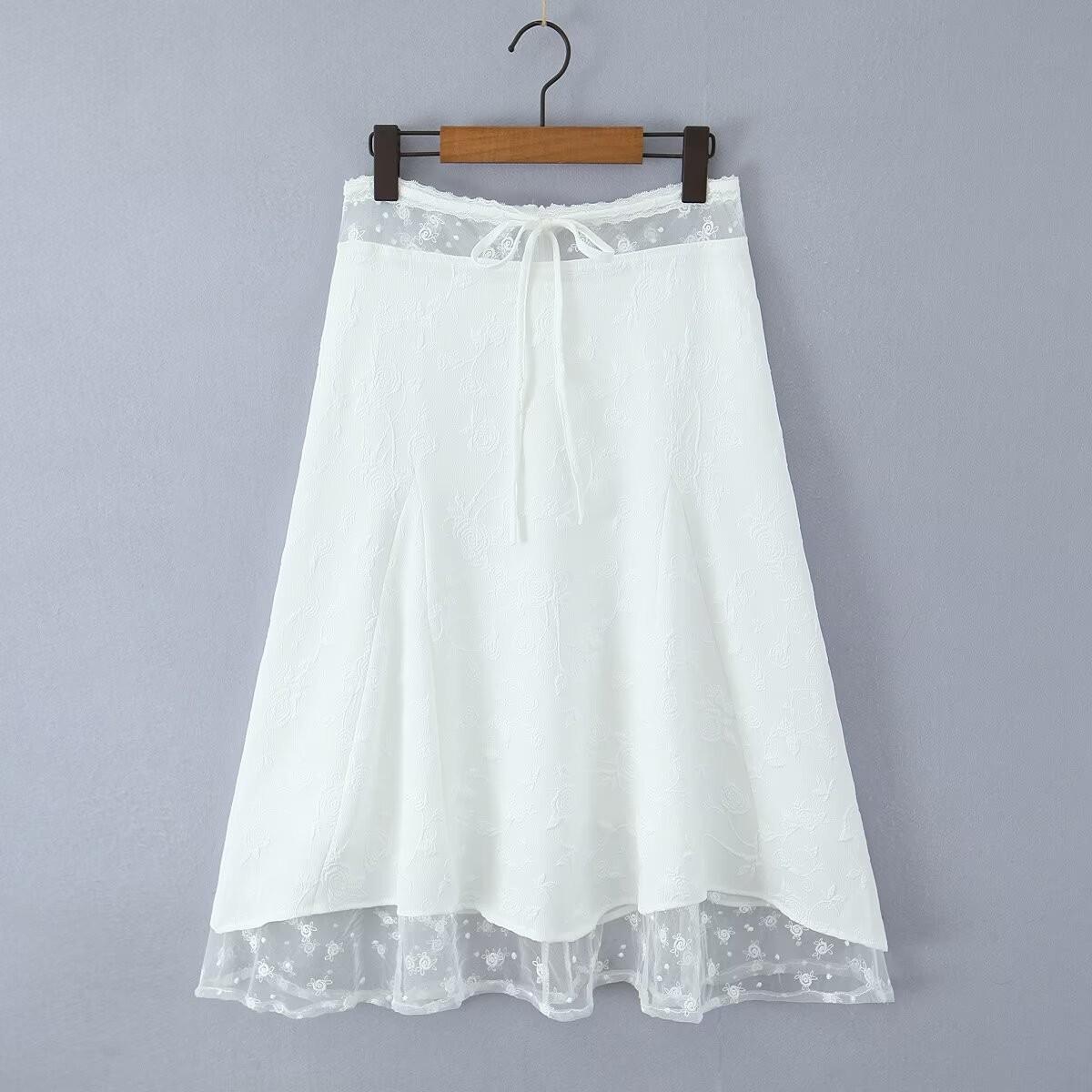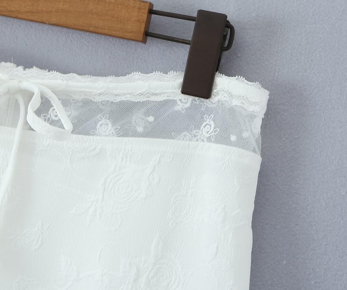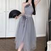 Francés Sexy Malla Empalmada Lazo en Relieve Pequeño Camisola + Falda Cintura Alta Falda Larga Traje