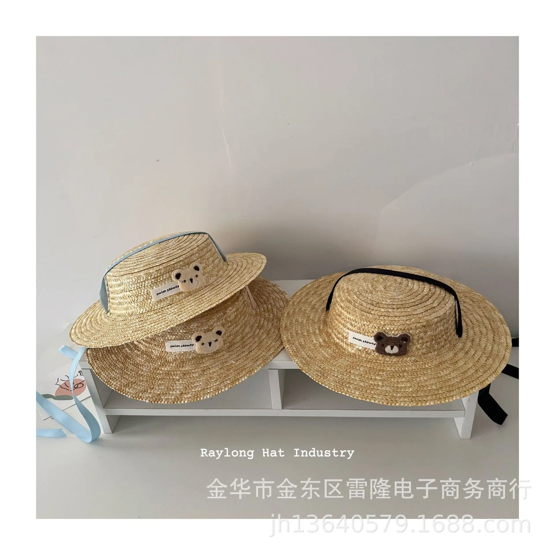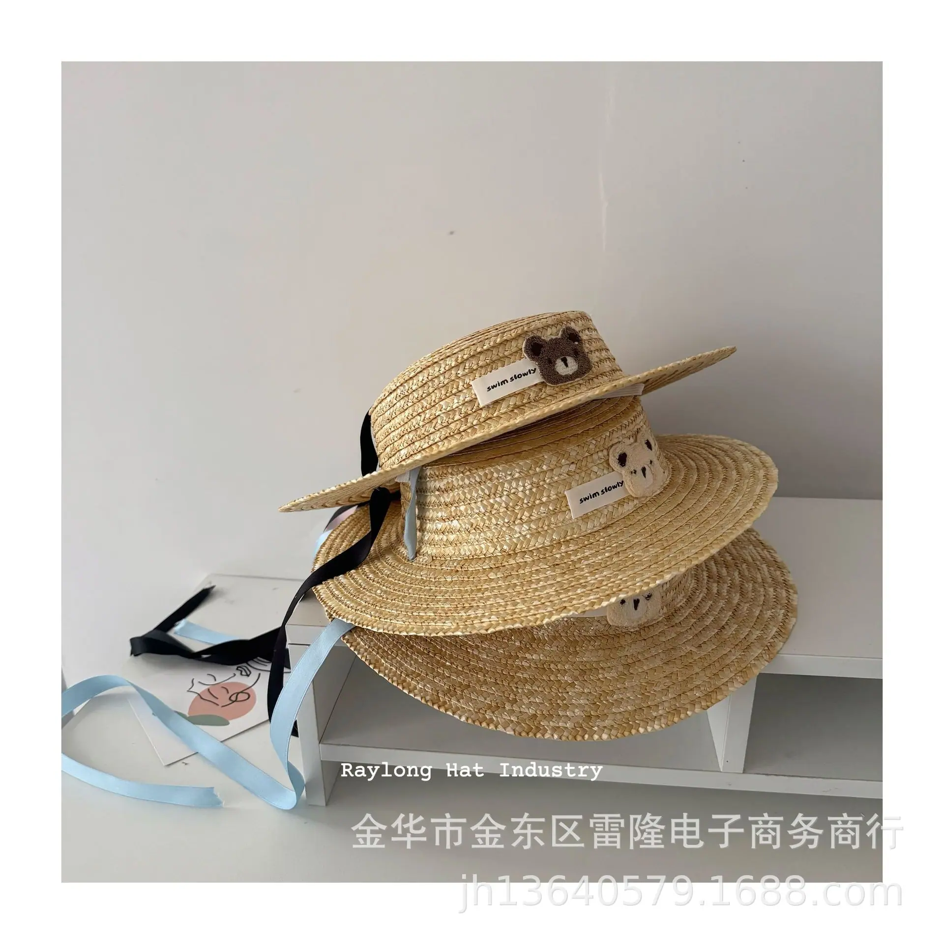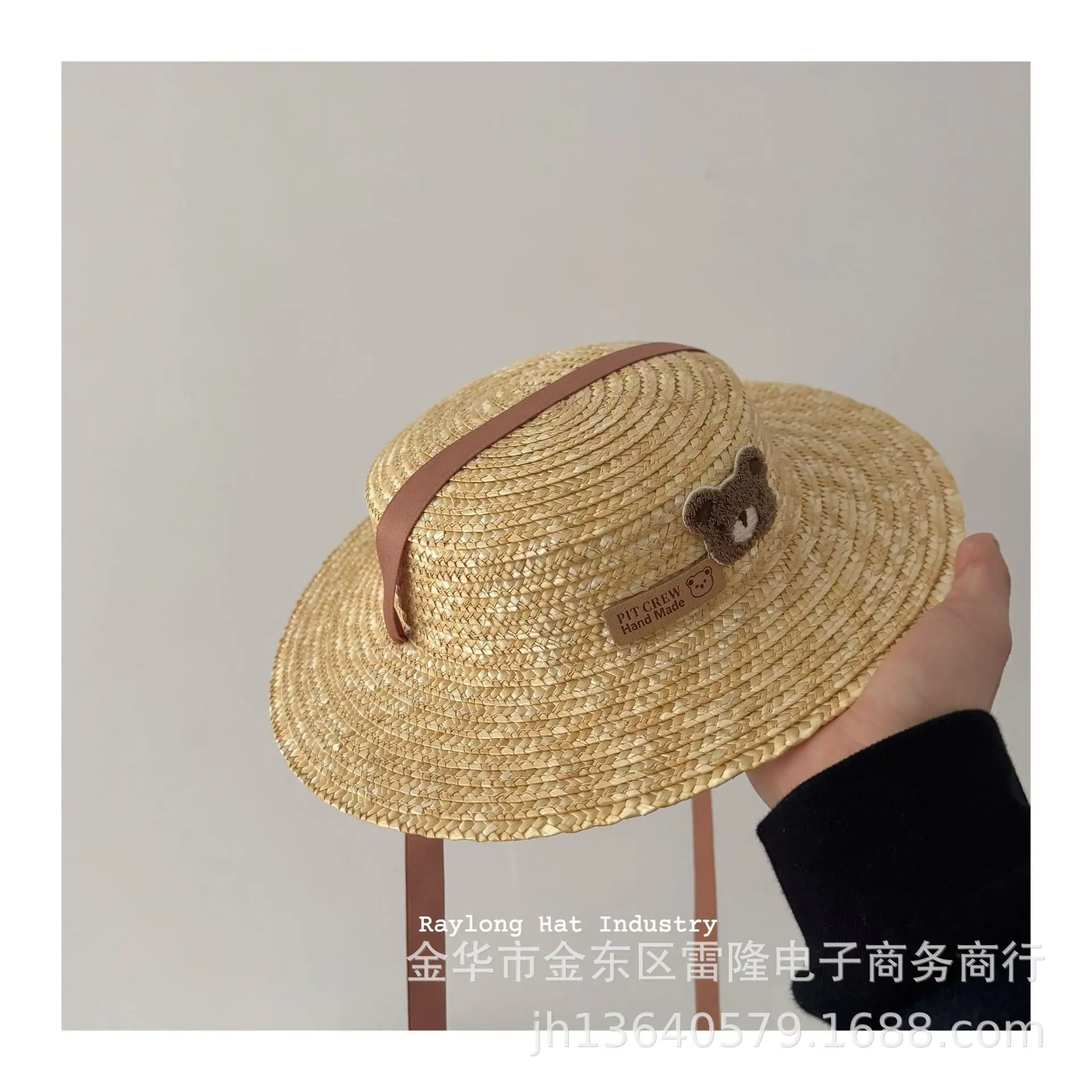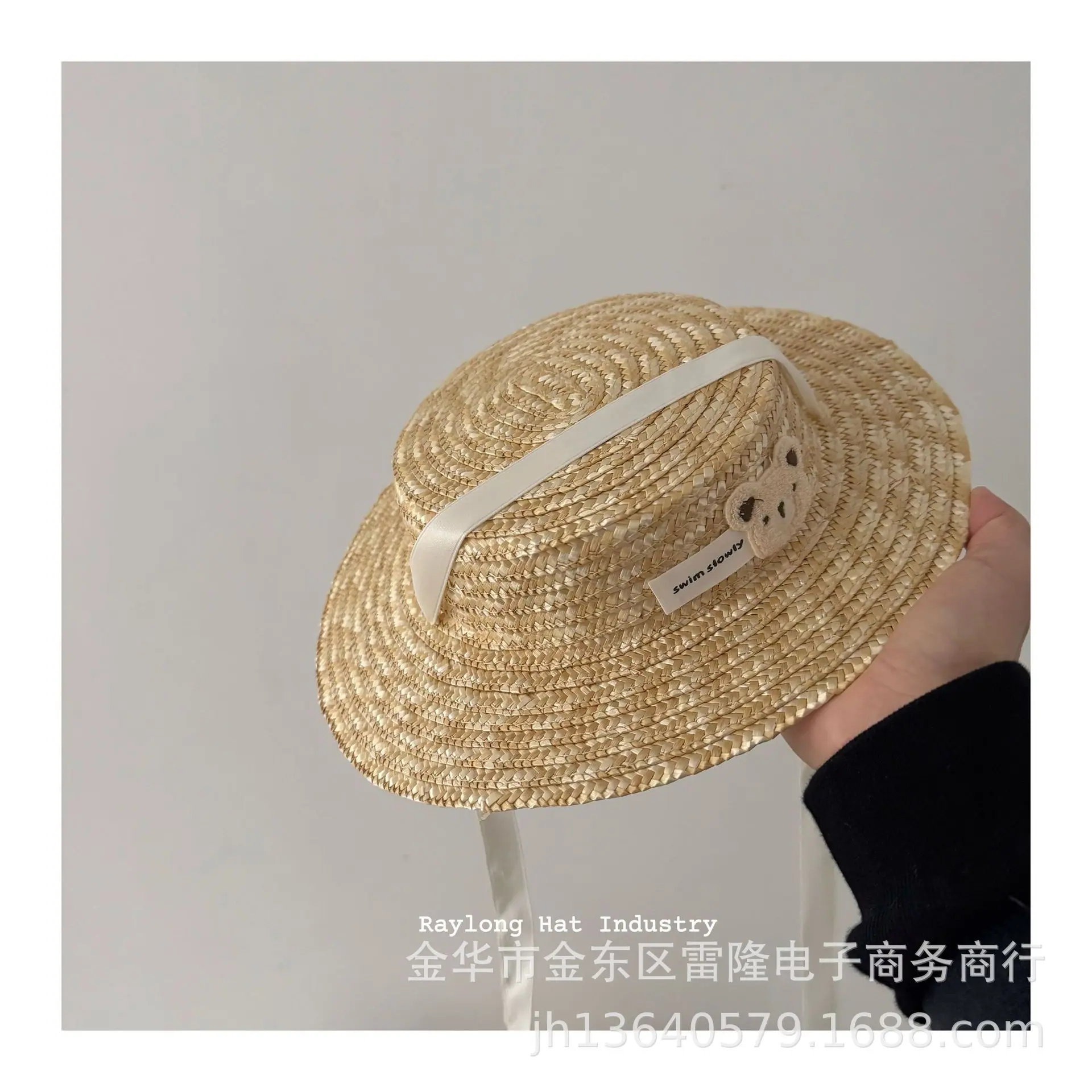 Sombrero de Paja de Ala Plana Hecho a Mano para Niños al Estilo Coreano con Cinta, Sombrero de Cubo de Oso para Protección Solar de Verano