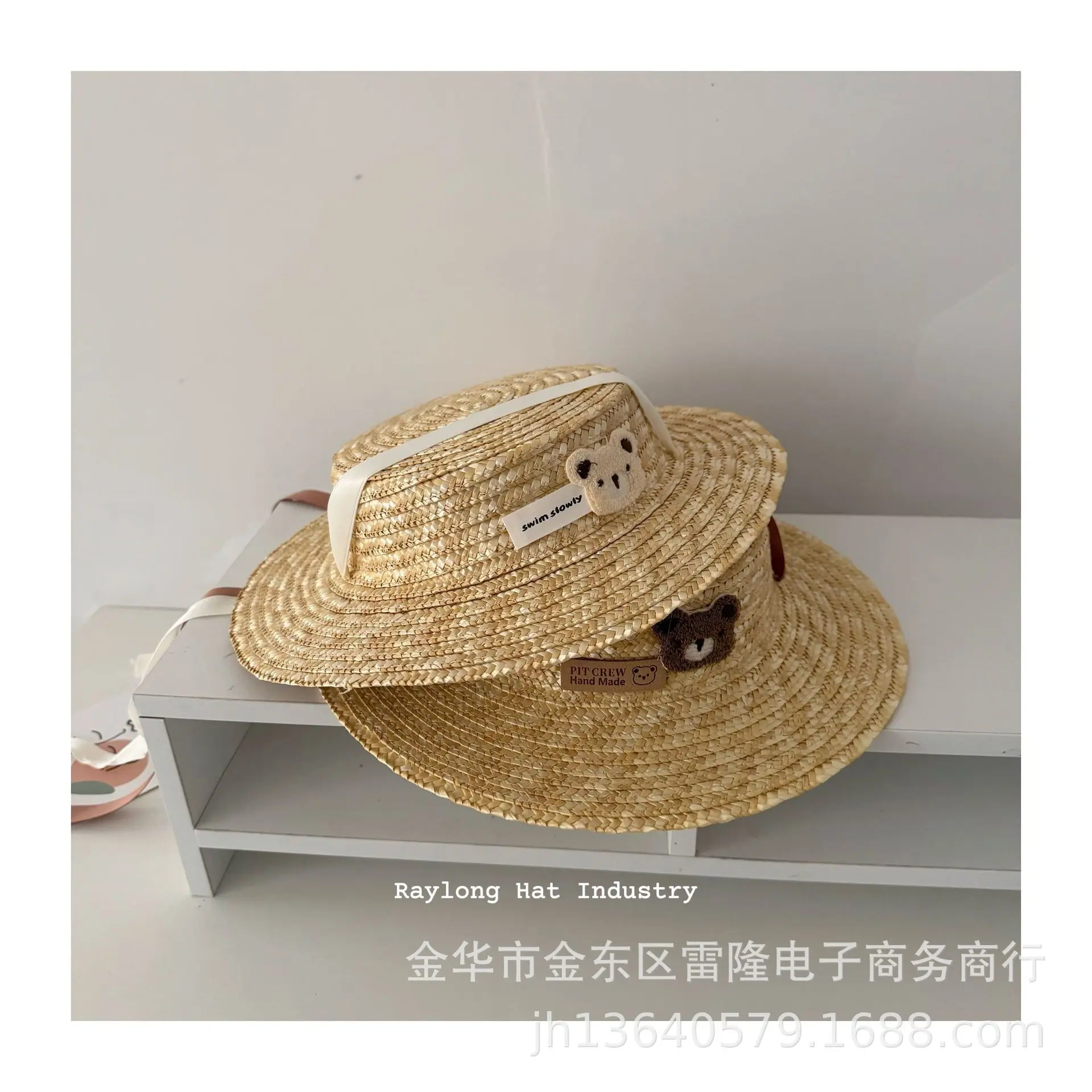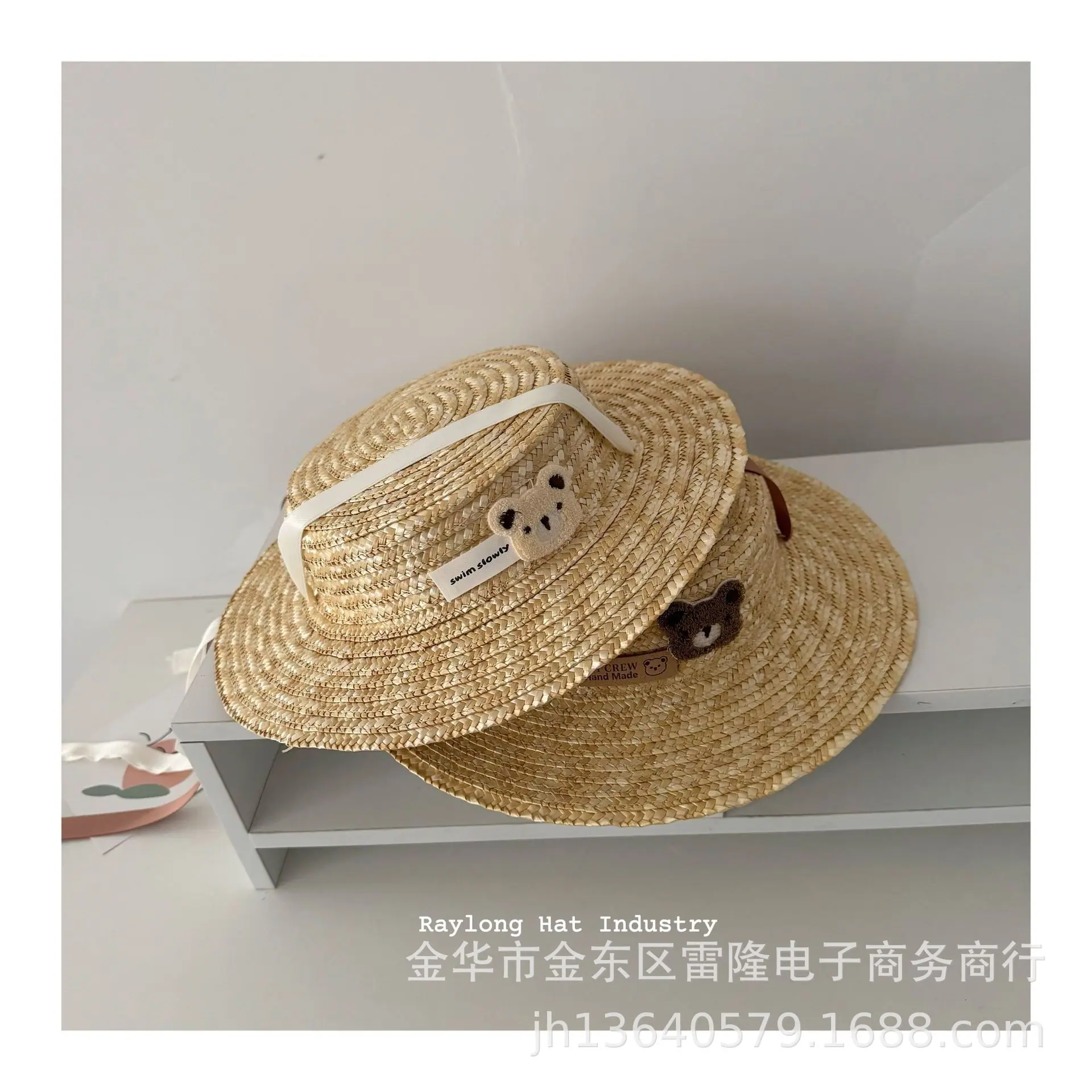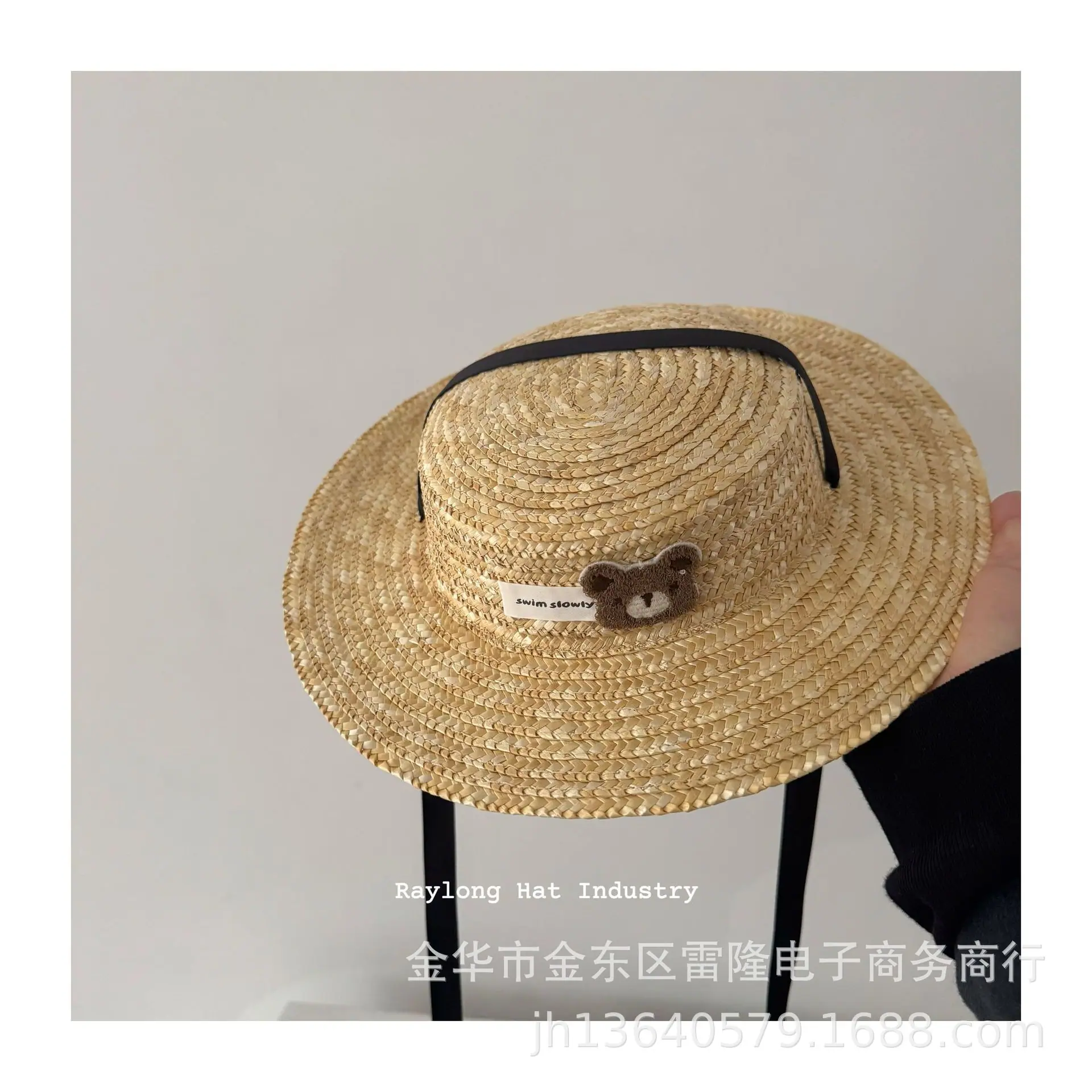 Sombrero de Paja de Ala Plana Hecho a Mano para Niños al Estilo Coreano con Cinta, Sombrero de Cubo de Oso para Protección Solar de Verano