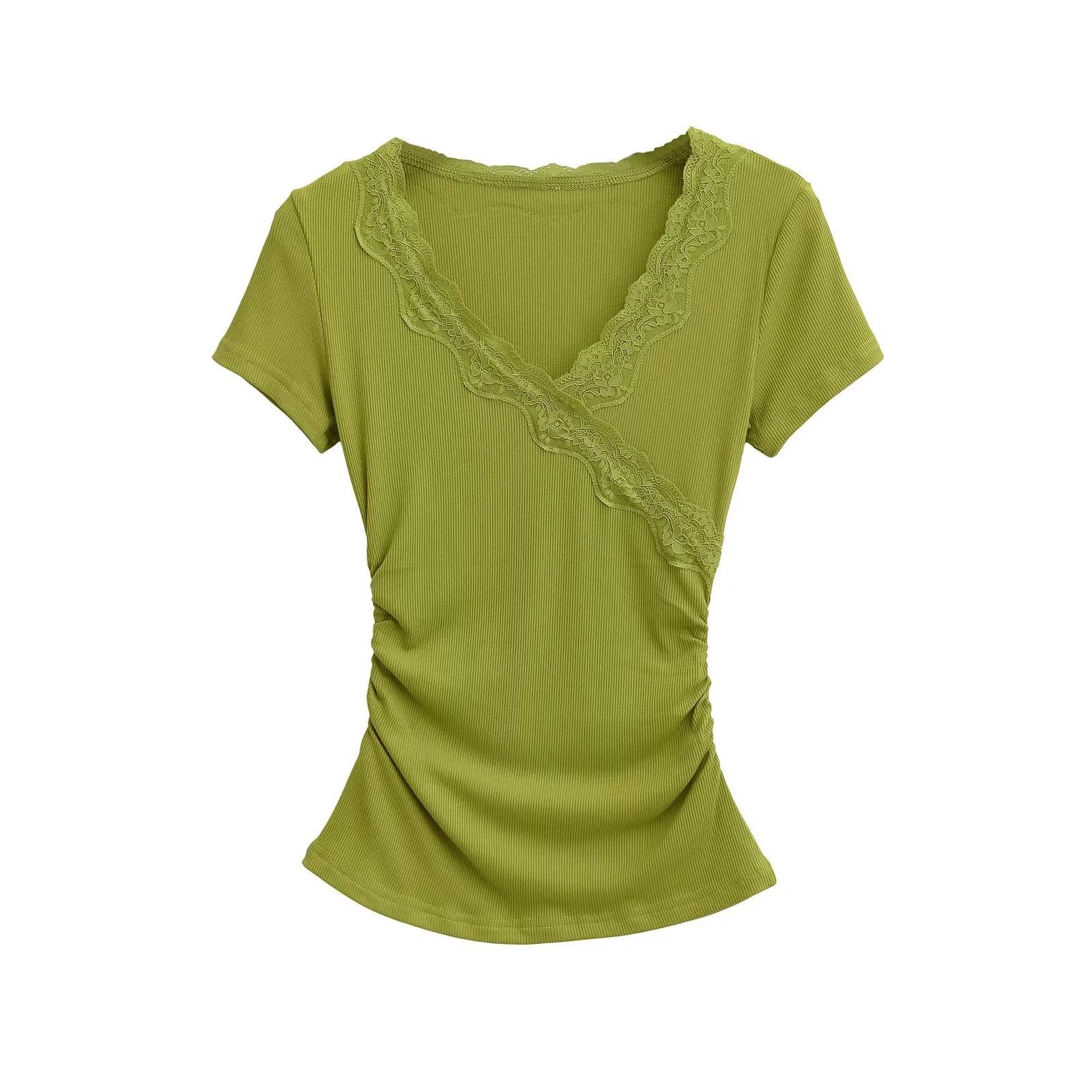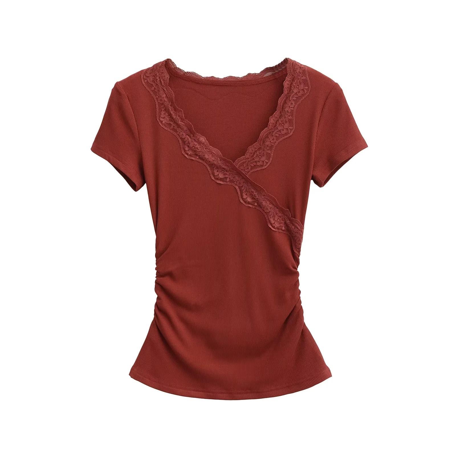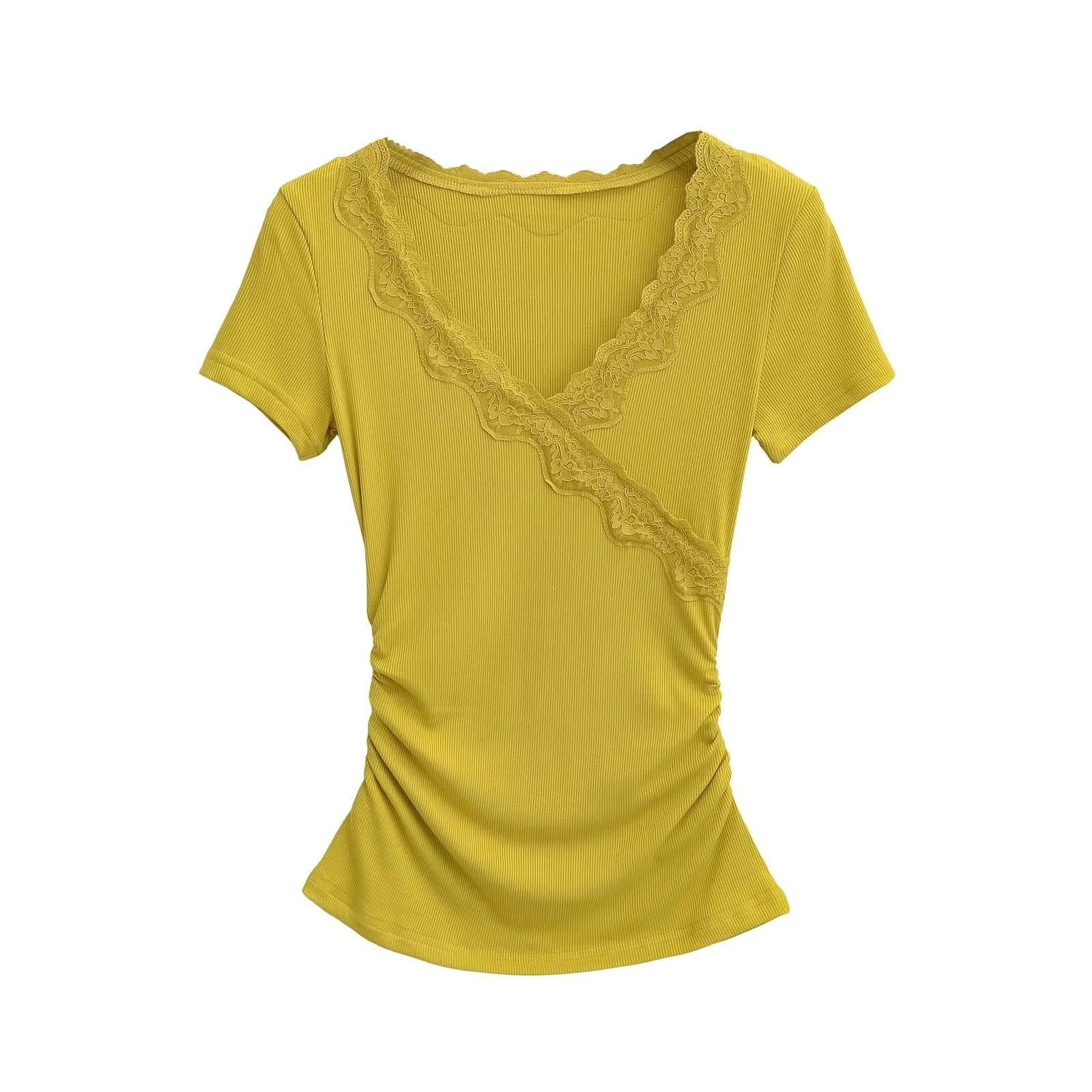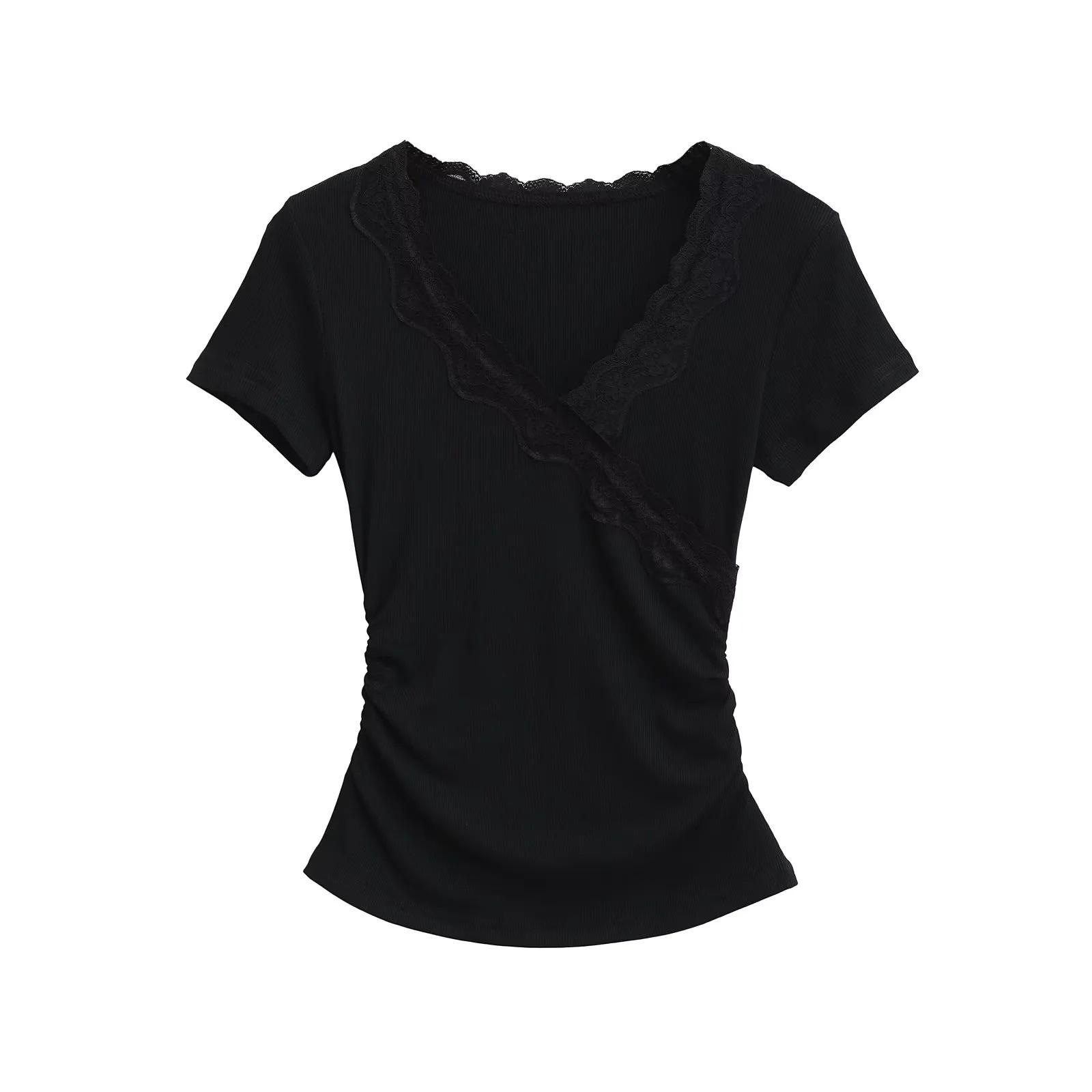 Compra Playera de Encaje con Cuello en V y Manga Corta para Mujer 2025 Verano Nuevo Estilo Ajuste Slim Slim Corta Hombro Derecho Nicho Top al por mayor en Joom.pro