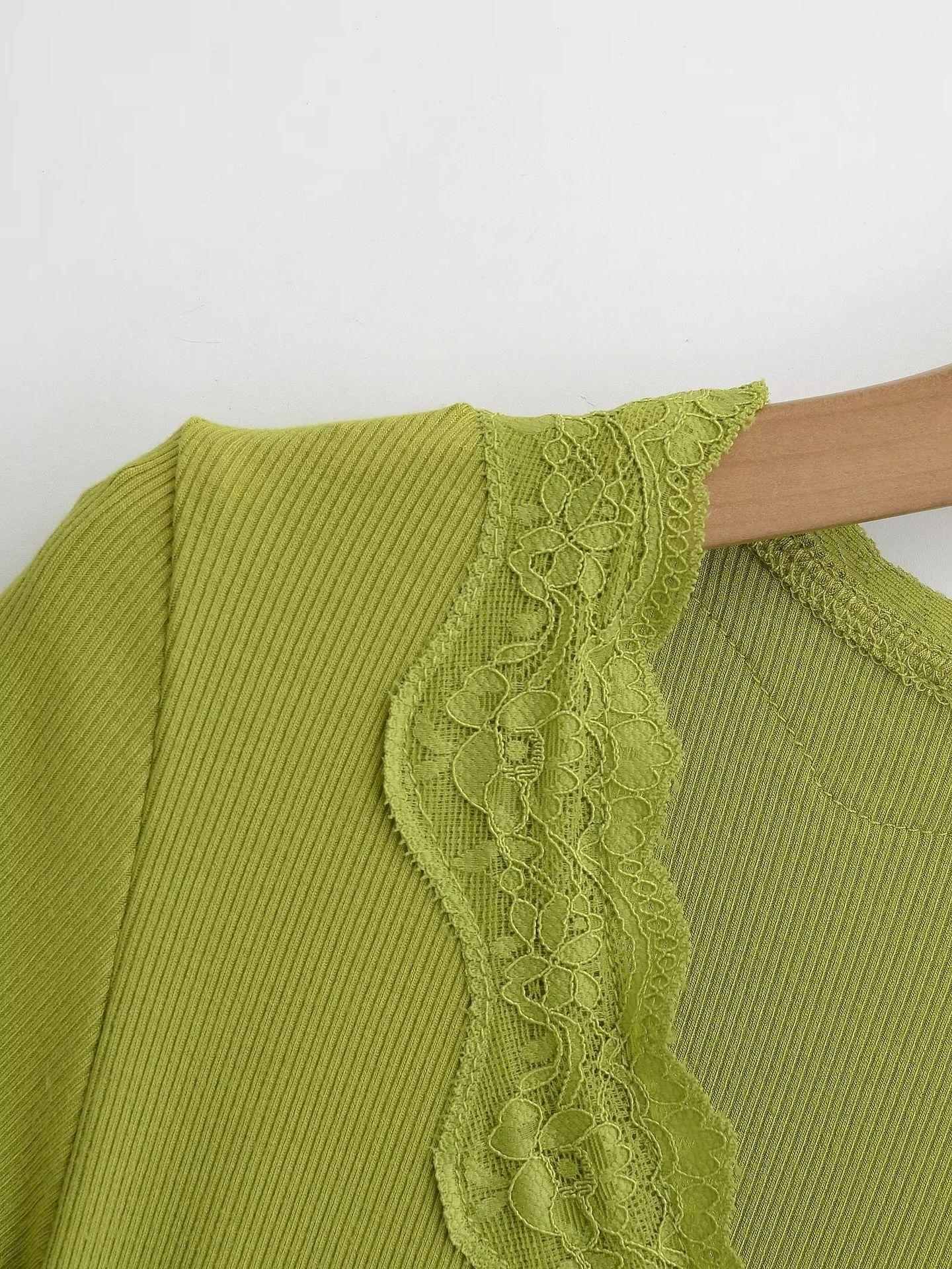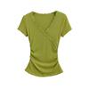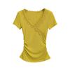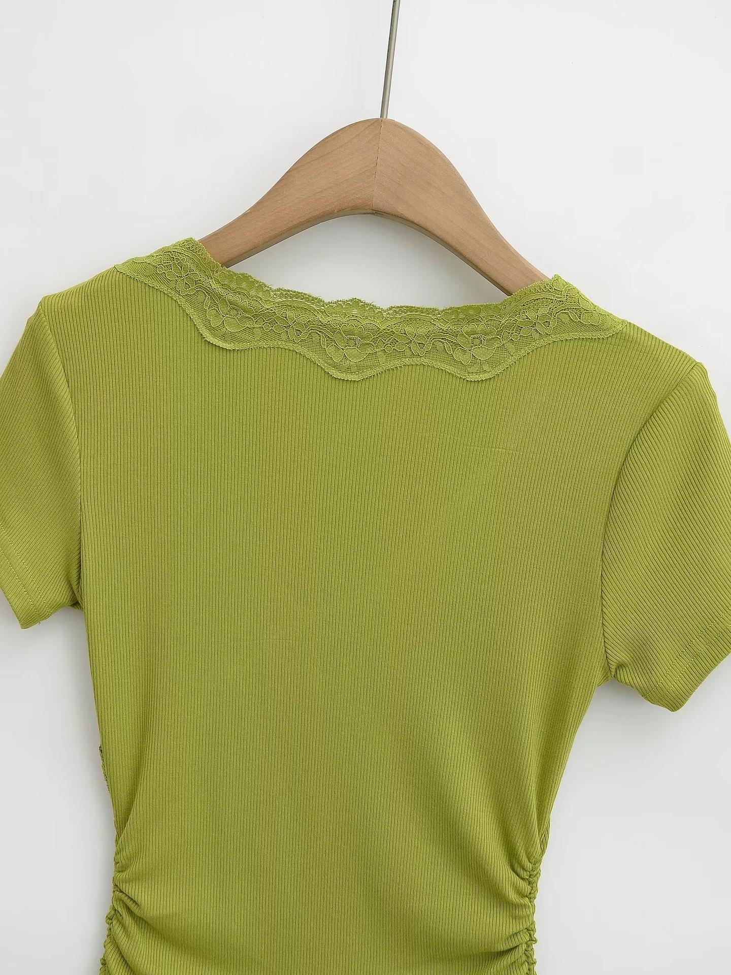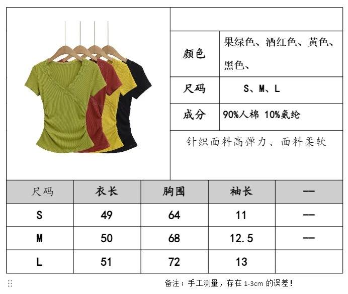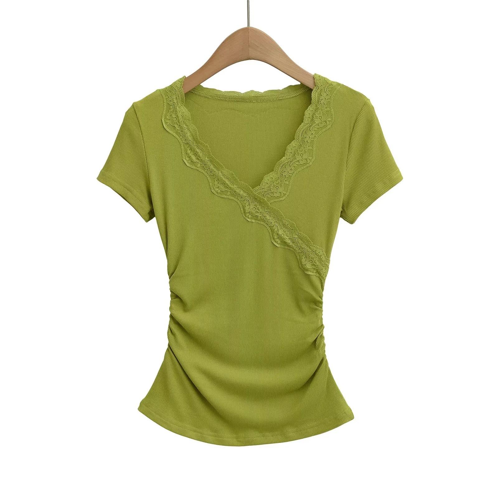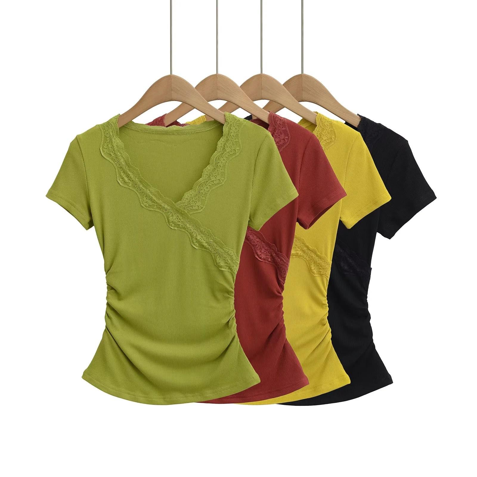 Compra Playera de Encaje con Cuello en V y Manga Corta para Mujer 2025 Verano Nuevo Estilo Ajuste Slim Slim Corta Hombro Derecho Nicho Top al por mayor en Joom.pro