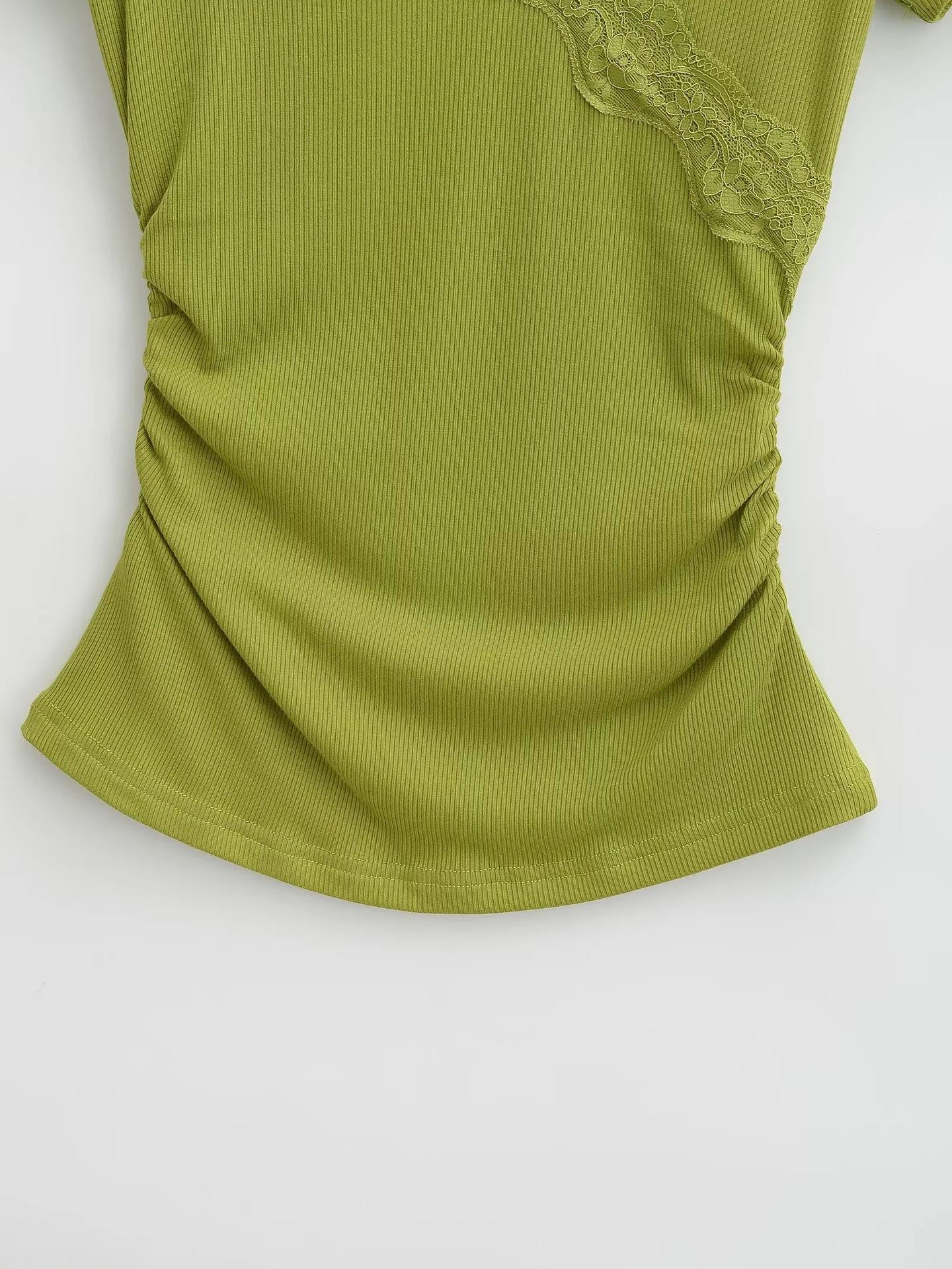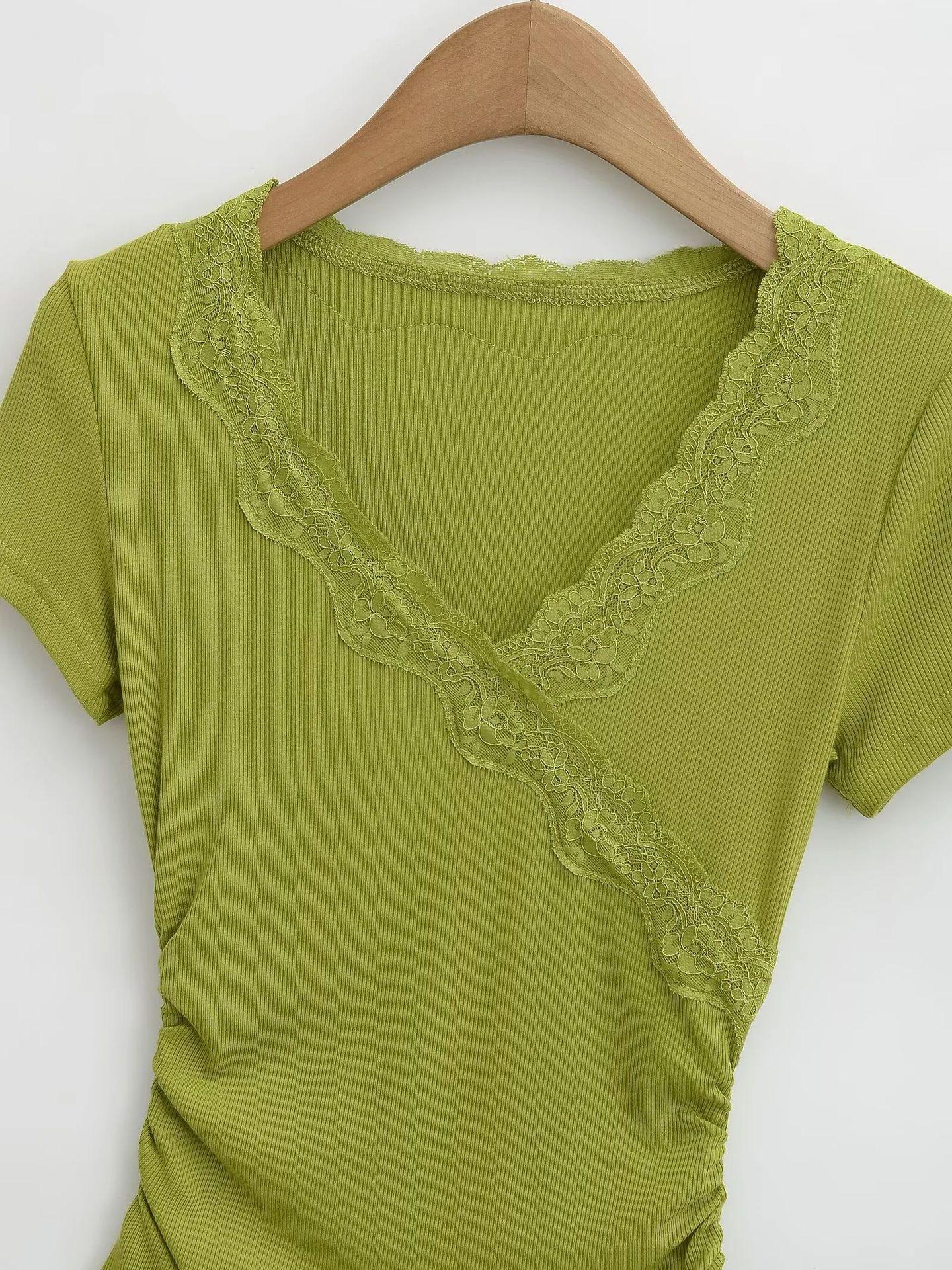 Playera de Encaje con Cuello en V y Manga Corta para Mujer 2025 Verano Nuevo Estilo Ajuste Slim Slim Hombro Derecho Nicho Top