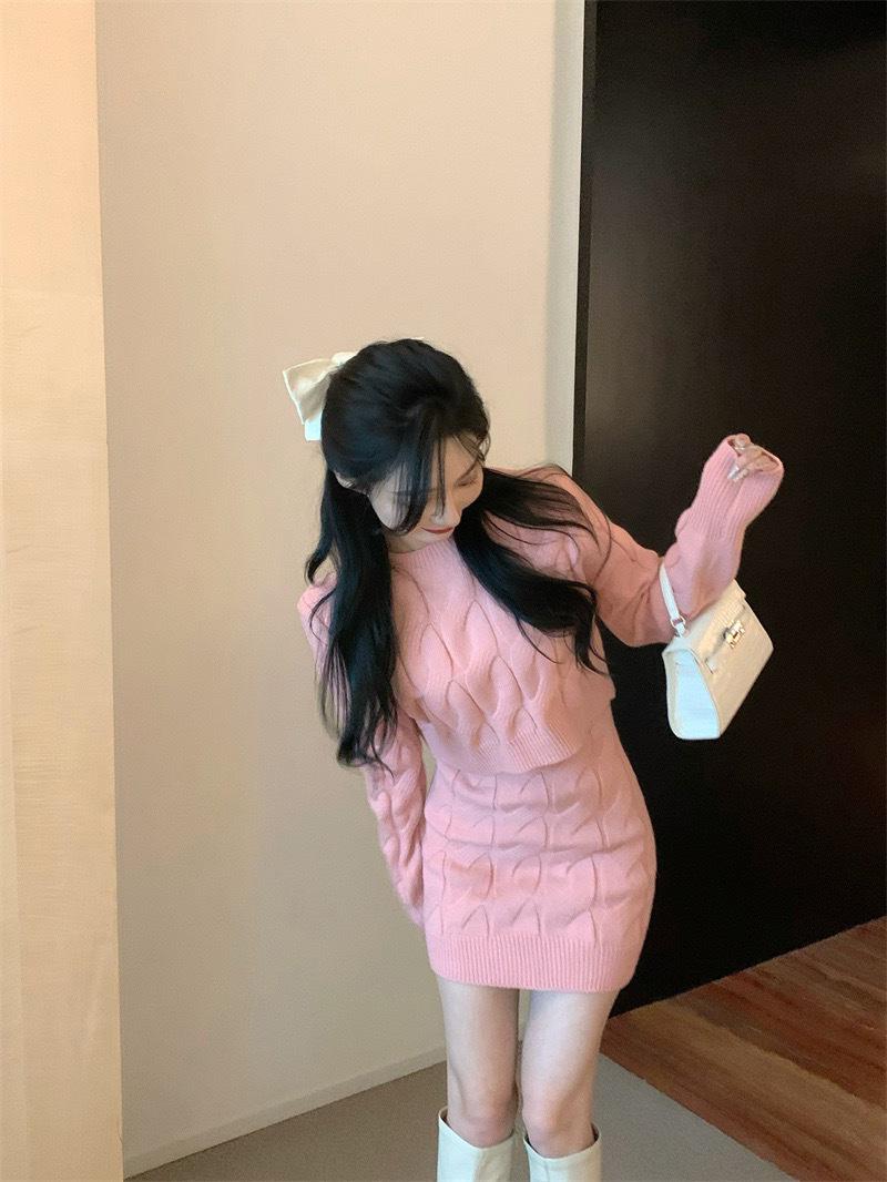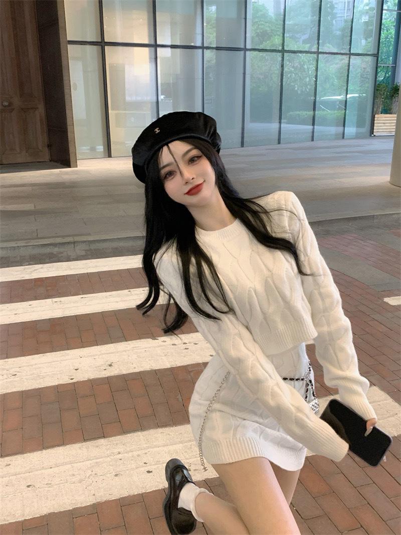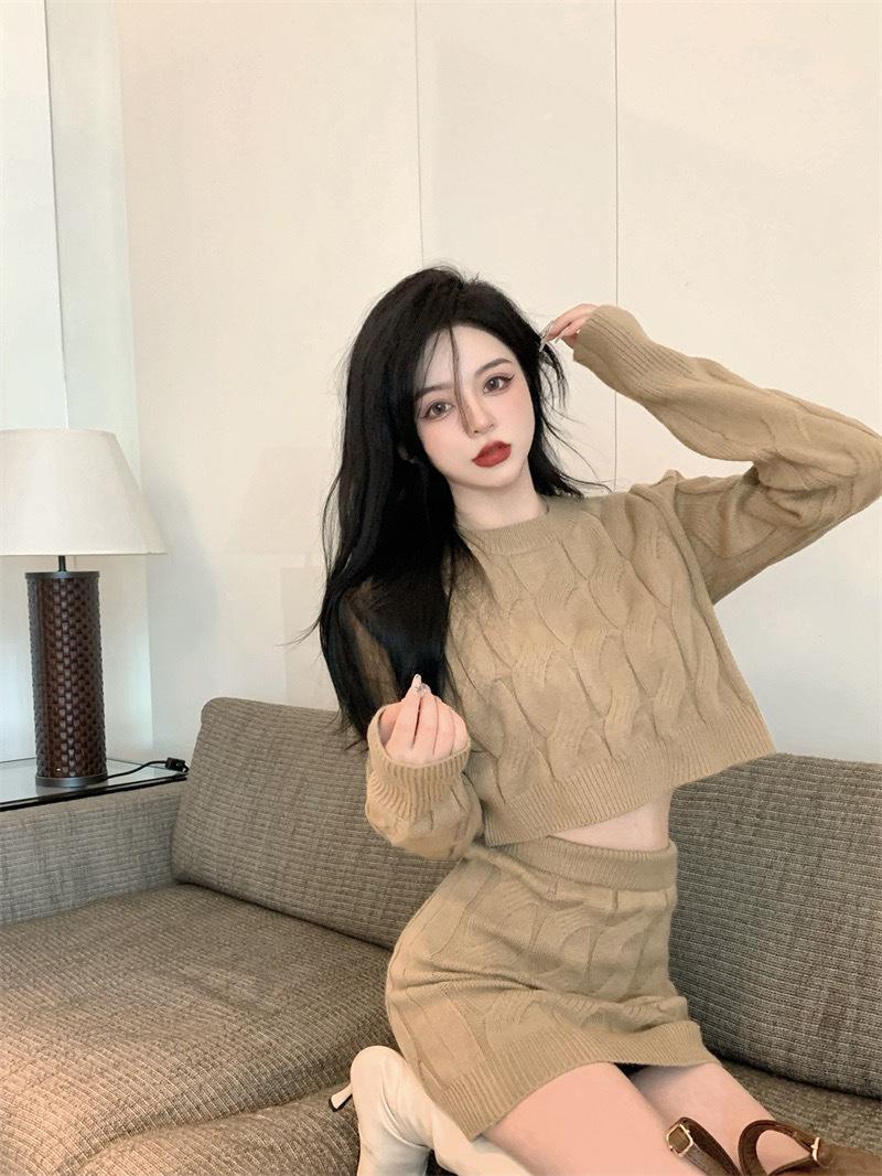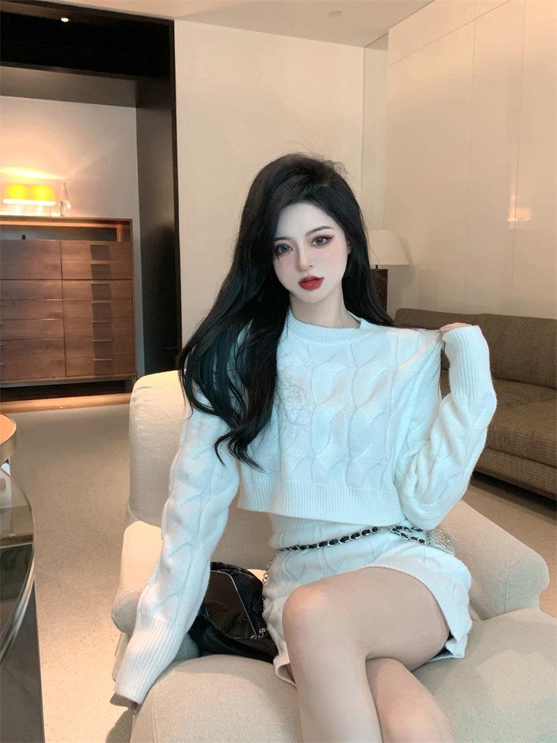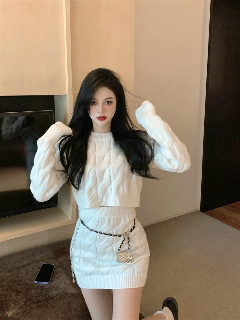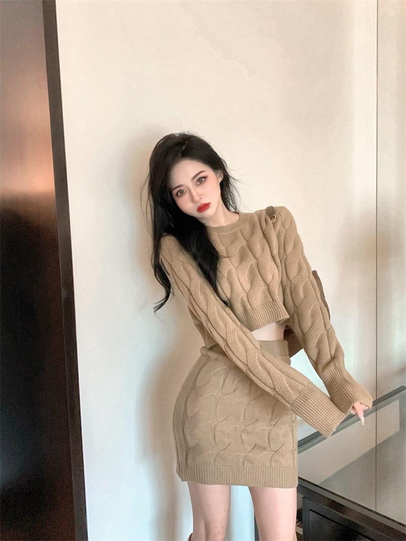 Conjunto de suéter tejido estilo celebridad de internet otoño e invierno para mujer, corte ajustado, manga larga gruesa, punto de cable, cintura alta, falda corta envolvente de cadera, conjunto de dos piezas