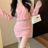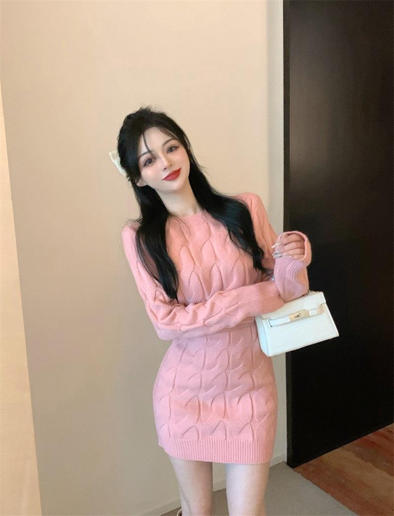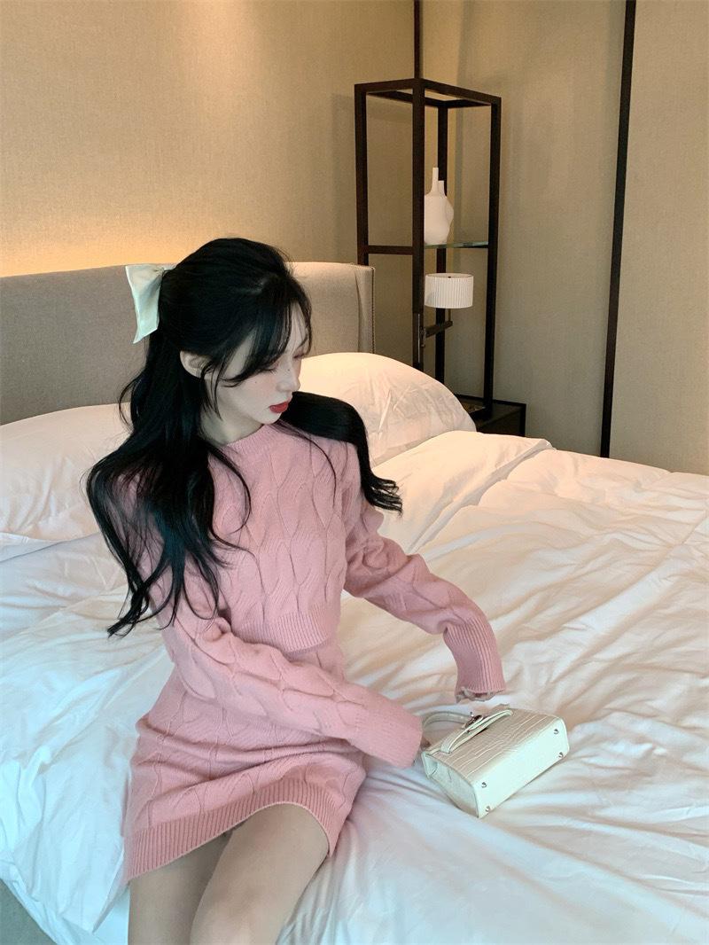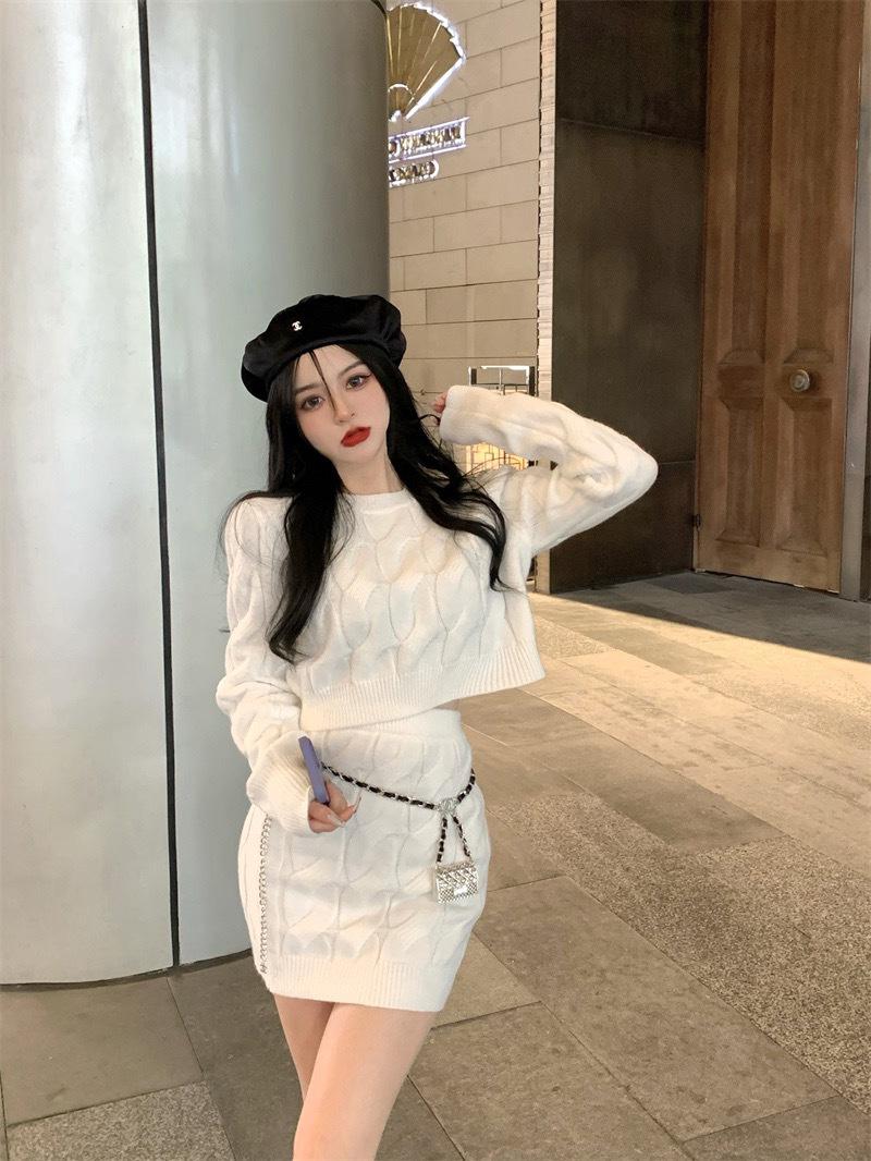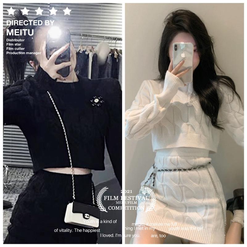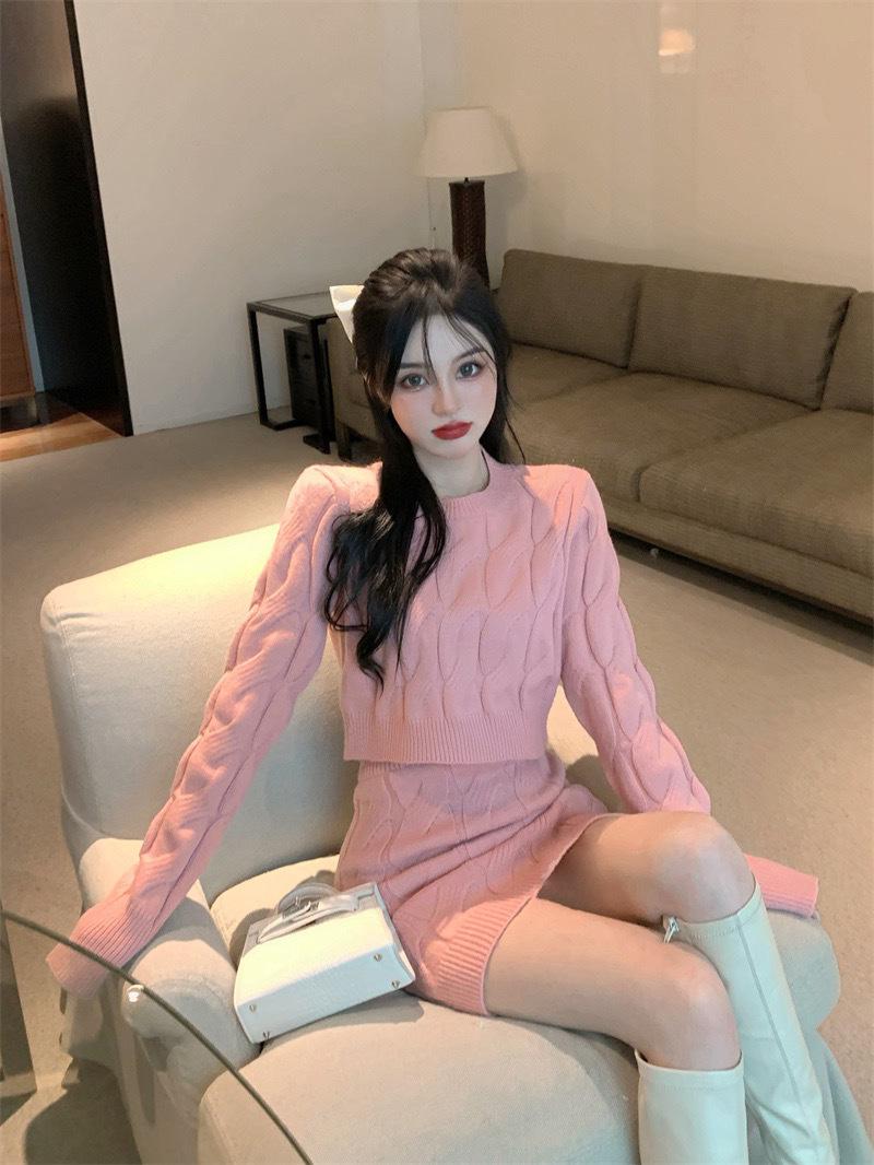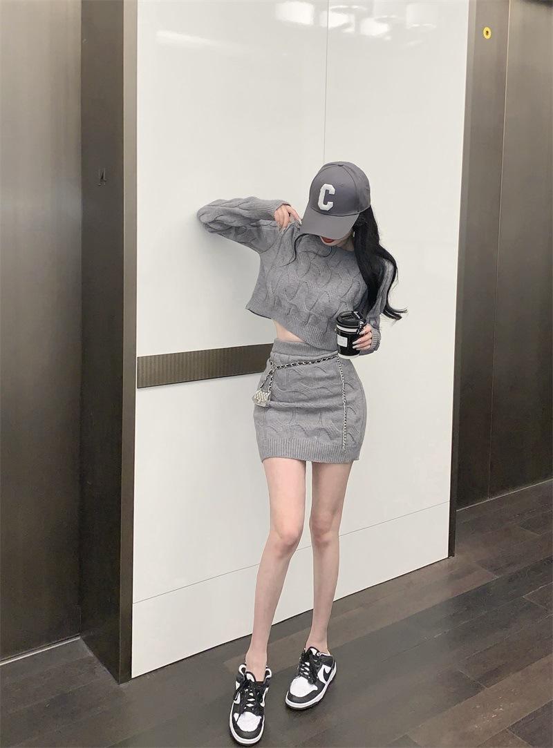 Conjunto de suéter tejido estilo celebridad de internet otoño e invierno para mujer, corte ajustado, manga larga gruesa, punto de cable, cintura alta, falda corta envolvente de cadera, conjunto de dos piezas