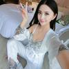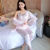 Primavera y Otoño Estilo Caliente Manga Larga Sexy Encaje Seda de Hielo Camisola Conjunto de Tres Piezas Ropa de Casa Pijama Venta al por Mayor Envío Directo
