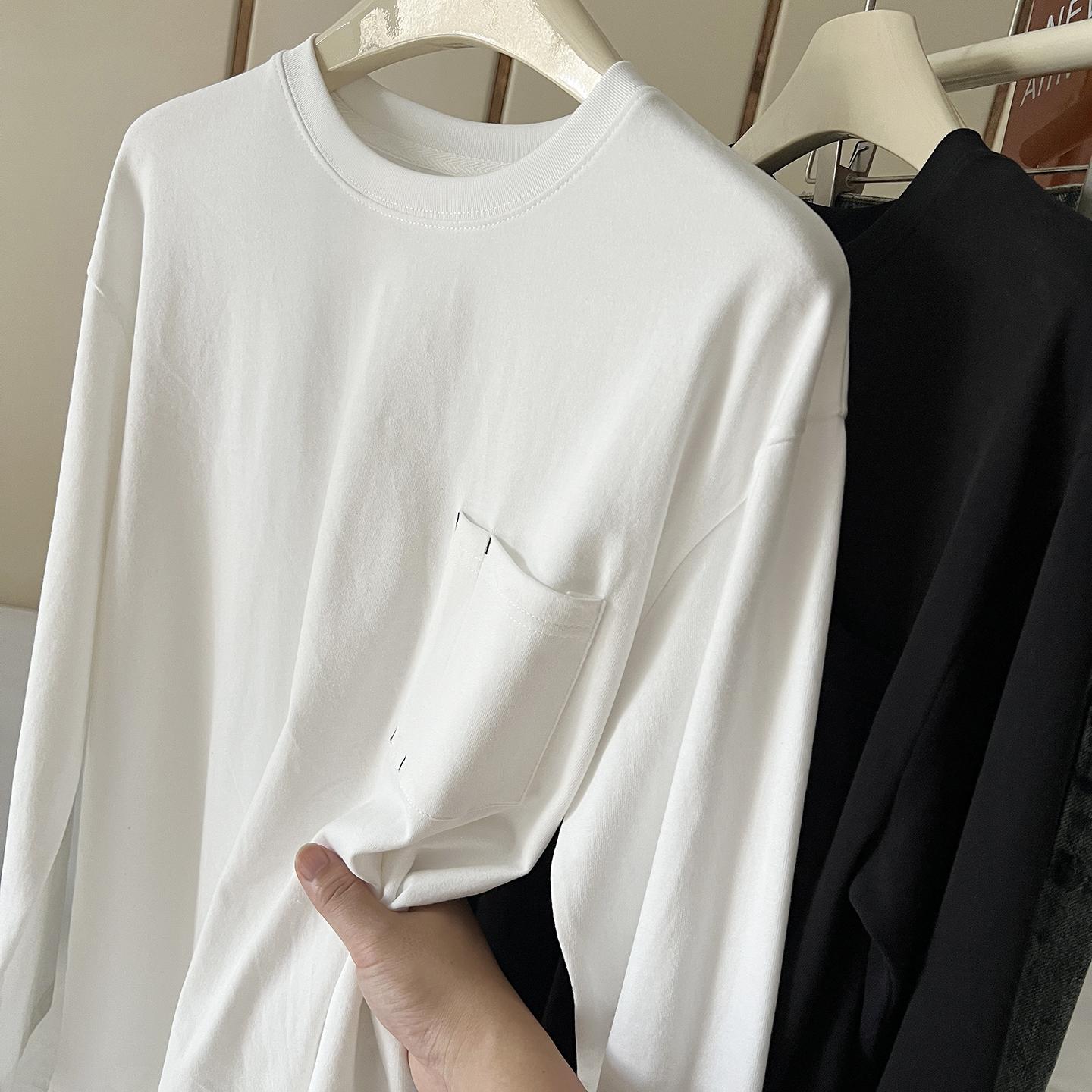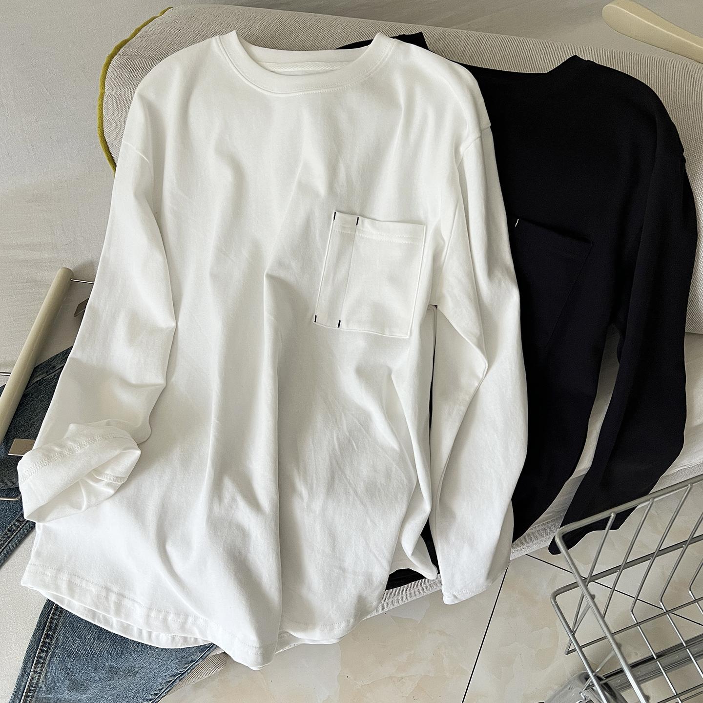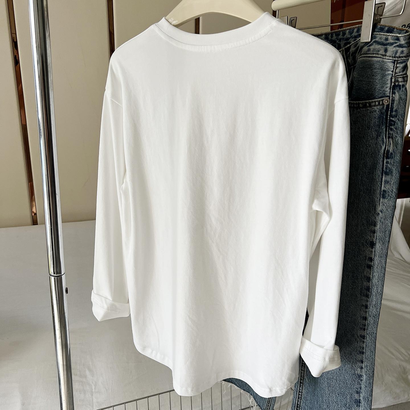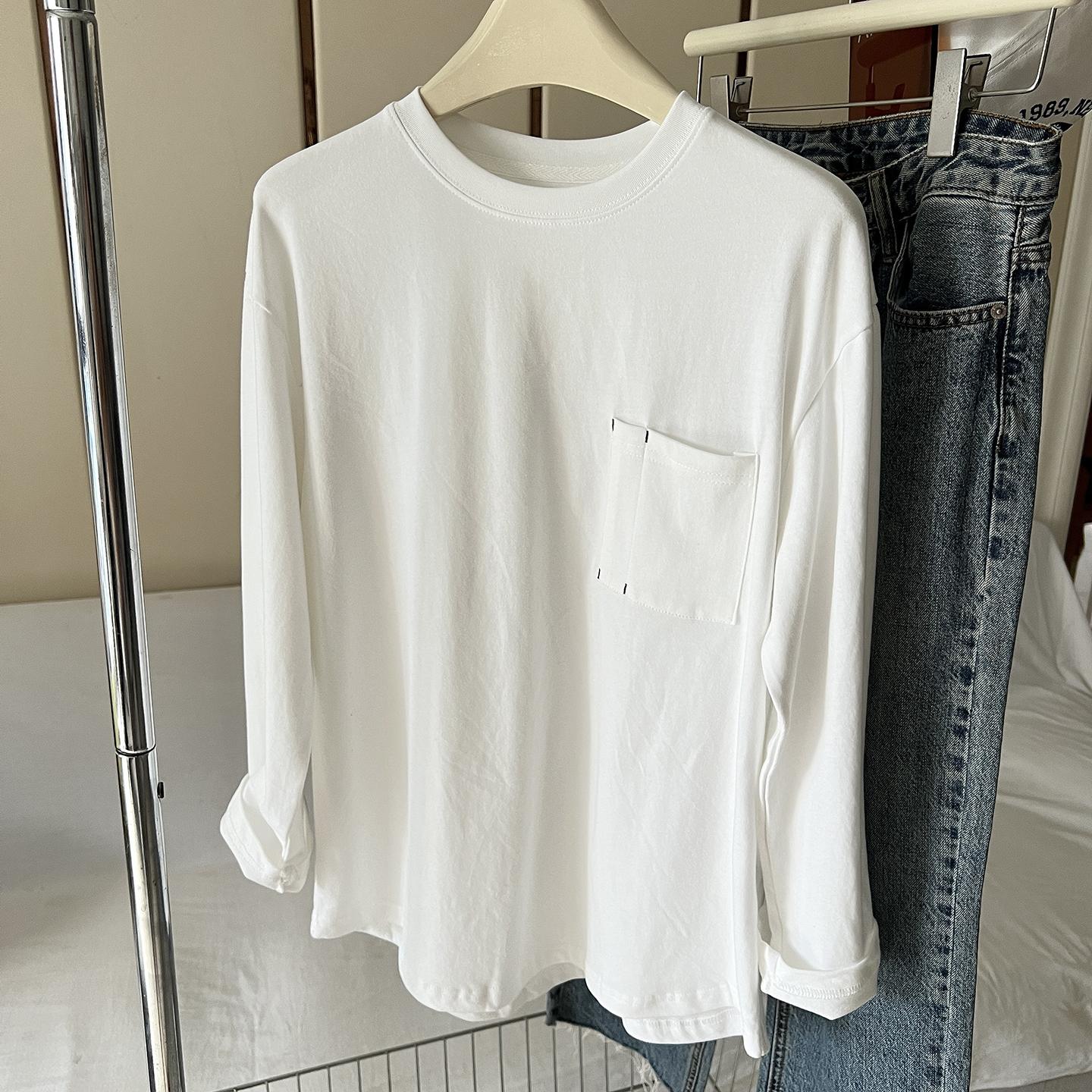 Compra Playera Blanca de Manga Larga para Mujer, Largo Medio, Otoño, Bordado de Bolsillo, Cuello Redondo Holgado, Top Casual, Algodón Puro, Capa Base al por mayor en Joom.pro