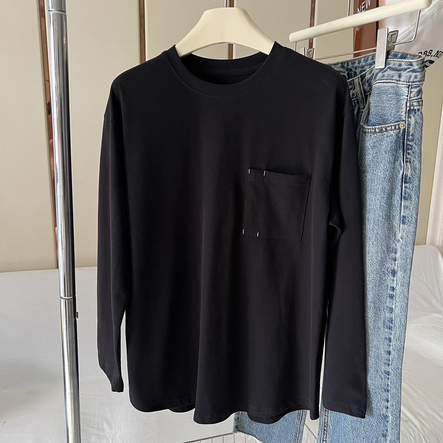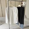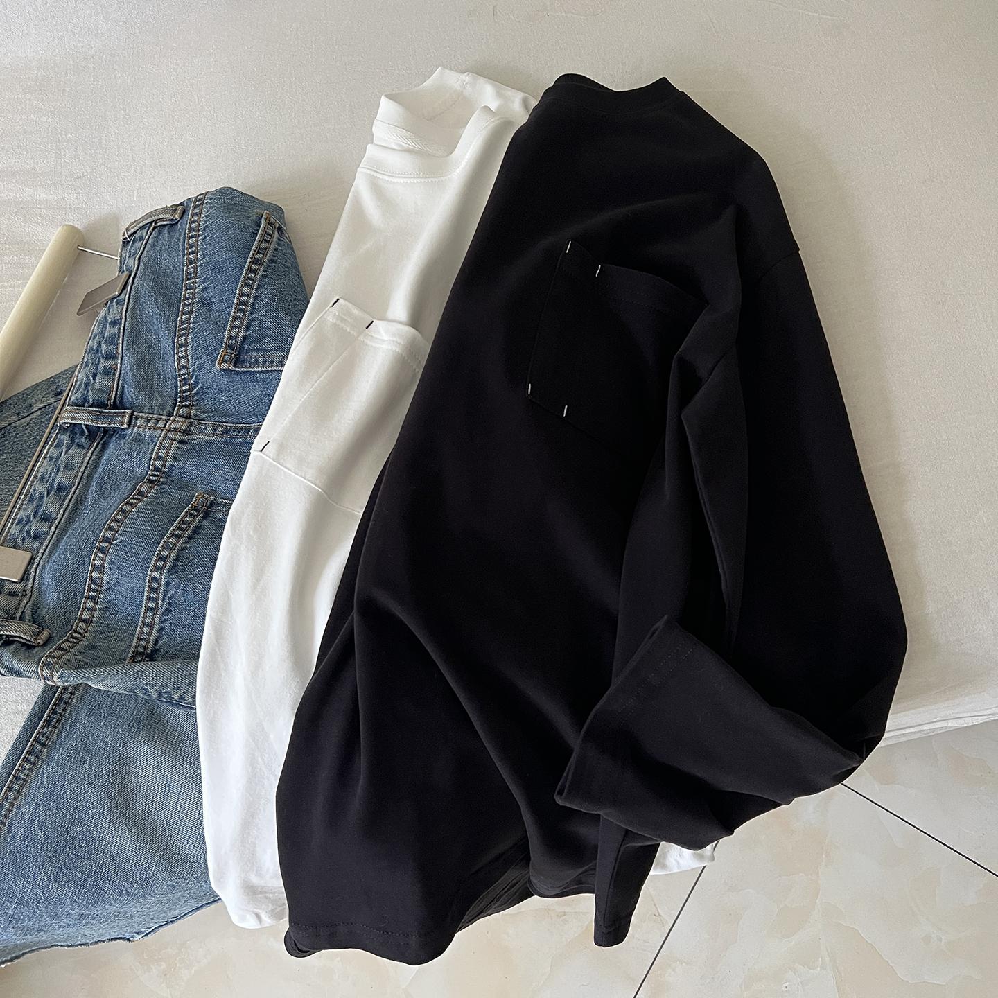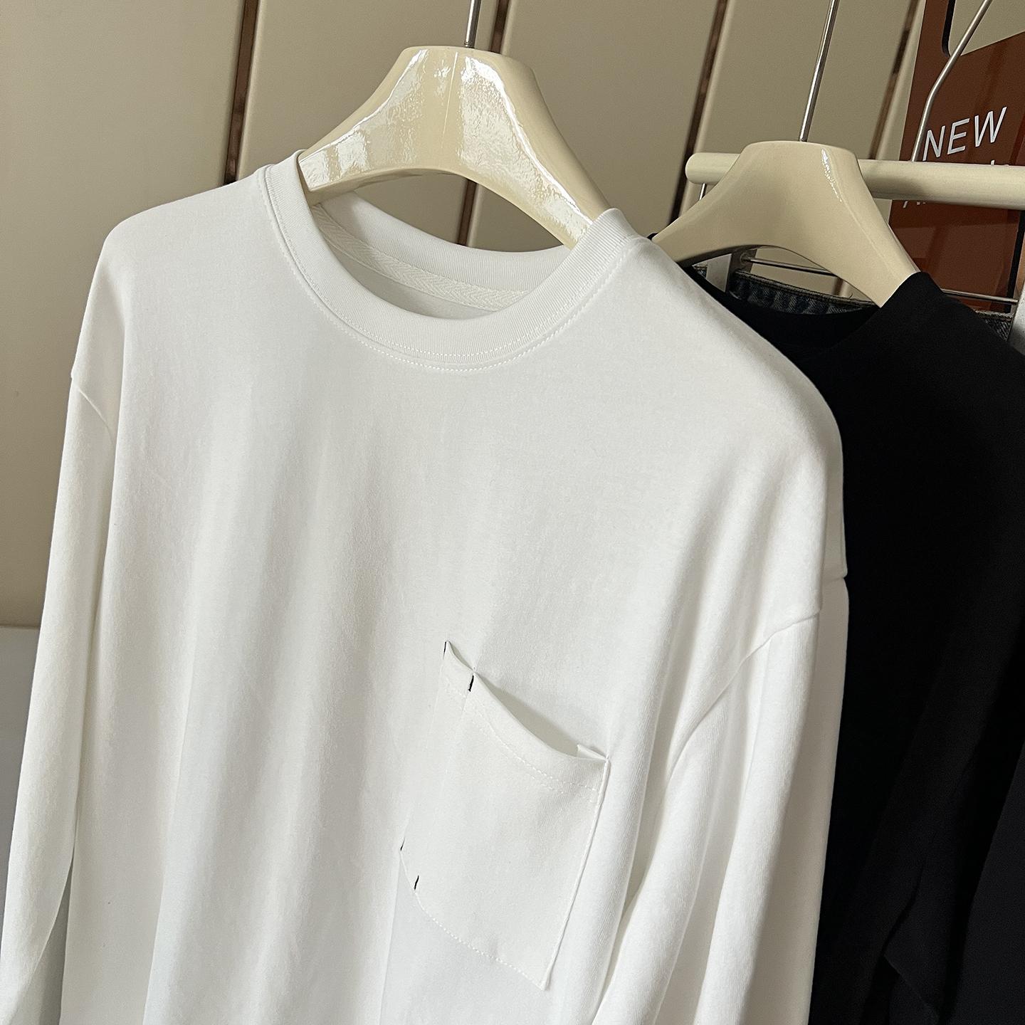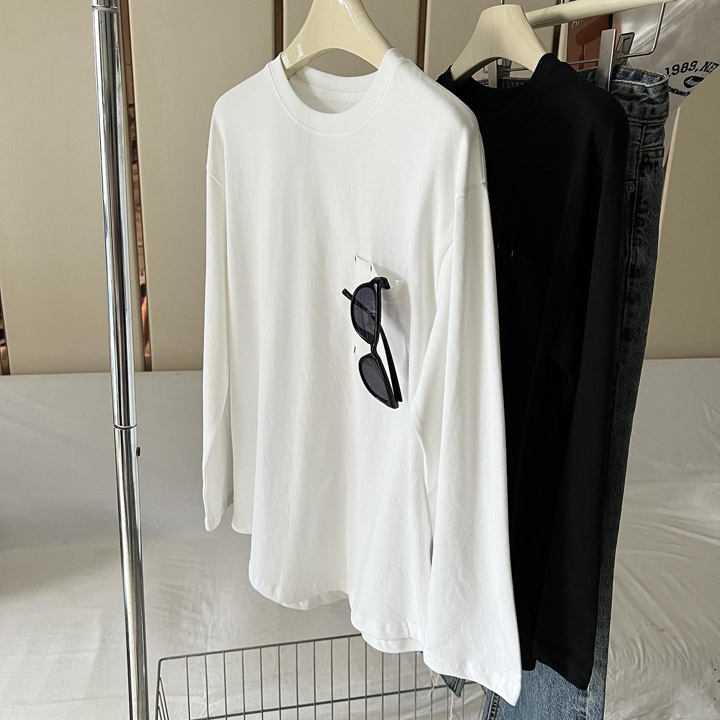 Compra Playera Blanca de Manga Larga para Mujer, Largo Medio, Otoño, Bordado de Bolsillo, Cuello Redondo Holgado, Top Casual, Algodón Puro, Capa Base al por mayor en Joom.pro
