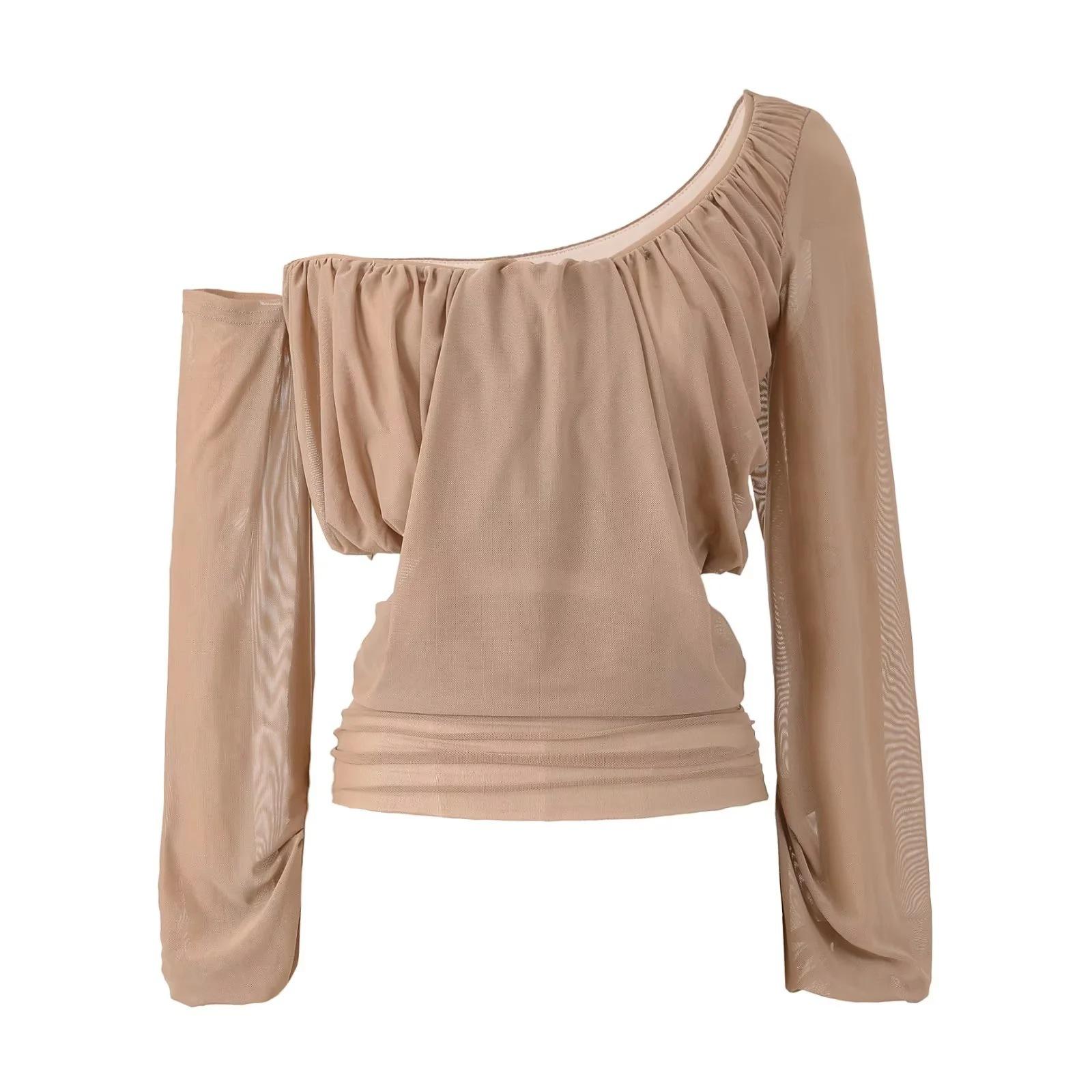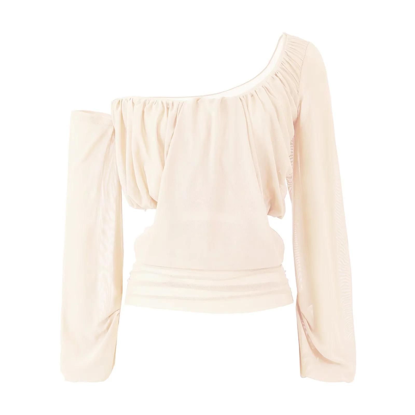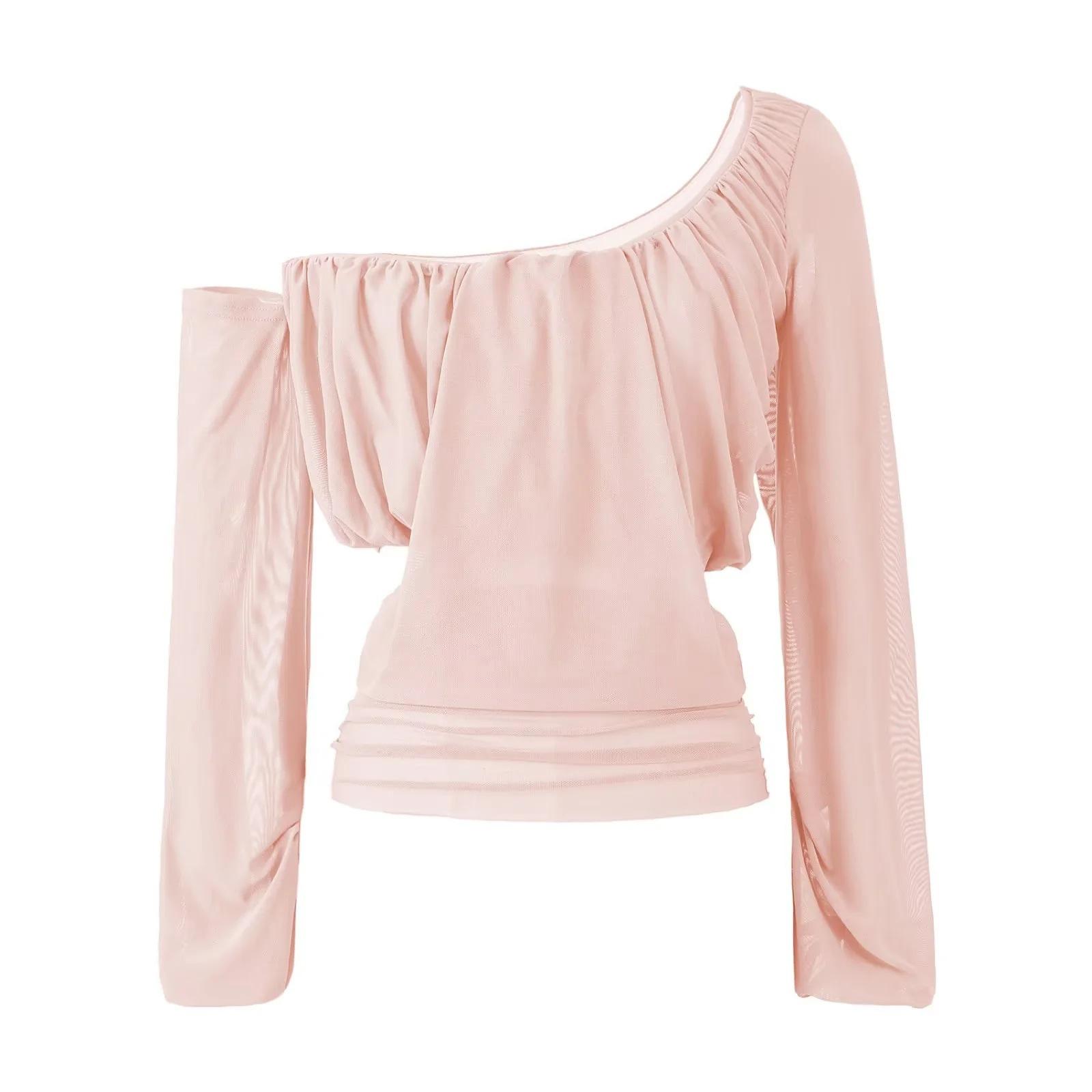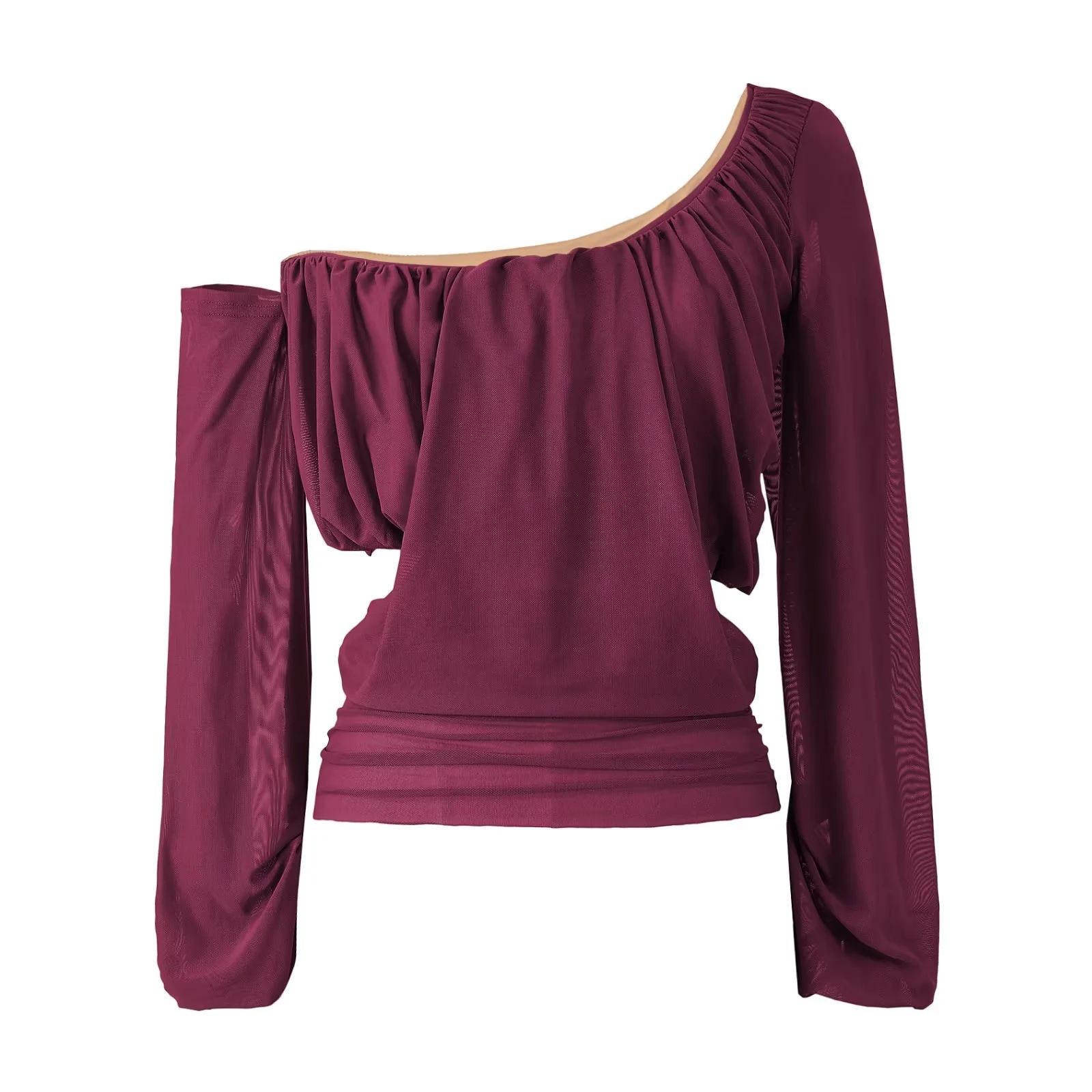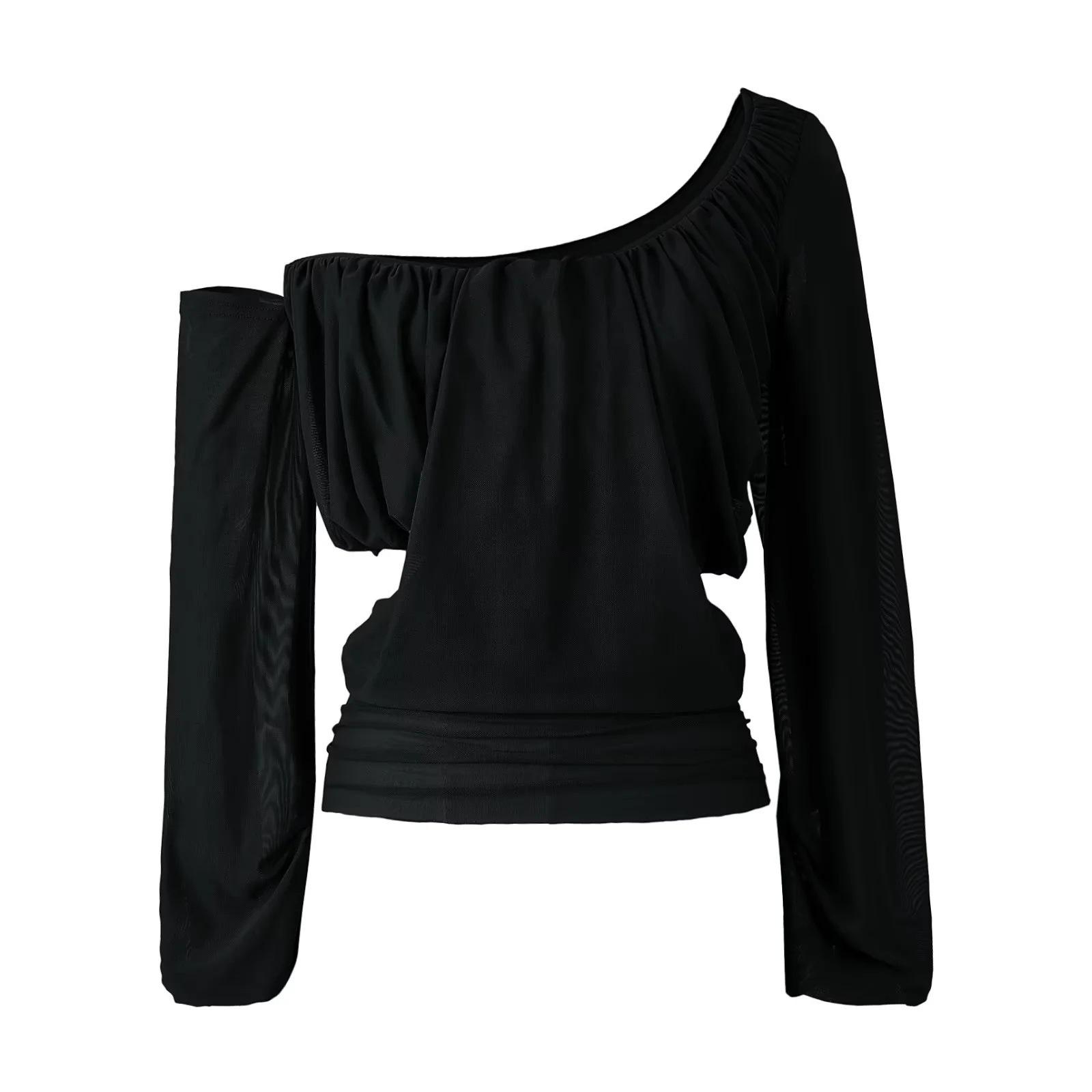 Playera Irregular de Deseo Puro de Un Hombro y Manga Larga para Mujer Verano Malla Patchwork Diseño Fruncido Adelgazante Sentido Top de Chica Caliente