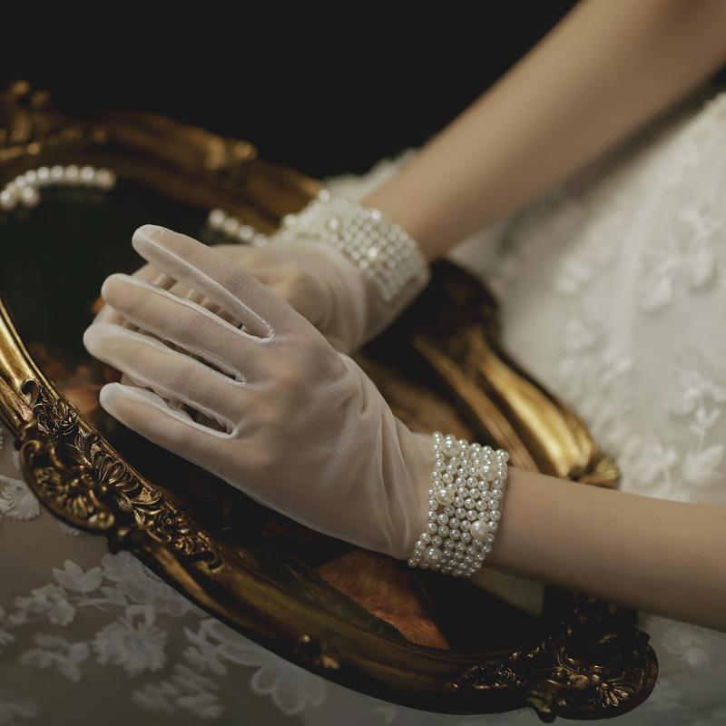 Compra Guantes de Boda para Novia Tul Liso Perlas Cuentas Cortos Dedos Blancos Guantes Foto Actuación al por mayor en Joom.pro