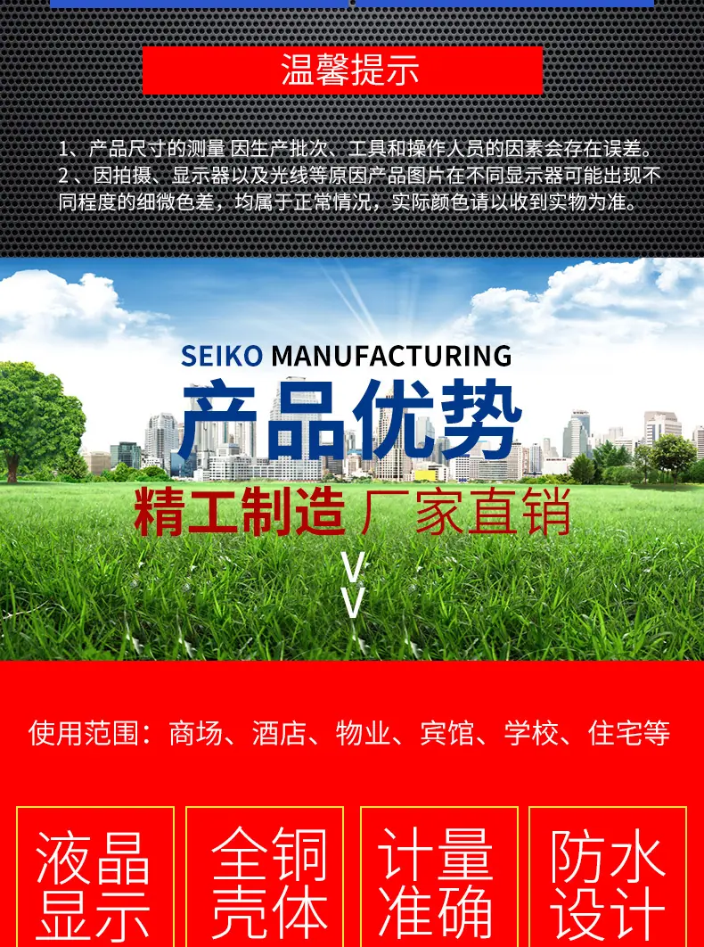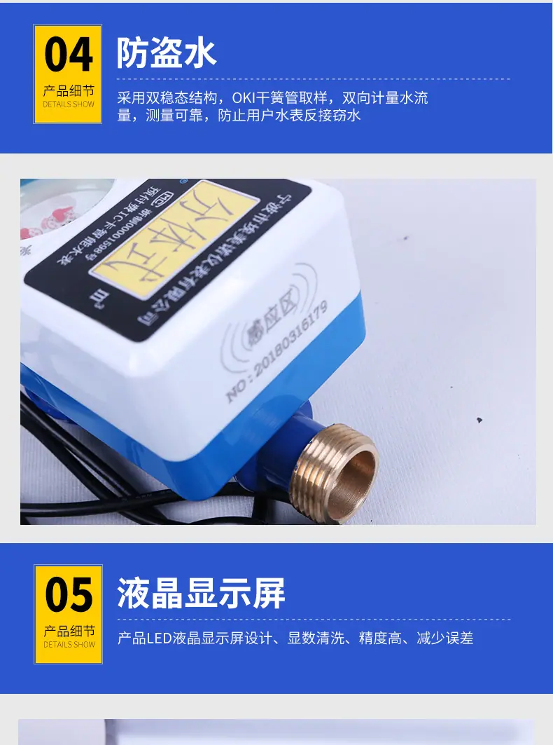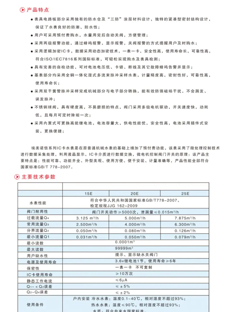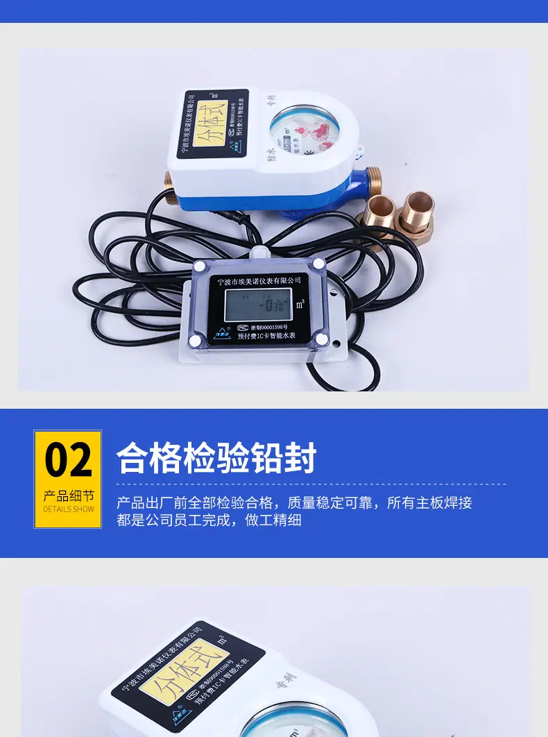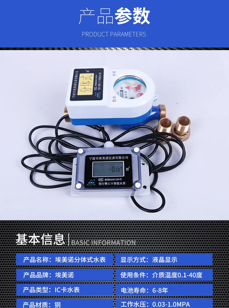 Los productos de nuestra empresa se fabrican de acuerdo con las disposiciones pertinentes de las normas internacionales GB/T778-2007.1-2.3 y las regulaciones nacionales de verificación JJB/62-85: Los medidores de agua de la marca "Aimaike" producidos, con su alta precisión, calidad confiable, variedad completa, embalaje novedoso y larga vida útil, han ganado grandes elogios de la mayoría de los usuarios: Si bien se adhiere al producto principal medidores de agua ordinarios, la empresa ha invertido una gran cantidad de mano de obra y recursos materiales para desarrollar nuevos productos como medidores de agua de transmisión remota, medidores de agua antirrobo y medidores de agua de alta sensibilidad, y también ha desarrollado series de medidores de agua como medidores de agua con tarjeta IC y medidores de agua con tarjeta IC prepago de gran diámetro con tecnología avanzada.