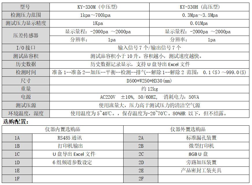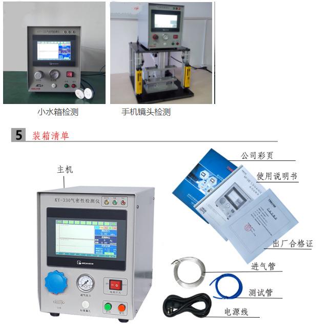 Probador de Hermeticidad KY-330 El Probador de Hermeticidad KY-330 utiliza el principio de diferencia de presión y aire comprimido como medio para probar productos, y es un instrumento de prueba no destructivo. Con su alta precisión y funciones integrales, se utiliza ampliamente para la prueba de sellado de componentes de productos.Campos de aplicación: Aplicado a la prueba de hermeticidad de piezas en la industria automotriz, industria de electrodomésticos, industria médica e industria del embalaje. Tales como: tubos de freno, válvulas de aire, tubos de infusión, fundiciones a presión.