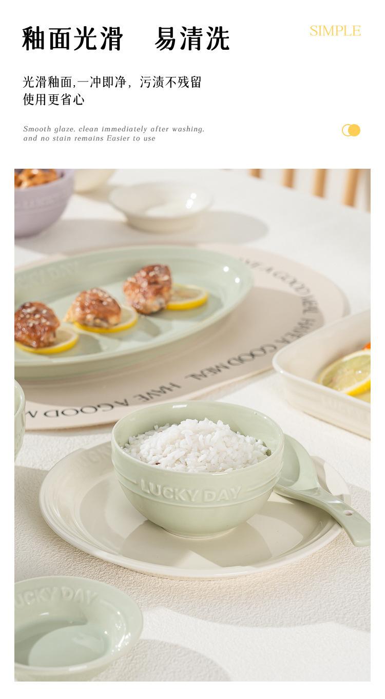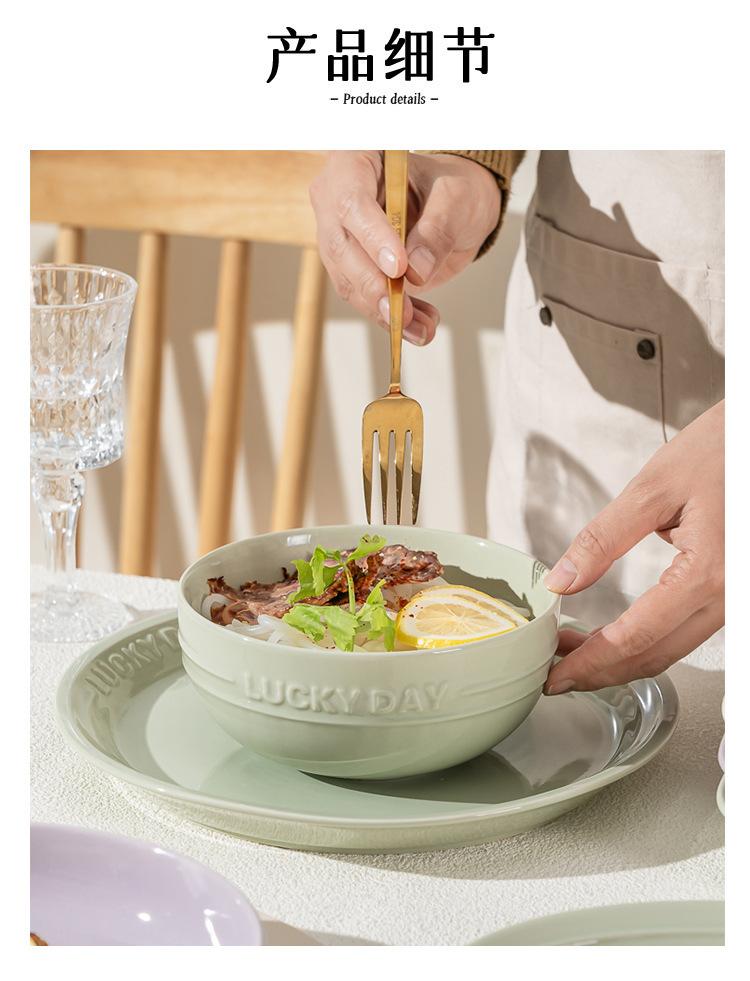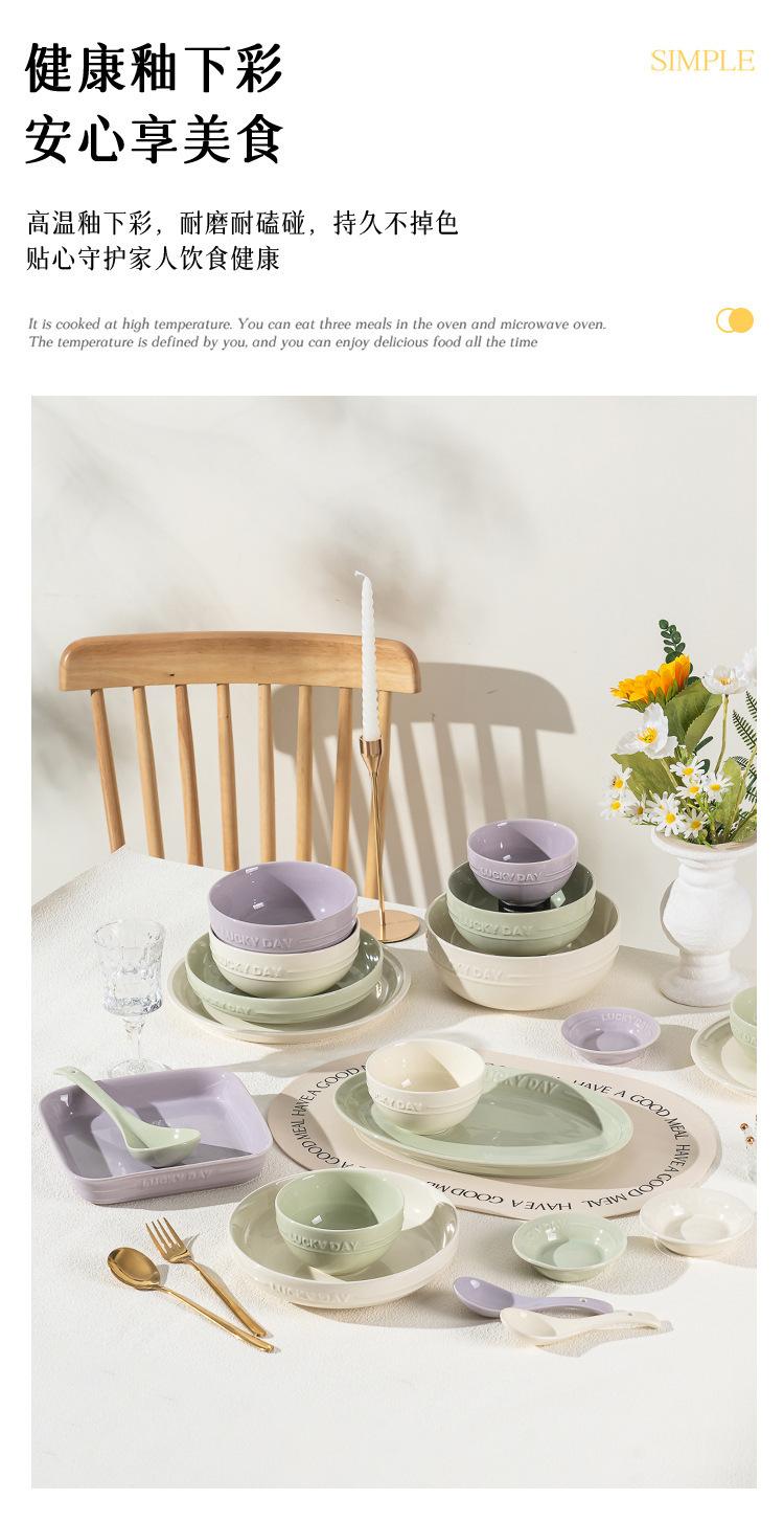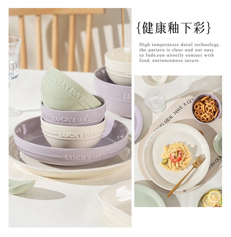 Vajilla de cerámica de color bajo vidriado de estilo japonés para el hogar, tazón de arroz, plato de pescado, plato de condimentos, cuchara, tazón de sopa, letra simple en relieve