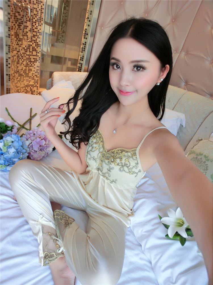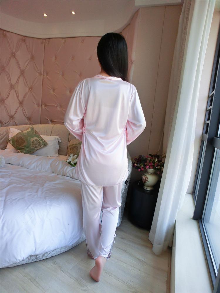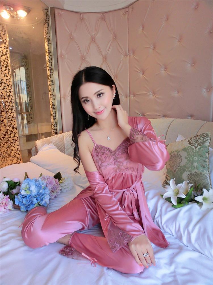 Primavera y Otoño Estilo Caliente Manga Larga Sexy Encaje Seda de Hielo Camisola Conjunto de Tres Piezas Ropa de Casa Pijama Venta al por Mayor Envío Directo