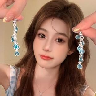 Aretes de Tuerca con Borla de Cristal Azul Súper Flash Retro Dulces Únicos con Temperamento Diseño Nicho de Gama Alta Hacen que la Cara se Vea Más Pequeña Aretes
