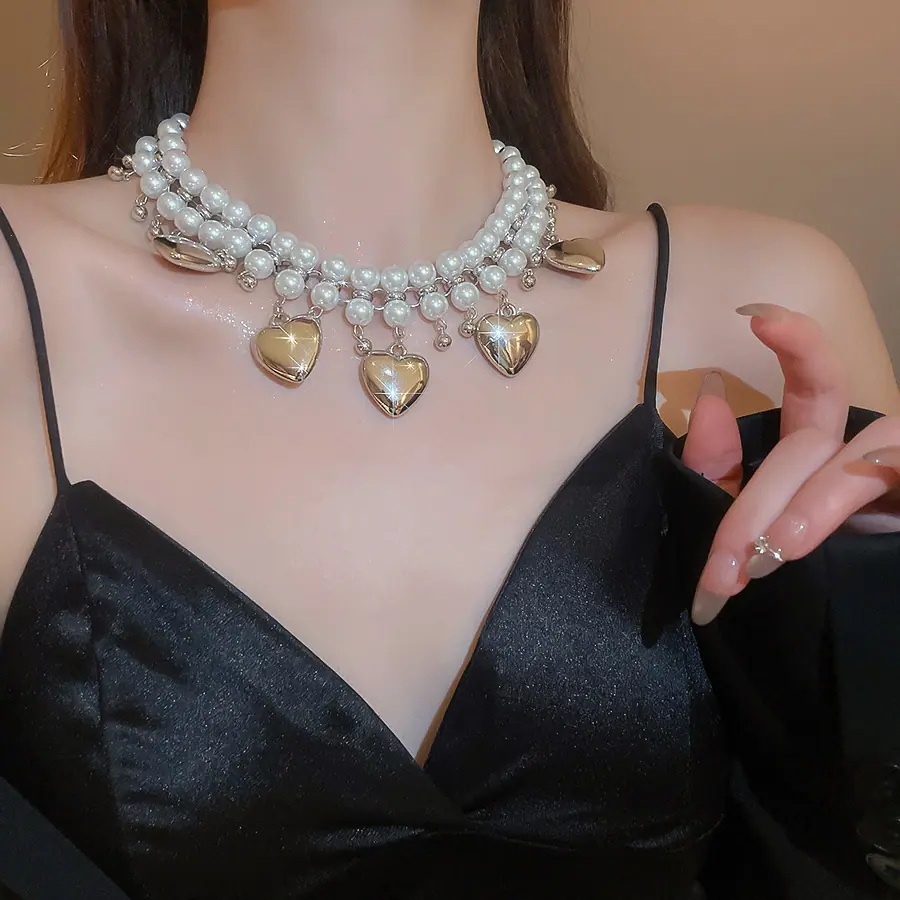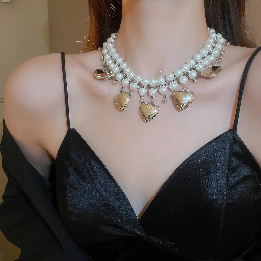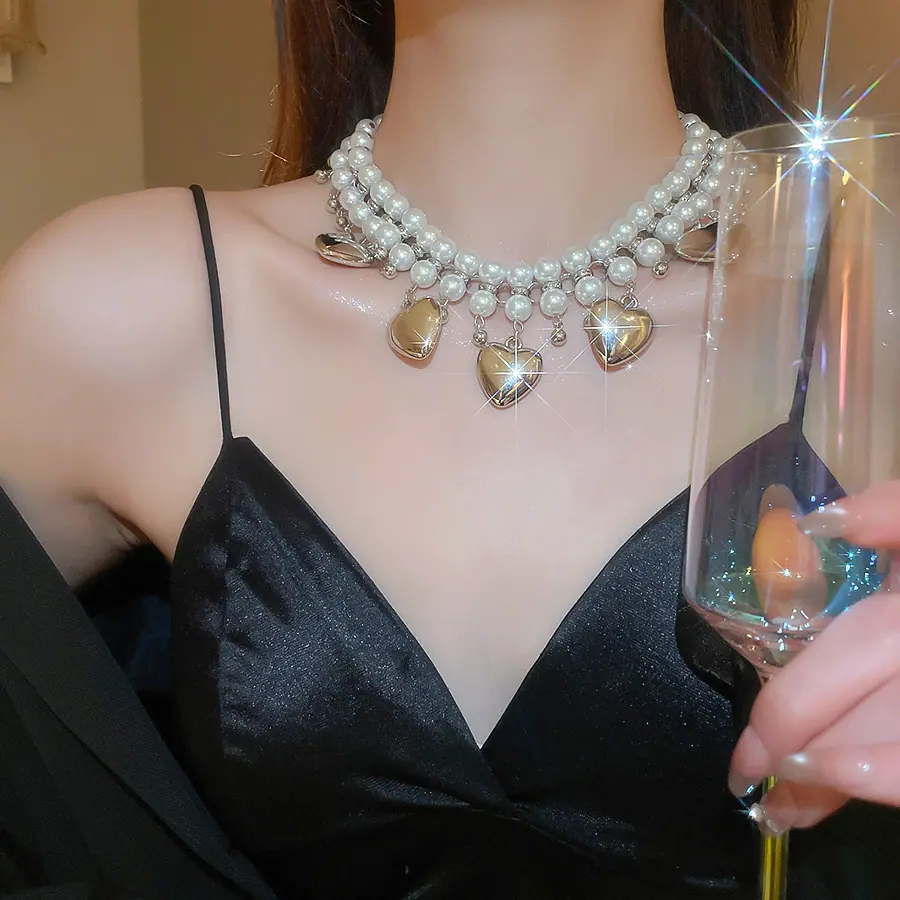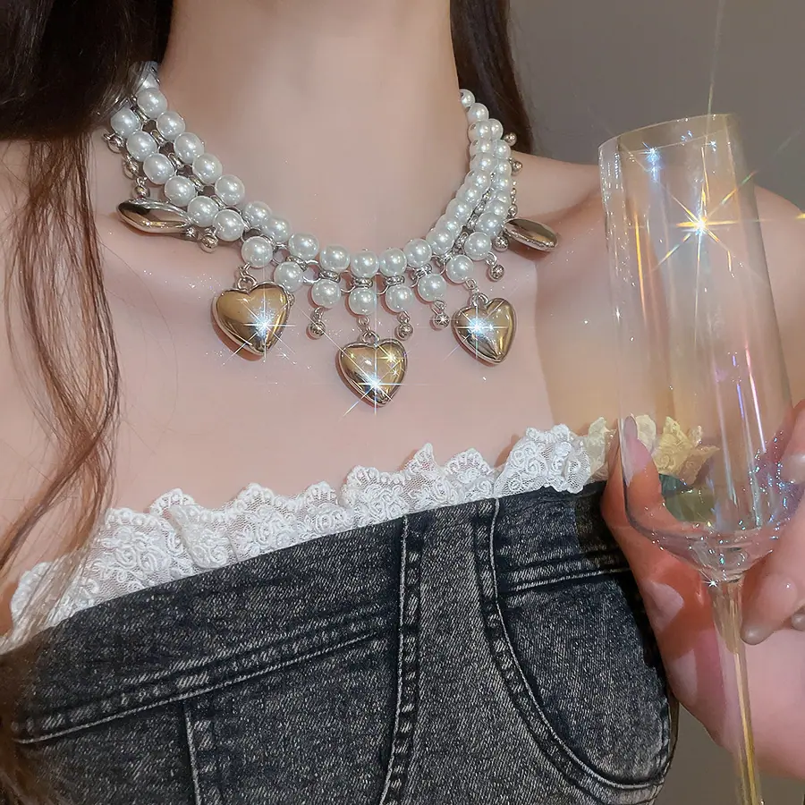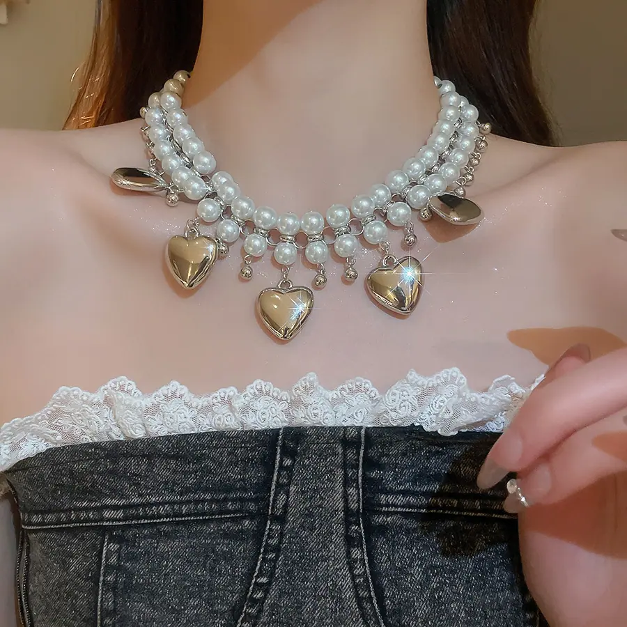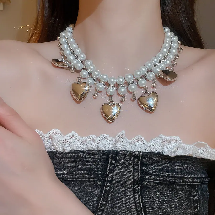 Collar de Perlas de Doble Capa Amor Europeo y Americano Cadena Clavicular de Estilo Frío Retro para Mujer Lujo Ligero de Alto Grado Cadena de Collar Elegante