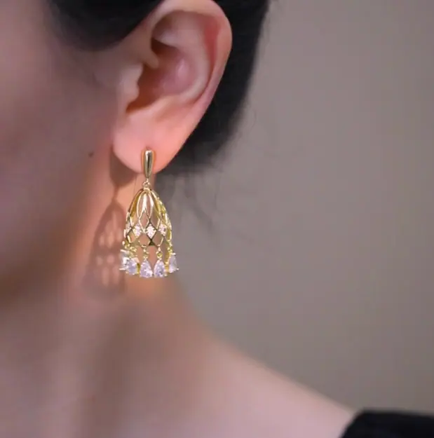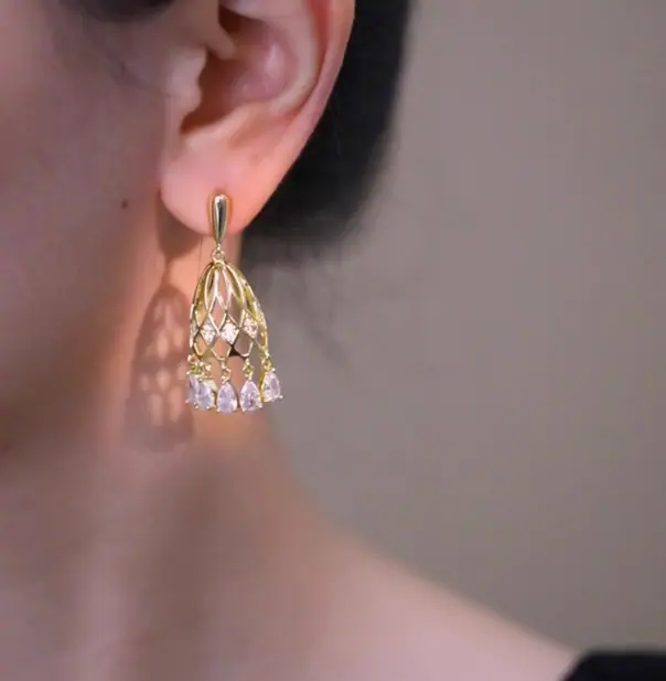 Pendientes de tuerca de malla tejida con incrustaciones de pedrería con sentido del diseño, pendientes cortos versátiles, moda, lujo ligero, exquisitos, con borla, temperamento de personalidad, joyería para la oreja de mujer