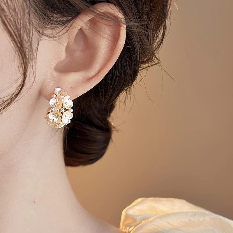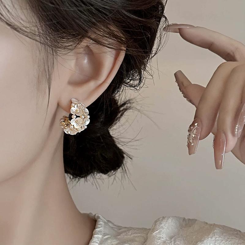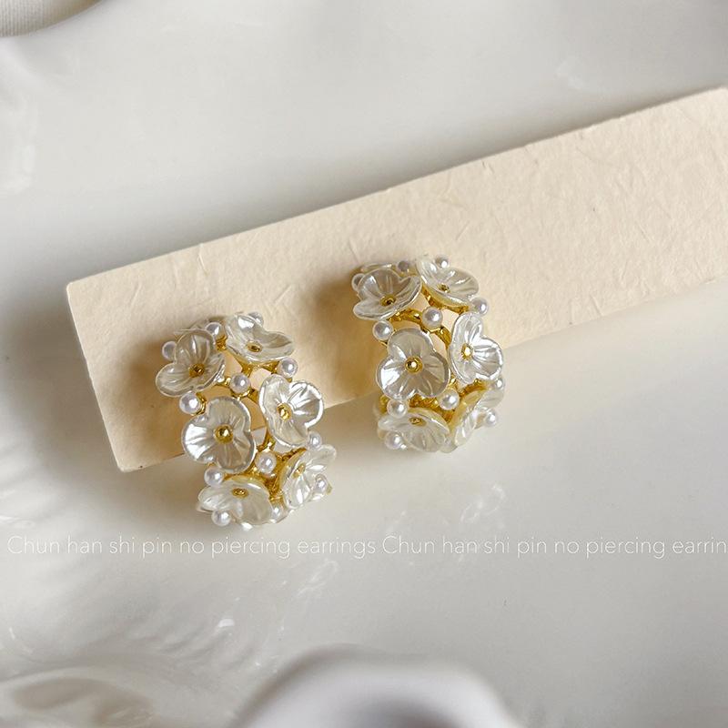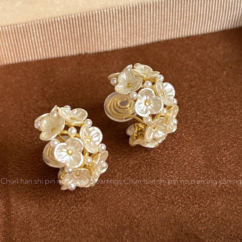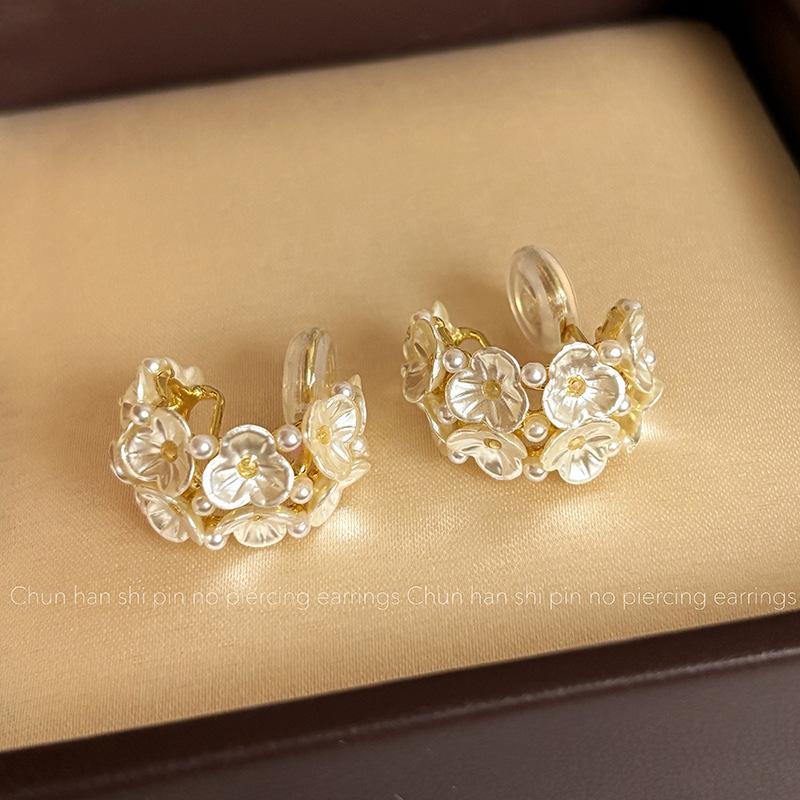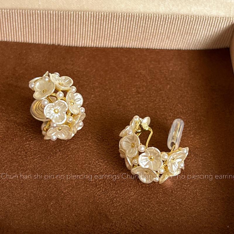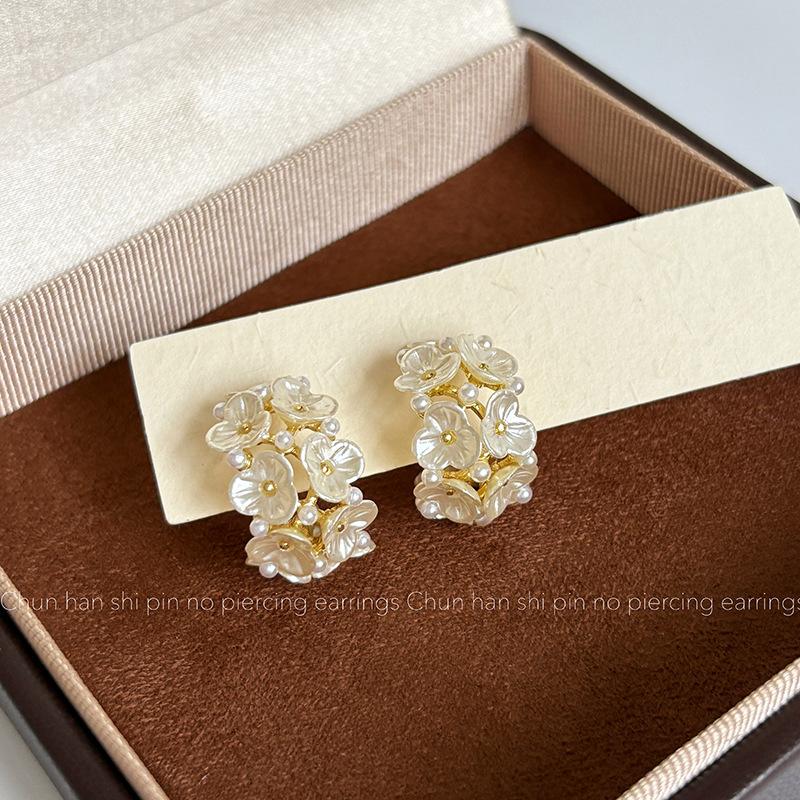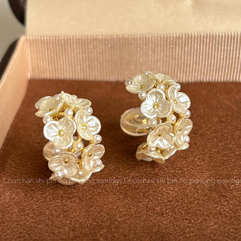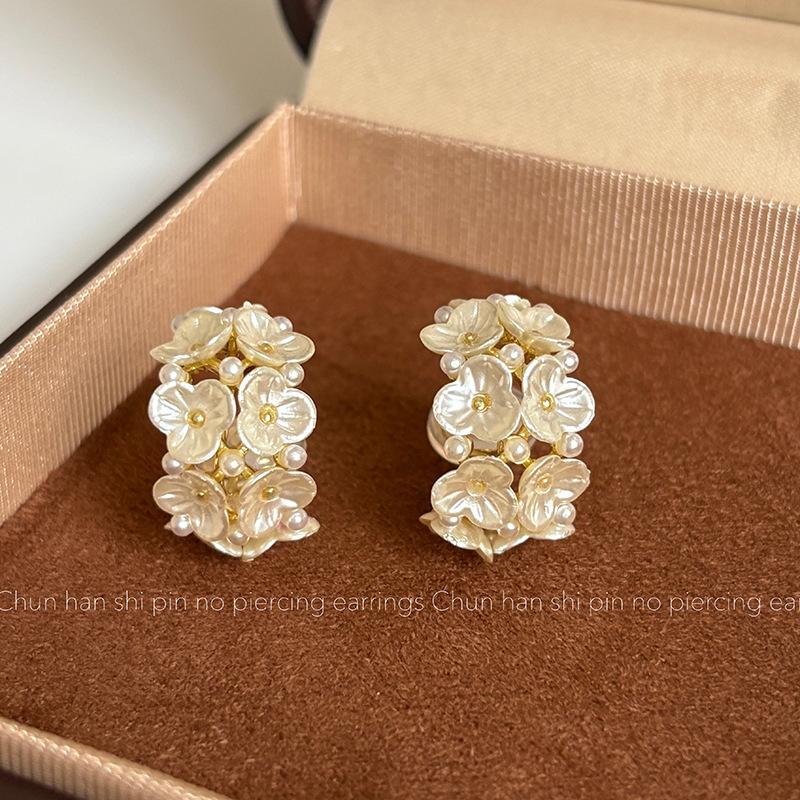 Hermosos Aretes de Flor de Concha Sentido Retro Francés de Alta Gama Clip para Oreja con Plato para Incienso de Mosquitos Sin Agujeros en las Orejas Aretes Lindos Elegantes para Mujer