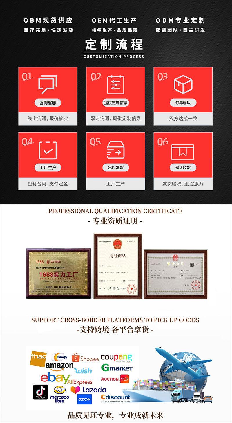 Nuestra fábrica se especializa en la venta al por mayor de joyería, producción en masa y procesamiento manual. Los diferentes lotes de productos pueden presentar ligeras diferencias, y es inevitable que se produzcan defectos menores (que no afectan las ventas). Se recomienda tomar muestras primero. Todos deben entender que lo que pagas es lo que obtienes. No te fíes de tu propia imaginación. La imaginación de cada uno es infinita. No podemos satisfacer esto, ¡disculpa! Si eres muy exigente con la calidad, ¡visita el mostrador para comprar!