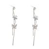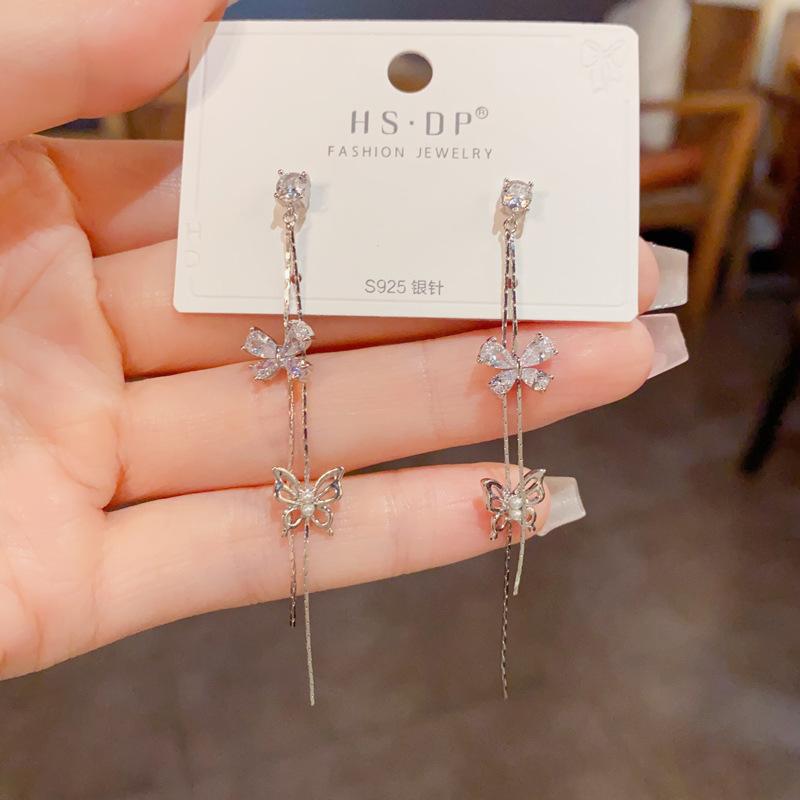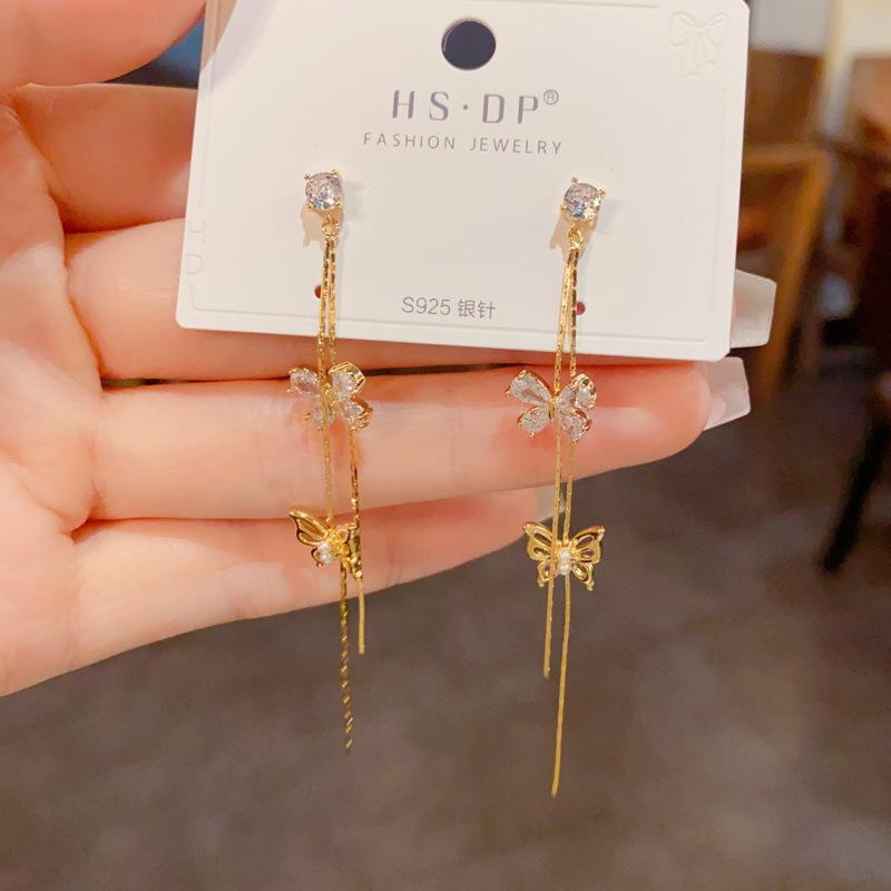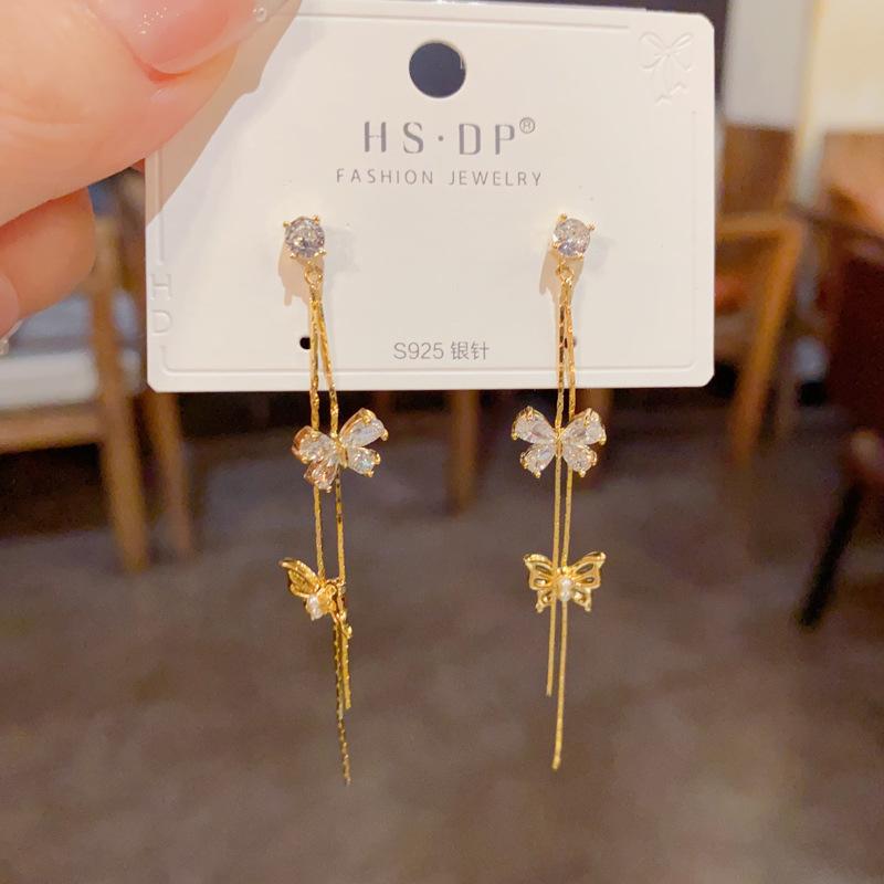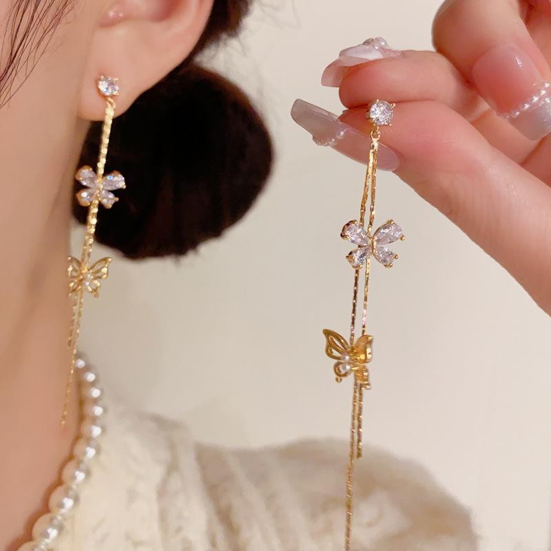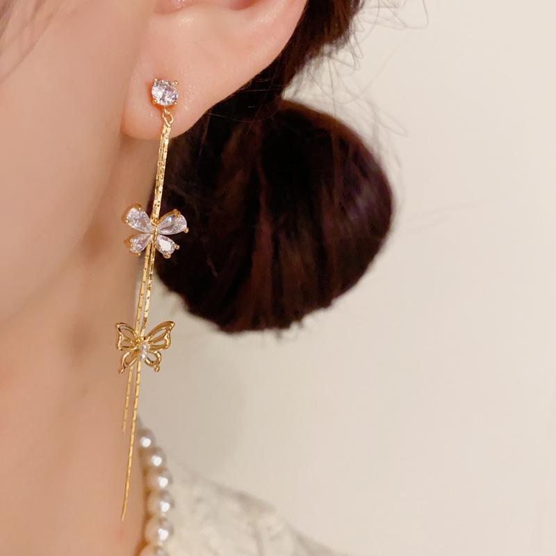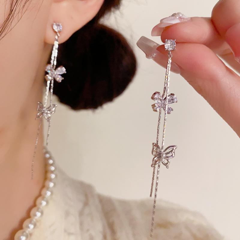 Silver-zircon butterfly long tassel earrings (thick real gold plating)