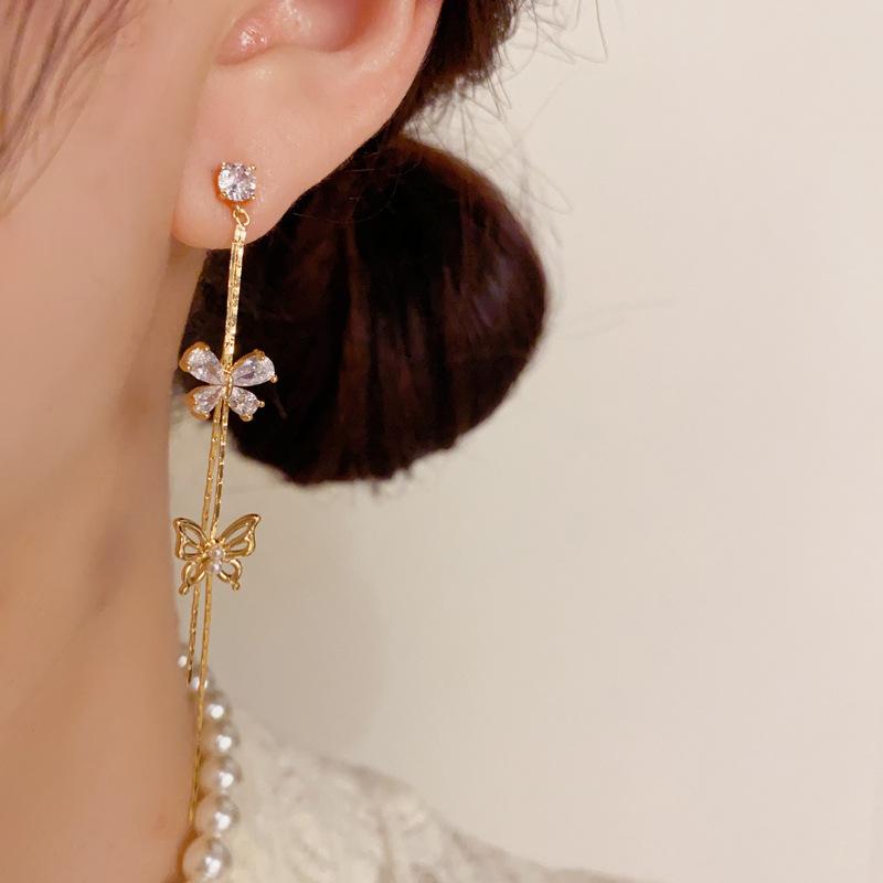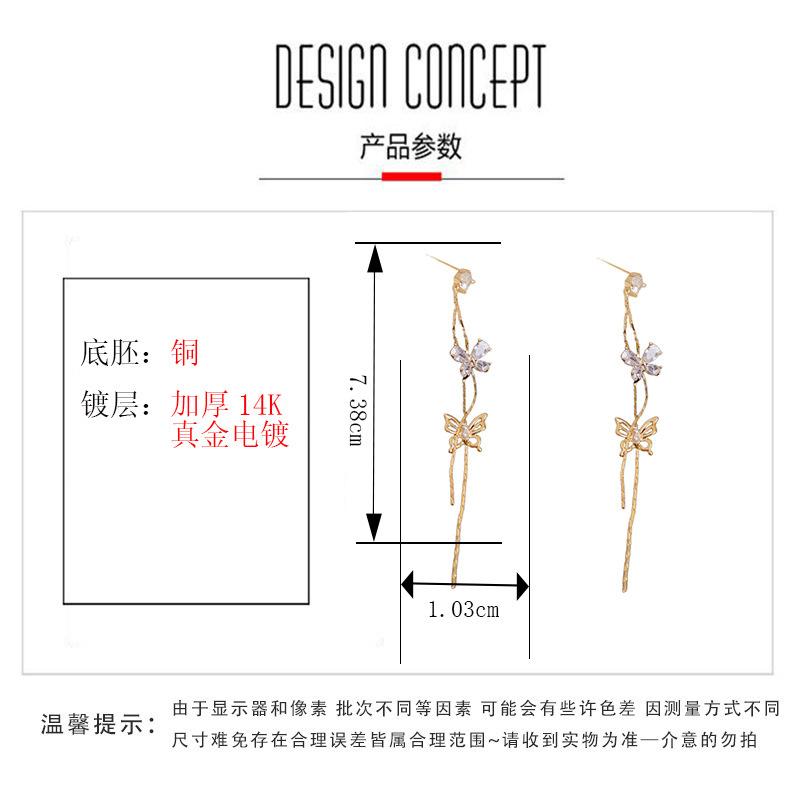 Gold-zircon butterfly long tassel earrings (thick real gold plating), Silver-zircon butterfly long tassel earr...