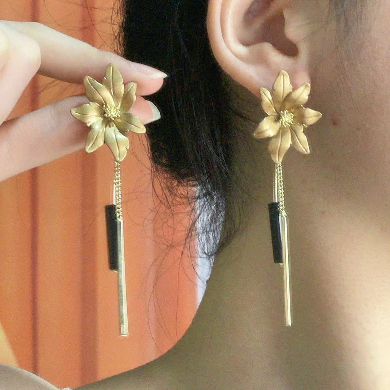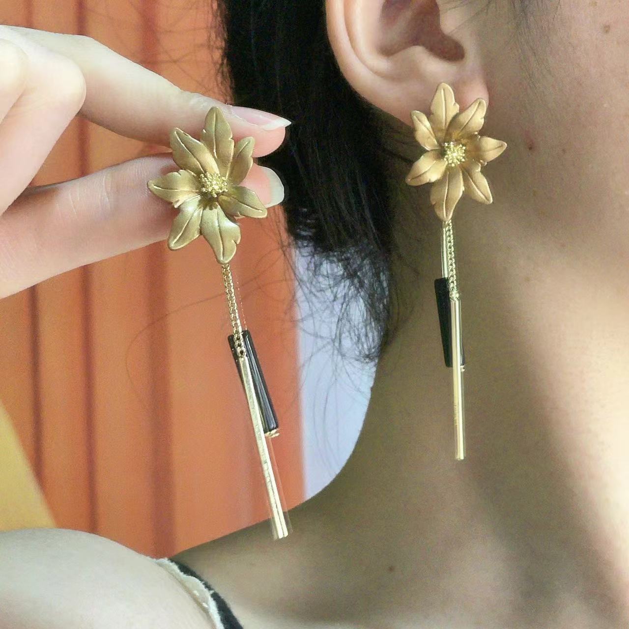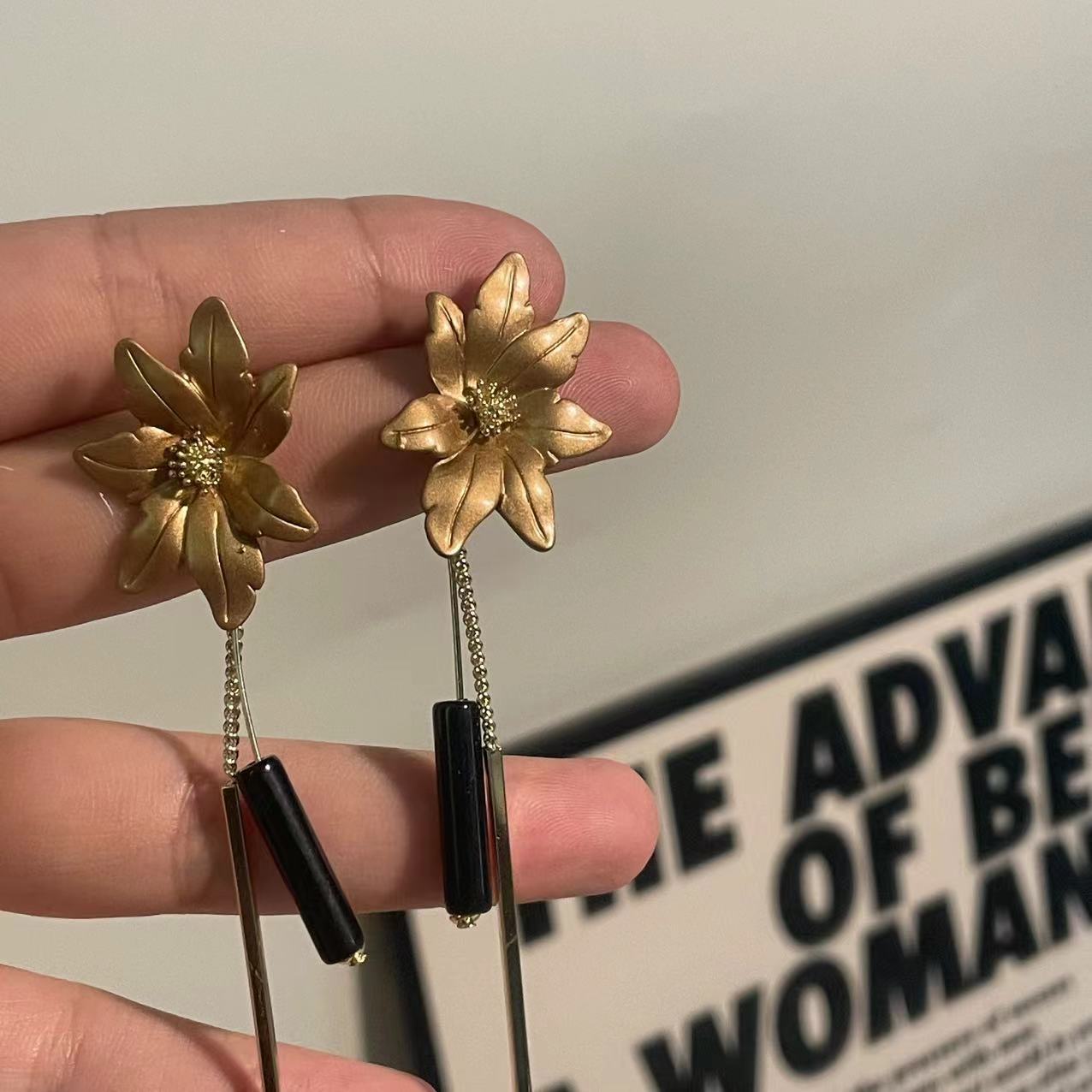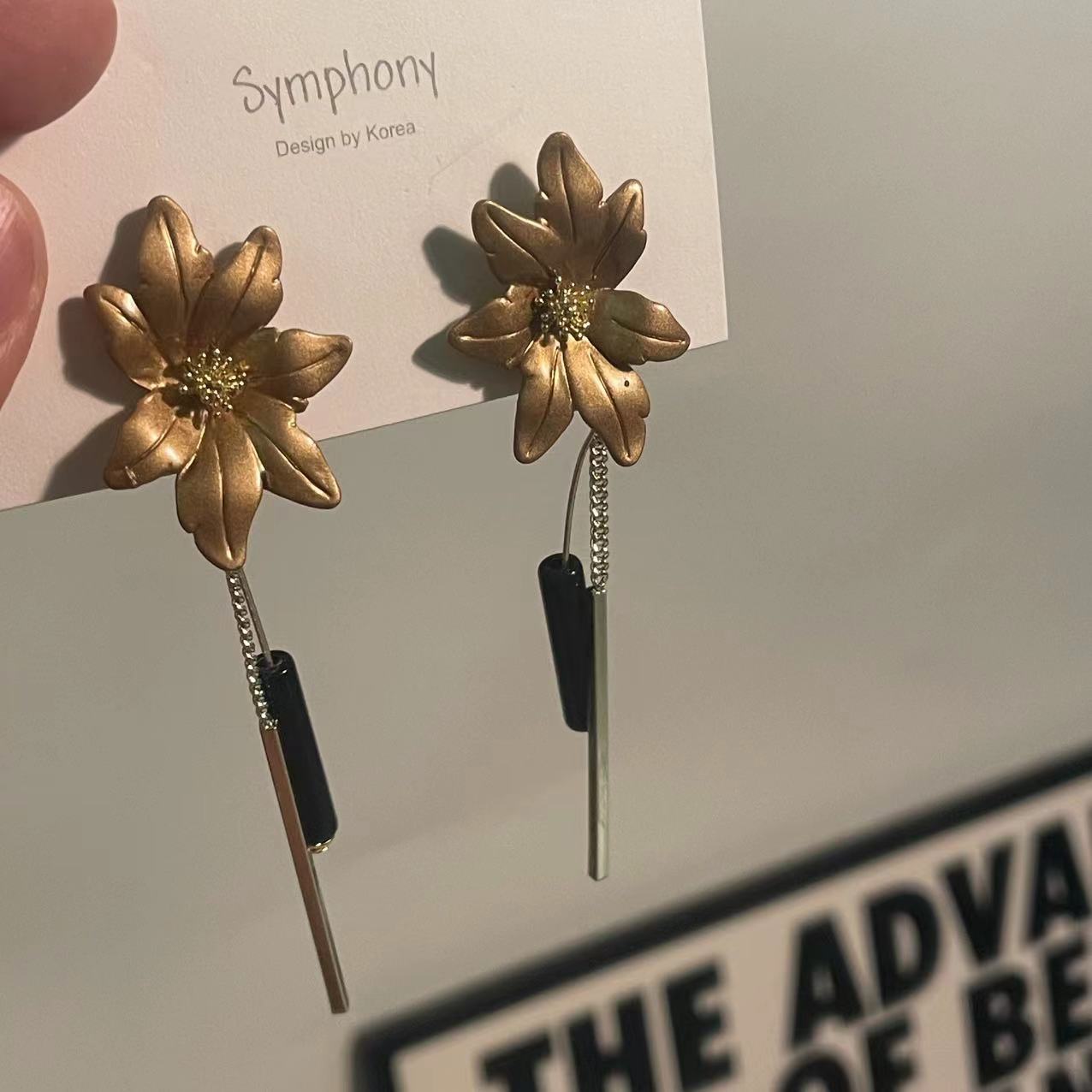Aretes Retro Franceses Dorados Artísticos de Flor con Borla Larga Diseño Nicho de Lujo Ligero Aretes de Temperamento