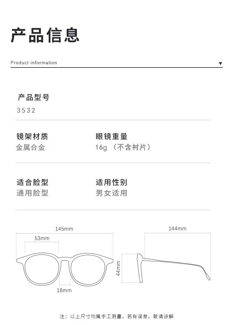 Ancho de lente 53mm, distancia del puente 18mm, longitud de varilla 144mm