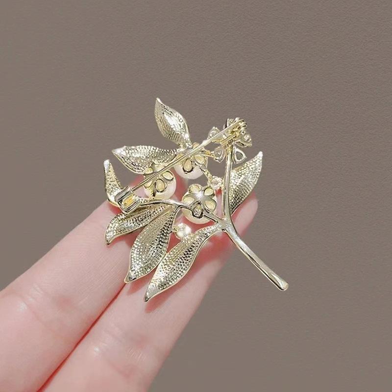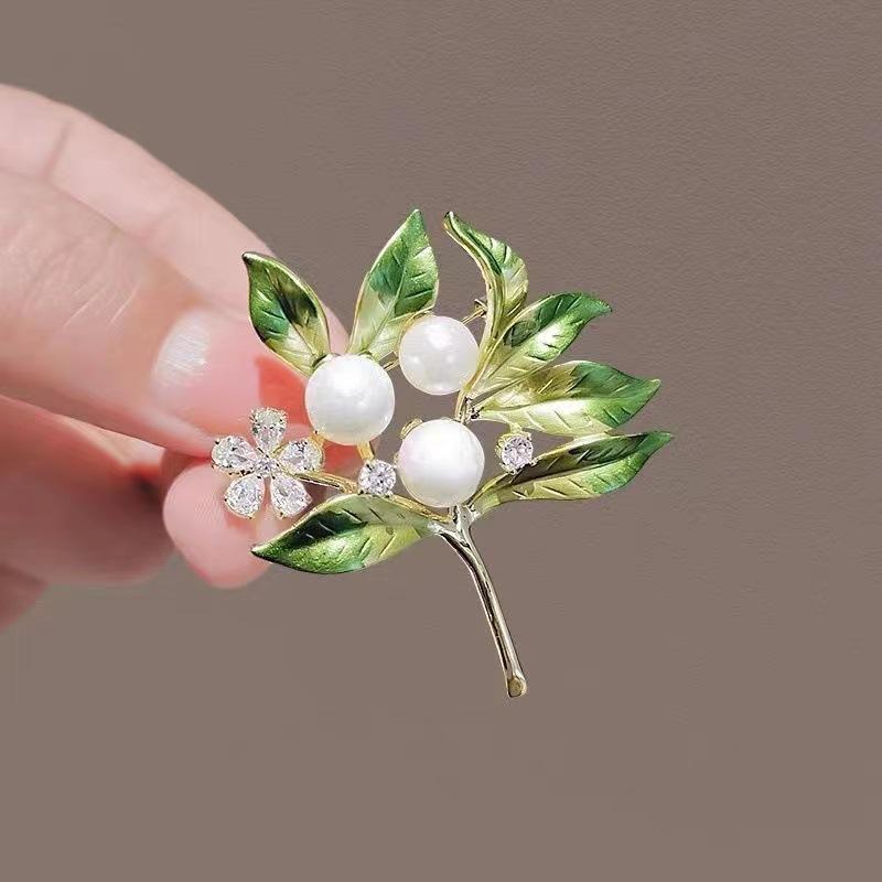 2023 nueva moda Broche de perla hoja verde fresca gardenia pin accesorios fijos de traje elegante de alta gama