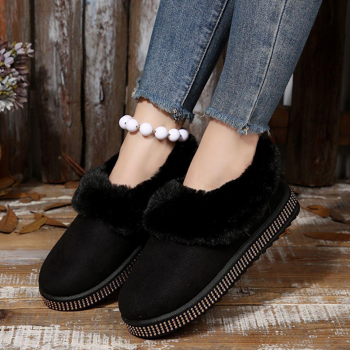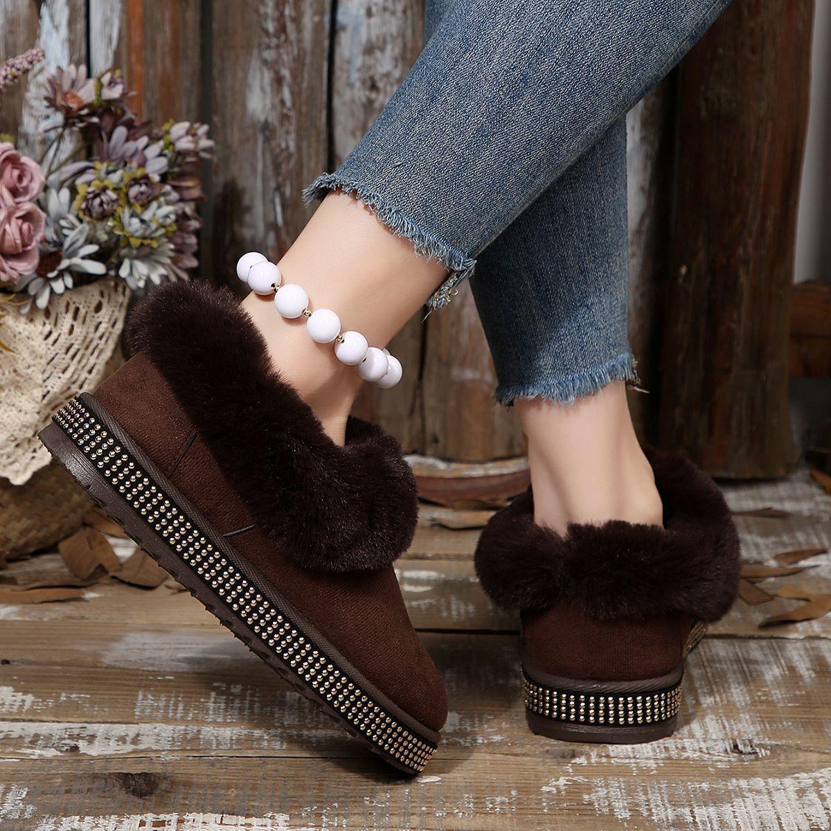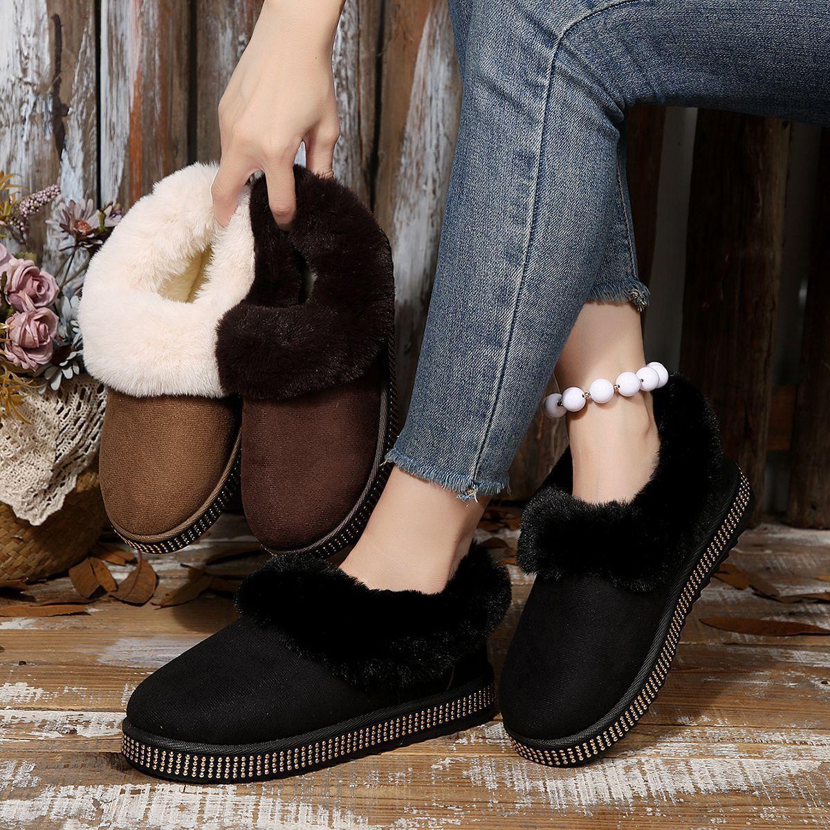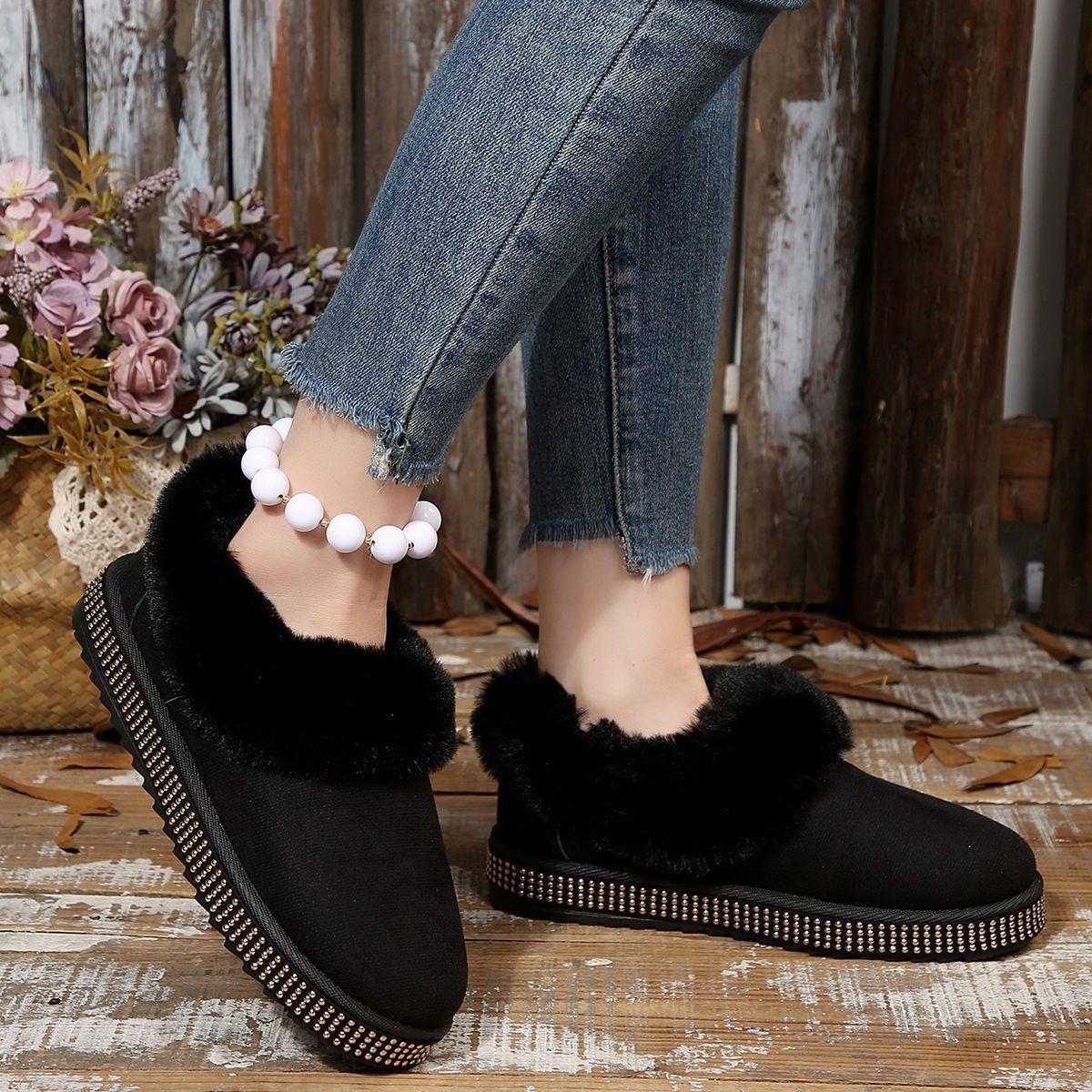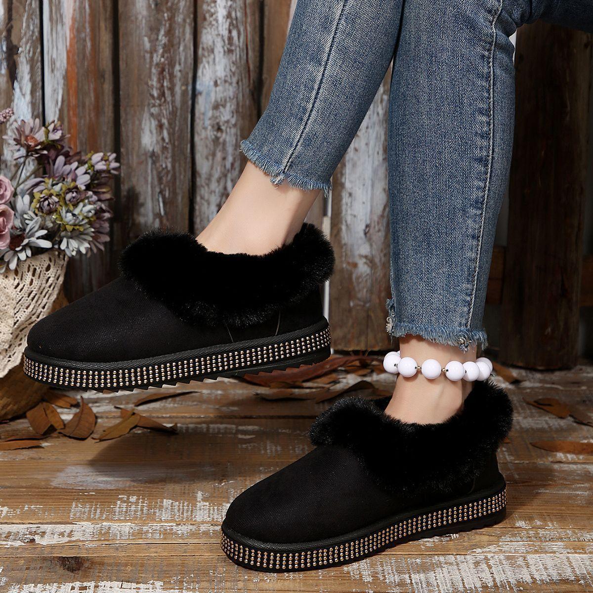 2025 Comercio Exterior Talla Grande Invierno Peludo Boca Punta Redonda Slip-on Decoración de Pedrería Suela Gruesa Forro Polar Engrosado Cálido Botas de Nieve