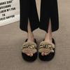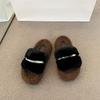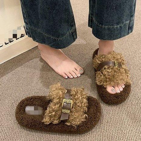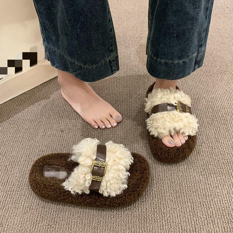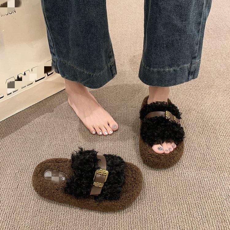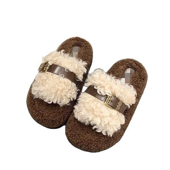 2025 Nueva Moda Pantuflas de Suela Gruesa para Mujer para Exterior Otoño e Invierno Peludas con Hebilla Rojo de Red para Casa Algodón